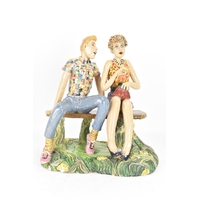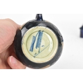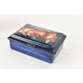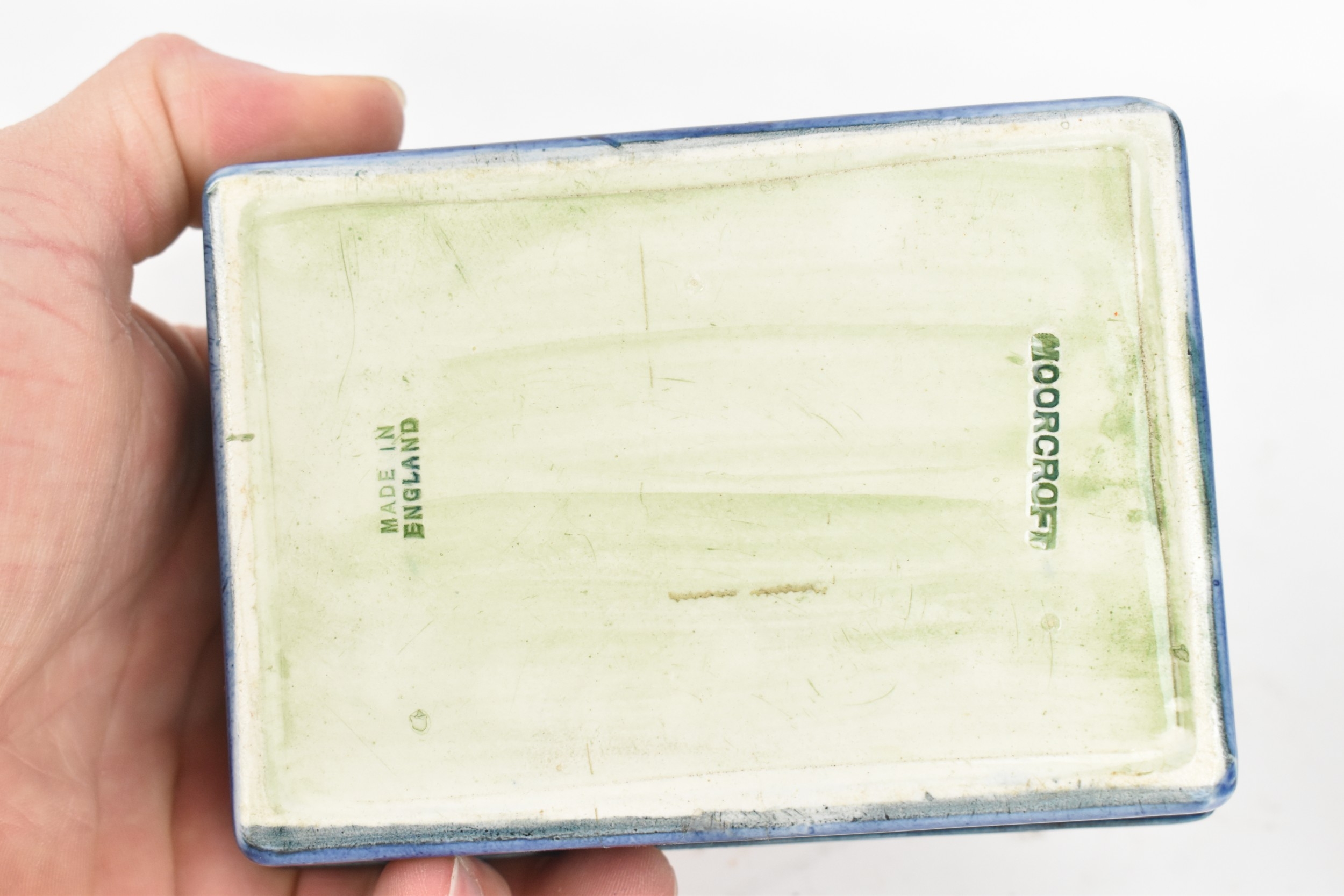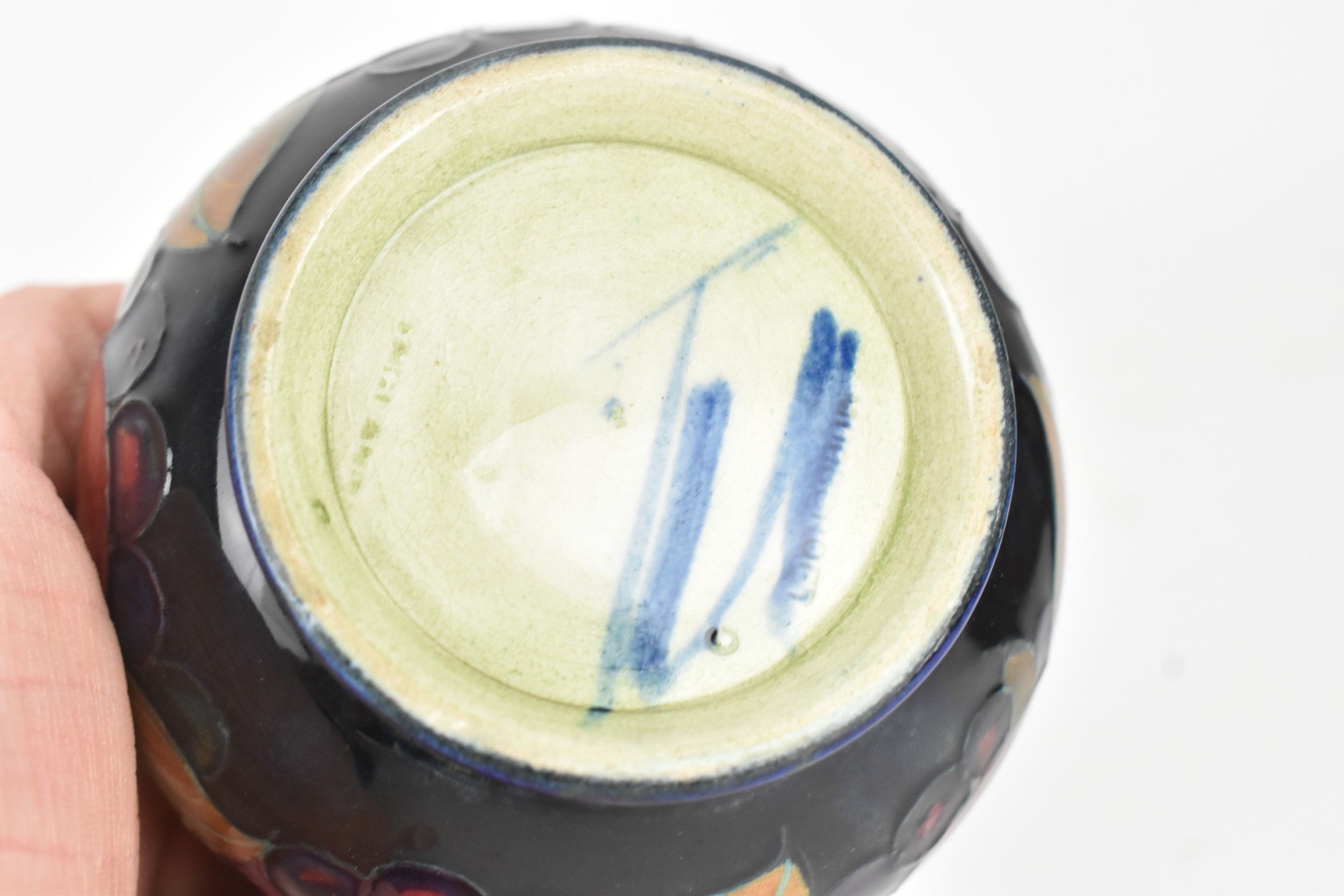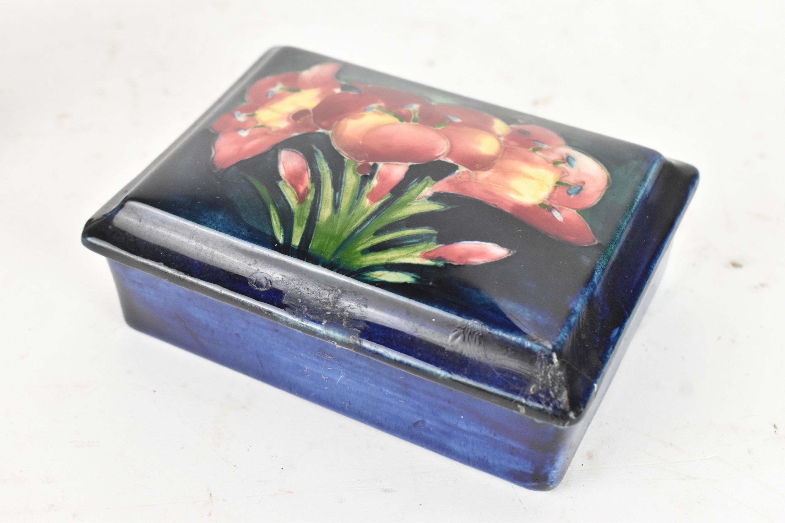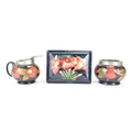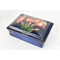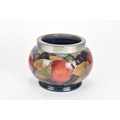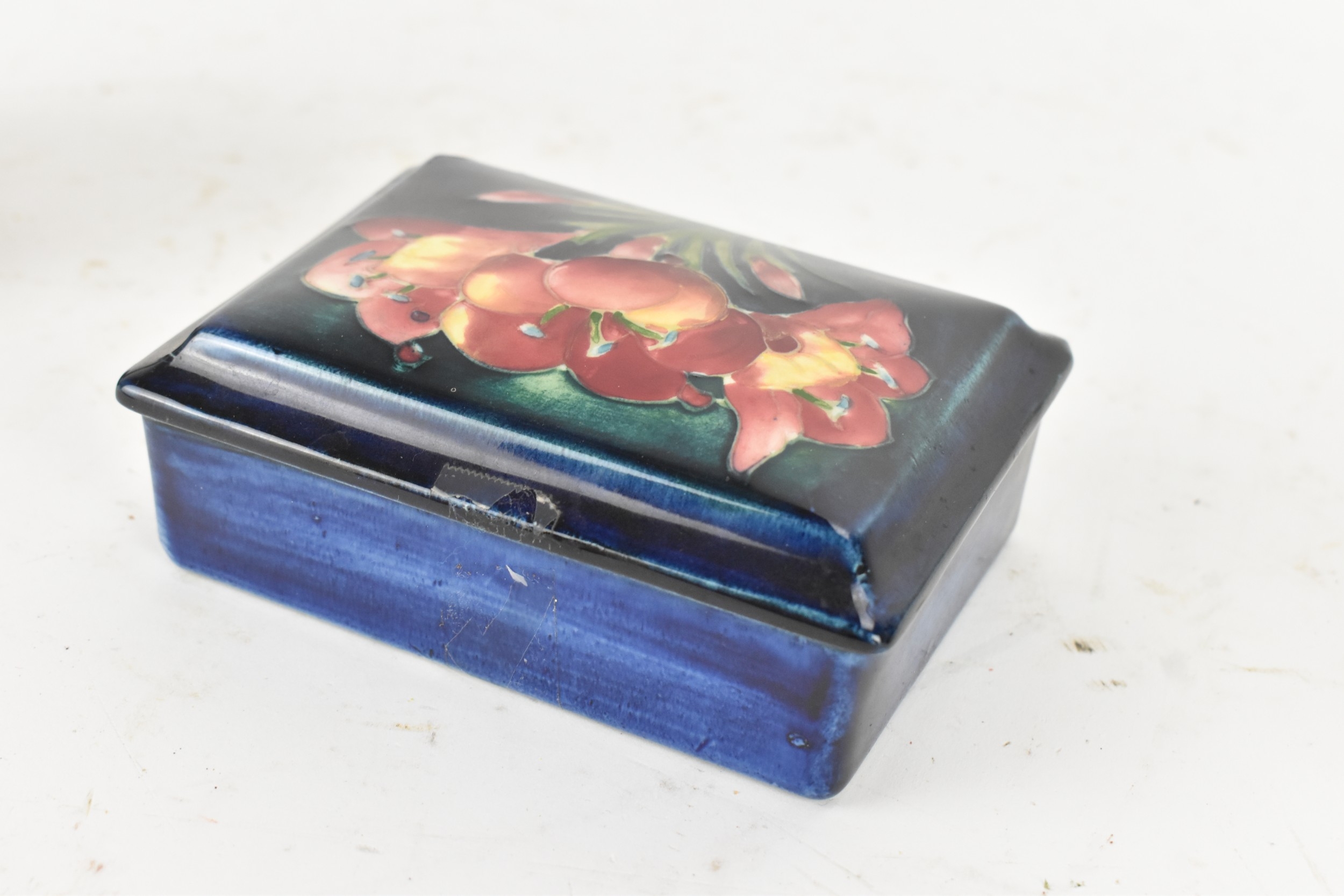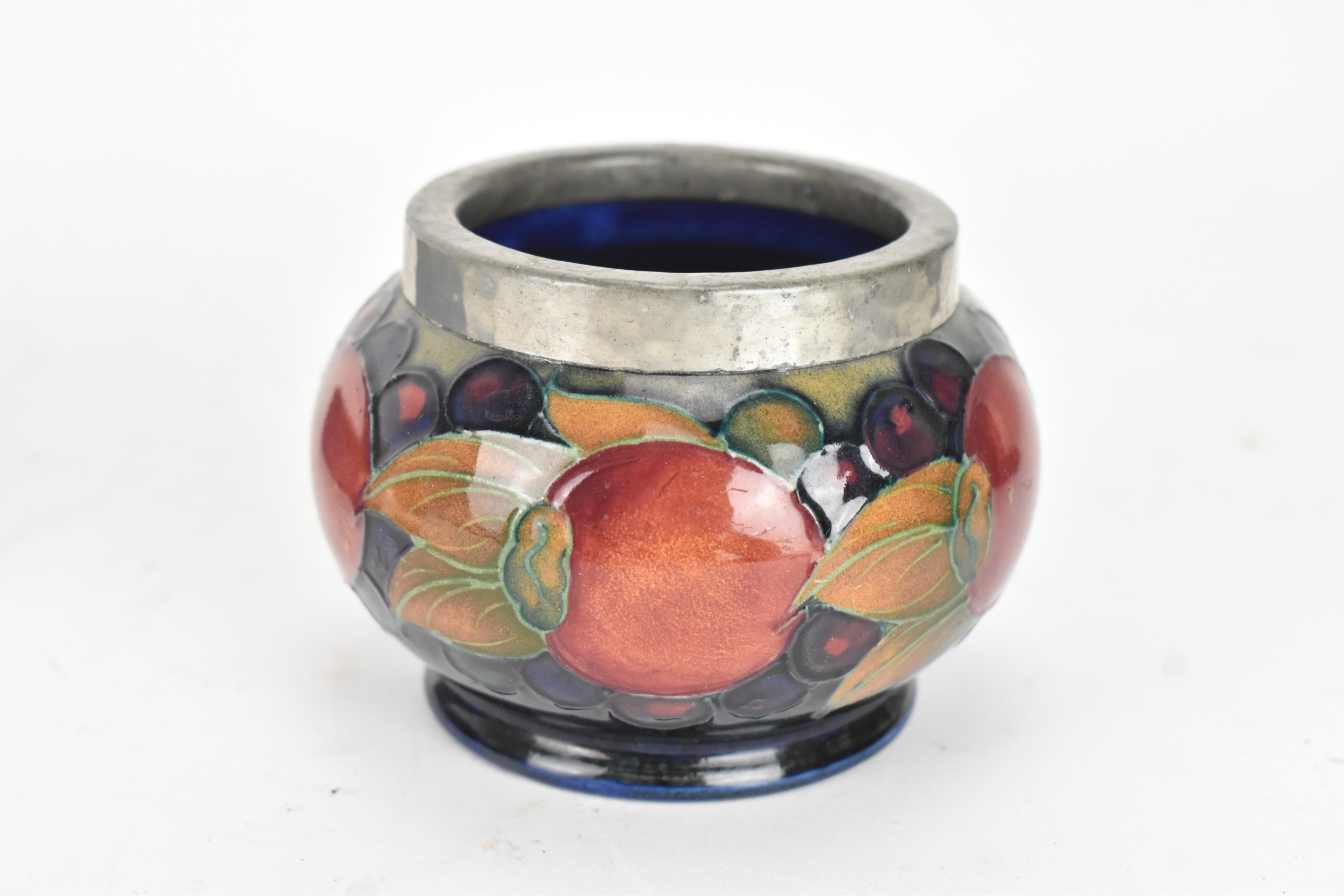 A group of early/mid 20th century Moorcroft pottery to include a 'pomegranate' patter pewter mounted milk jug 7.2cm high, and a sugar bowl 6.5cm high, together with a lidded box 5cm high x 12cm wide, each tubelined with fruit and floral motifs on cobalt blue grounds, impressed and painted Moorcroft marks to bases