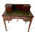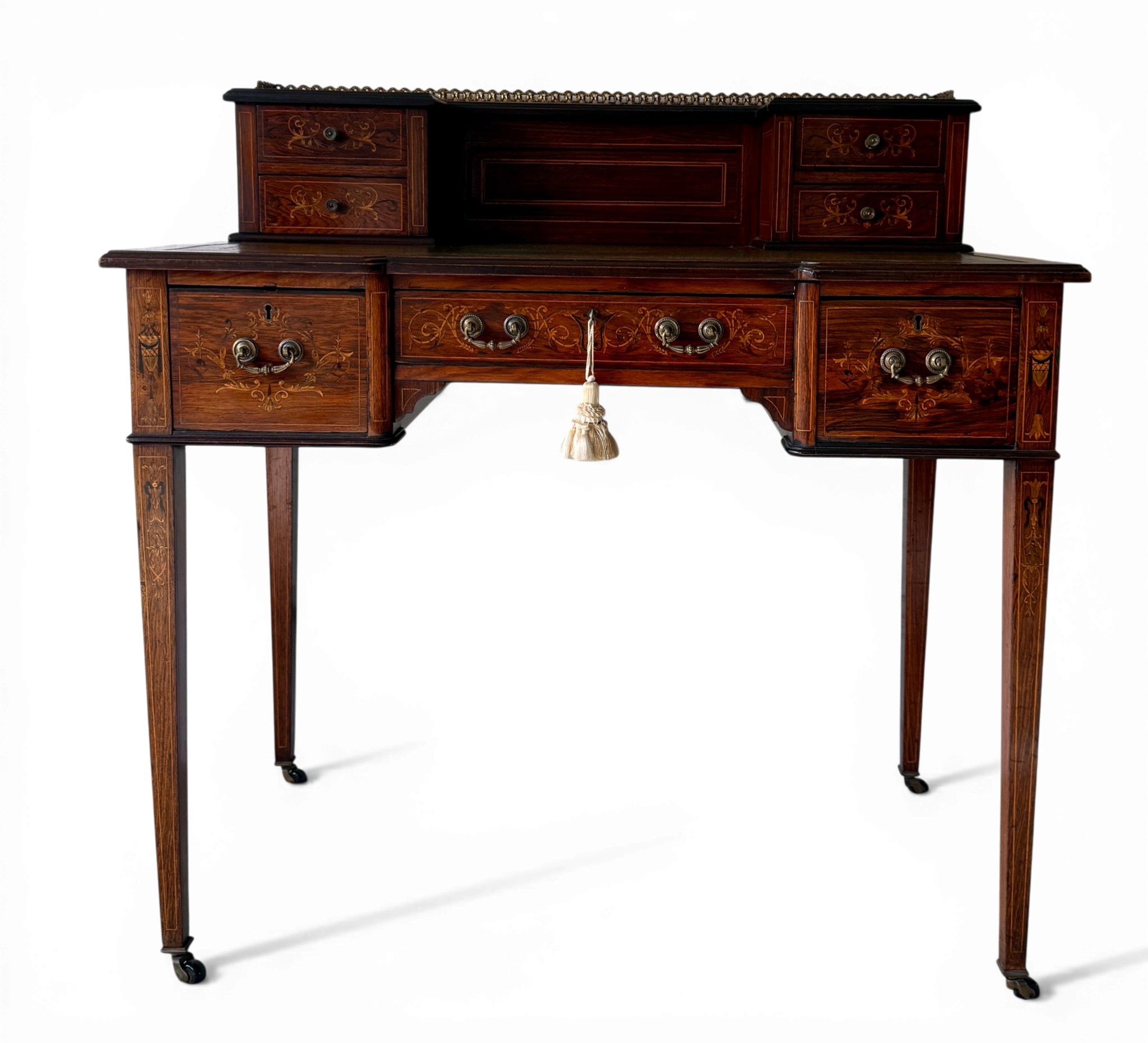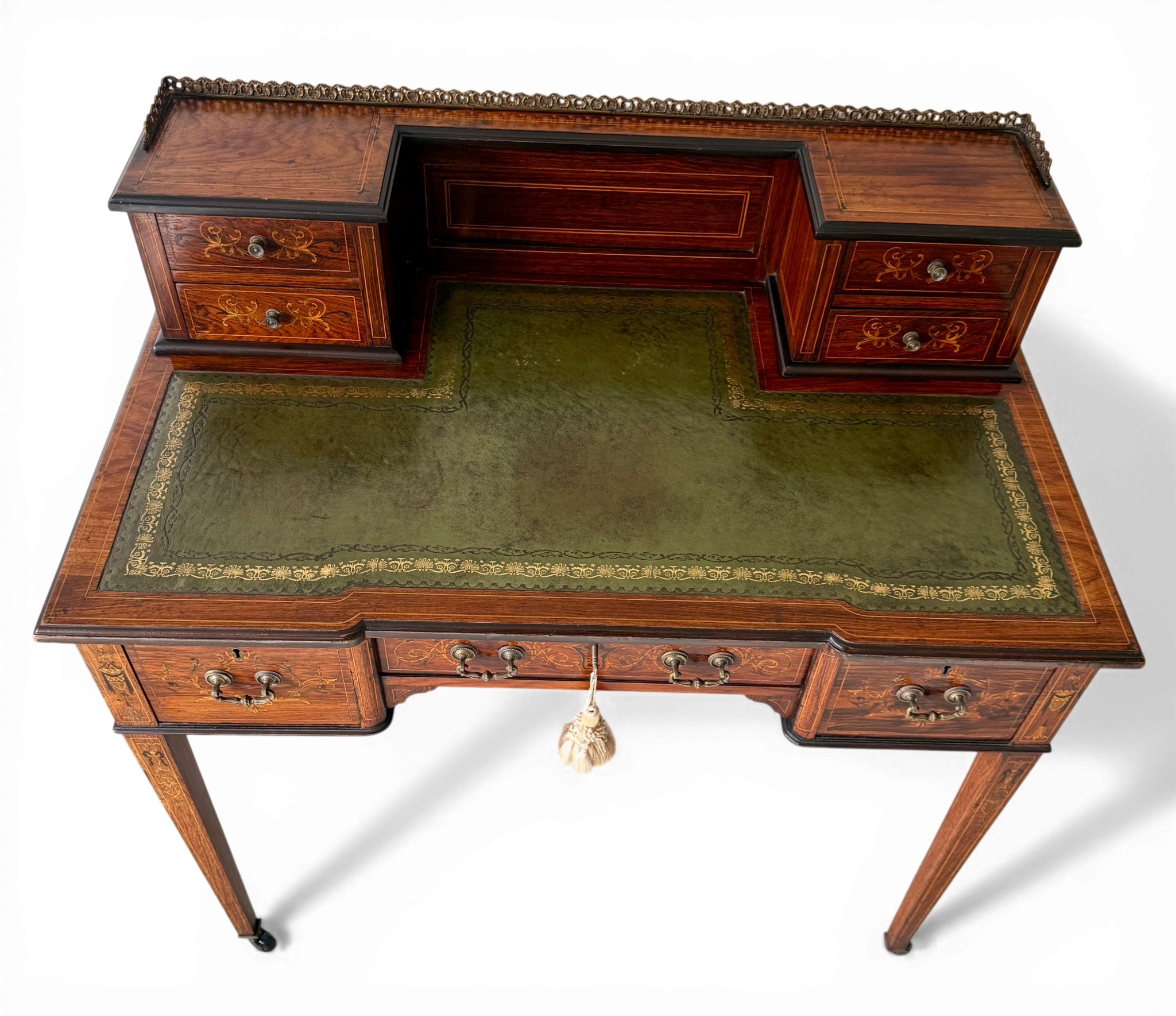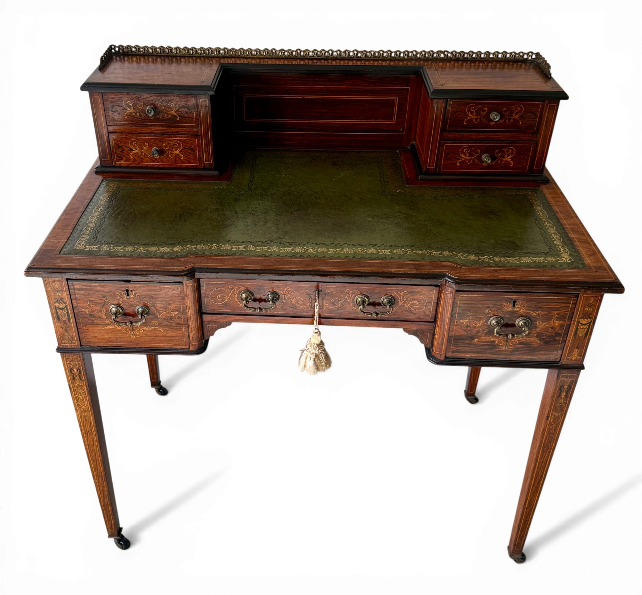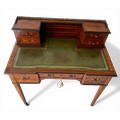 Edwardian inlaid rosewood escritoire with tooled leather surface. 91 w x 53 d x 93cm h.