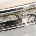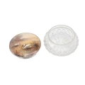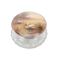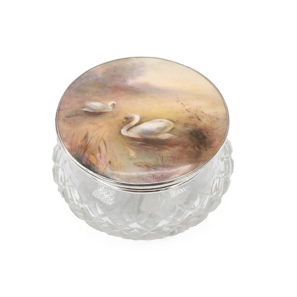 James Stinton, probably for Royal Worcester, a crystal glass powder jar with hallmarked silver (Birmingham 1929) and hand painted ceramic lid, decorated with two swans on a lake, signed 'Jas Stinton'. (Almost certainly Royal Worcester but any marks are hidden behind the silver mount. Diameter 10cm, height 6cm.