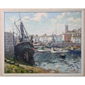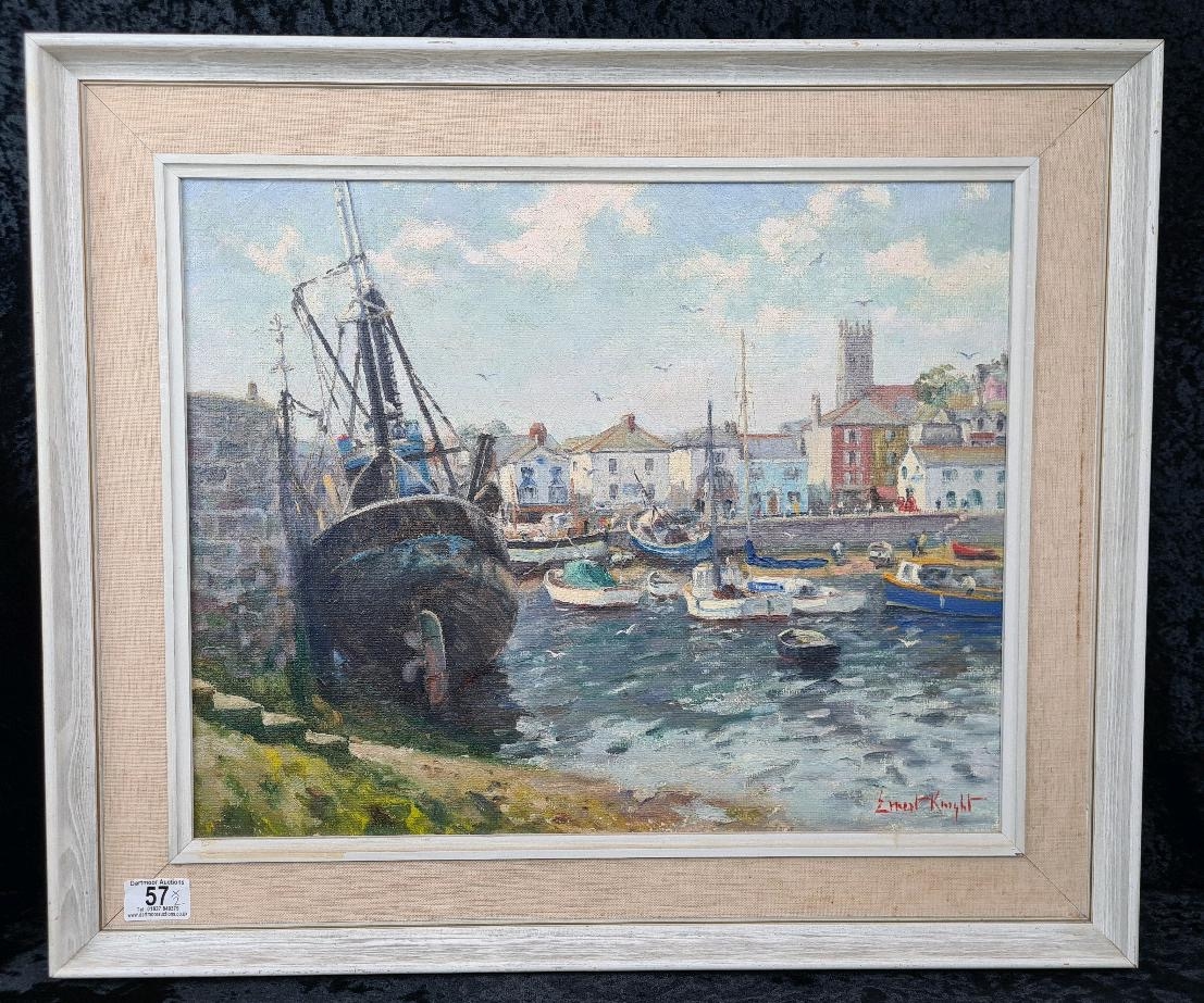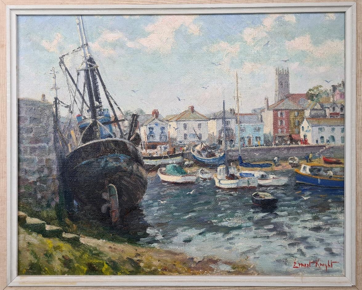Fantastic original oil painting of Brixham Inner Harbour by the West Country artist Ernest Knight. Frame approx H54cm x W64cm