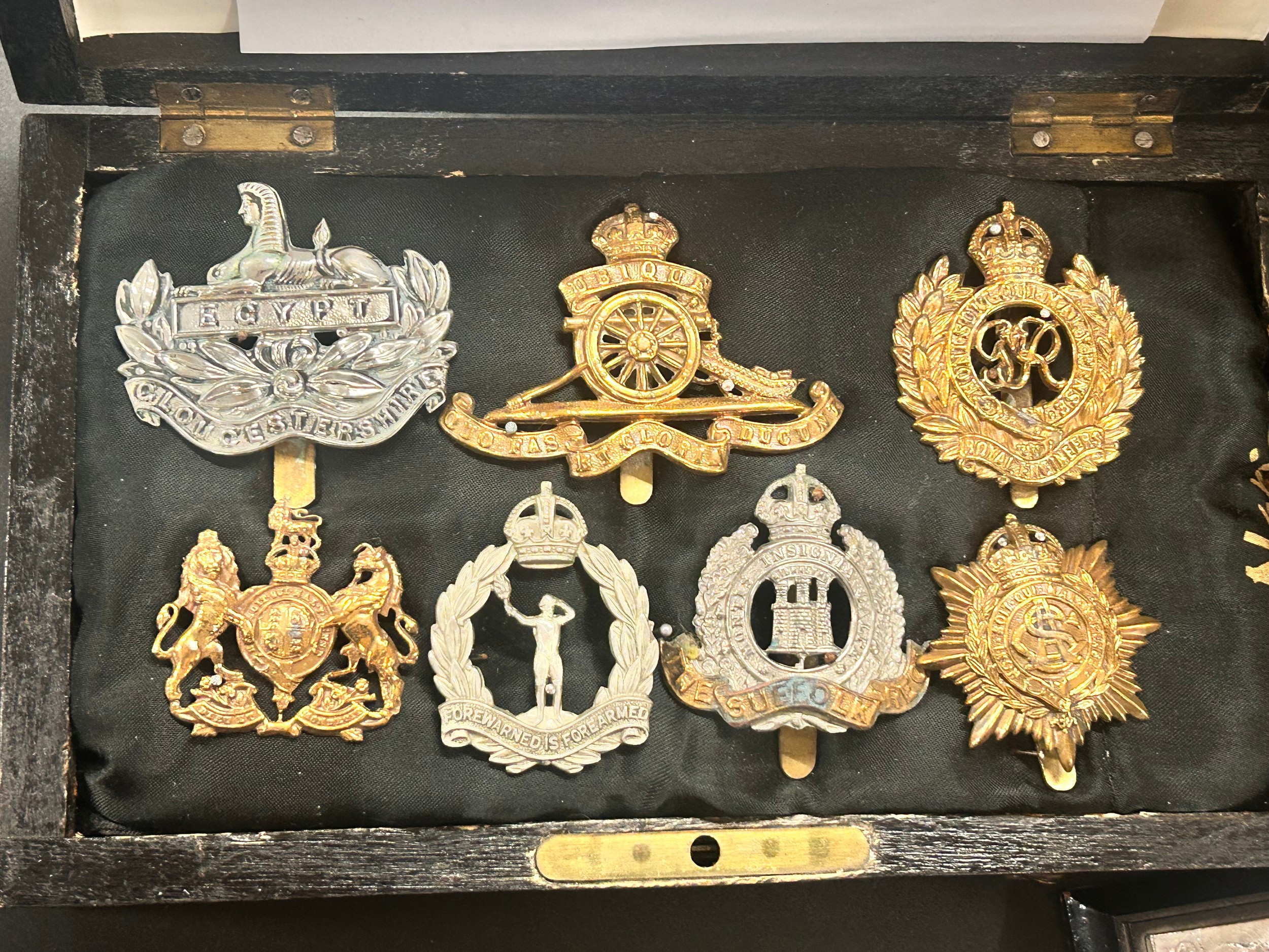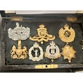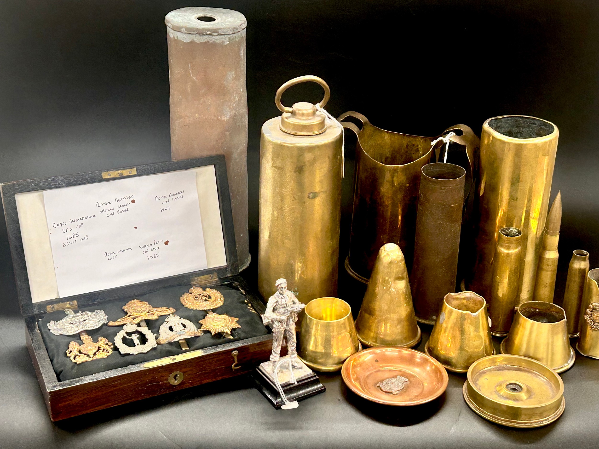 A collection of trench art, a case with seven military badges, etc.