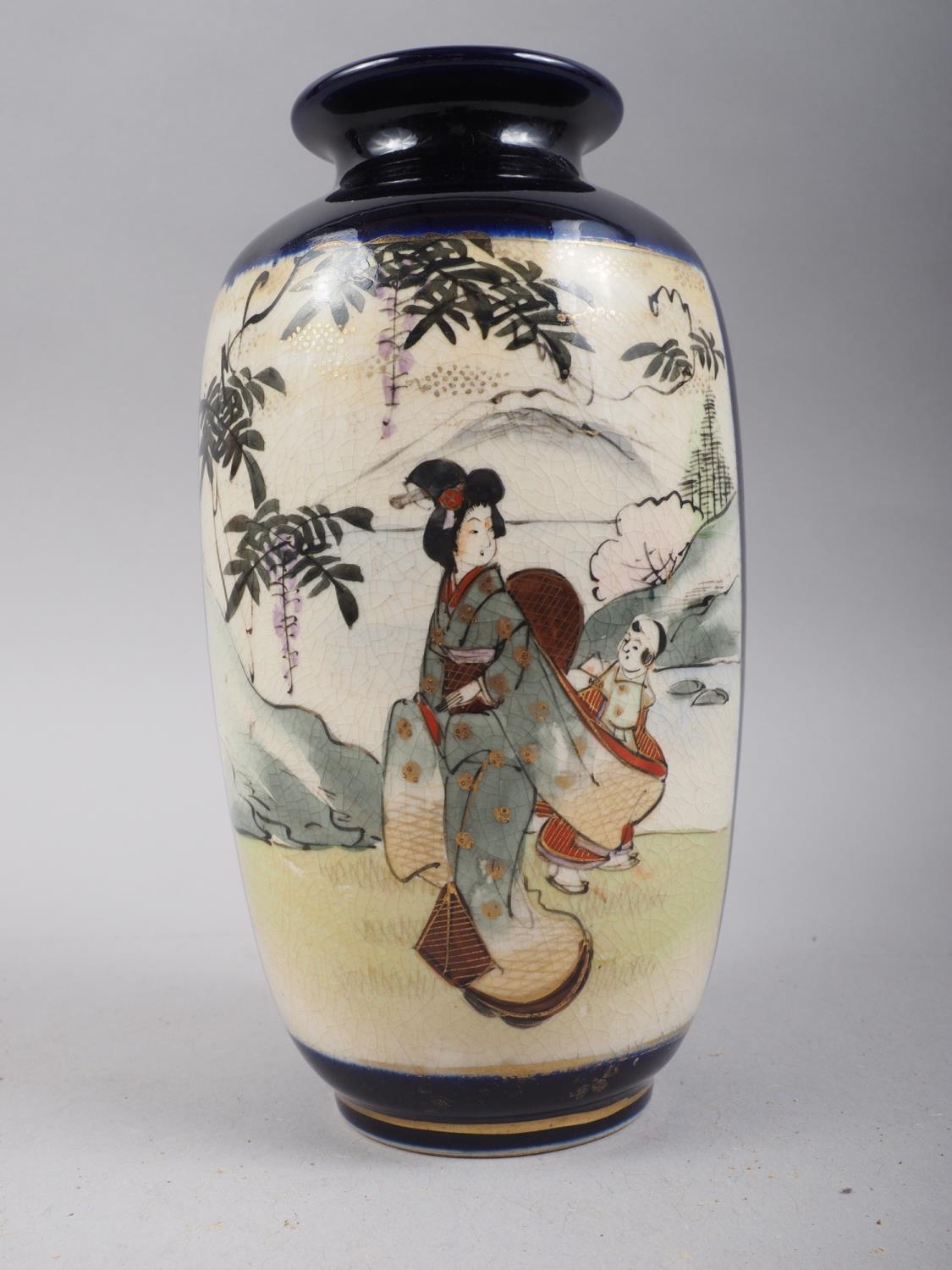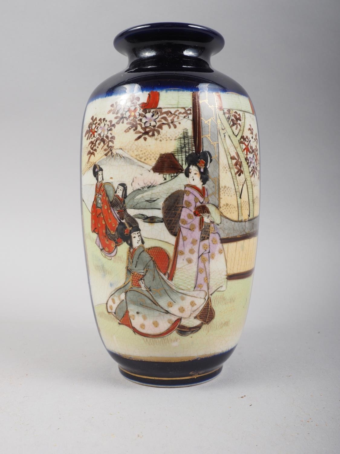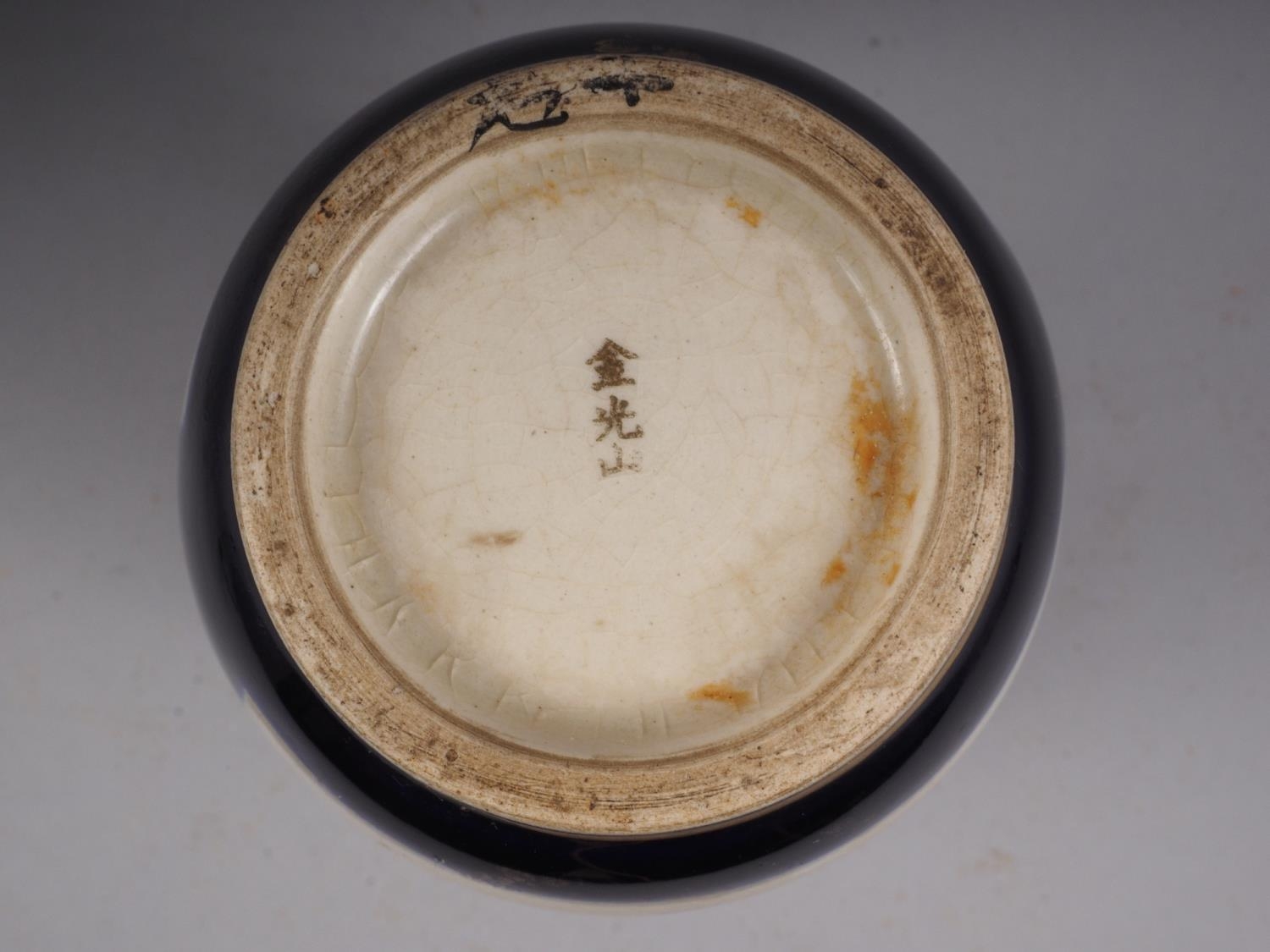 A Japanese Satsuma baluster vase, decorated panels with figures in a landscape, signed "Jin Guant Shan", 7 1/4" high