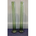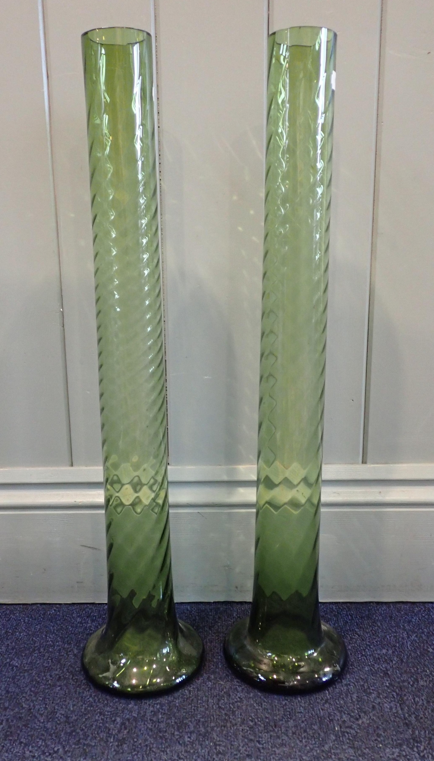 A NEAR PAIR OF TALL GREEN GLASS LILY VASESwith spiral surface and flared bases, 60cm high