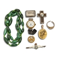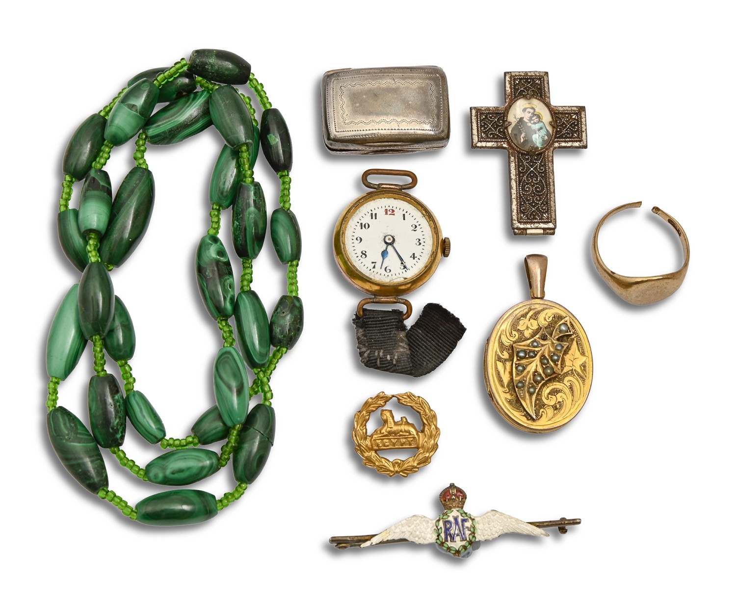 A 9ct gold signet ring, a George III silver vinaigrette, silver and enamel RAF sweetheart's brooch, necklace of malachite beads and several other articles, ring 5.7g