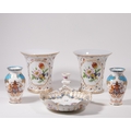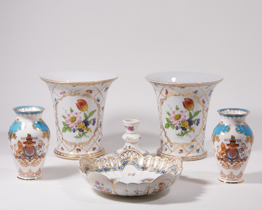 A pair of modern Royal Europe vases, of large proportions, the tapered body with central floral decoration with gilt border surrounded by gilt crosshatching framing smaller floral motifs, 20.5cm dia., 21cm high; together with a pair of Golden Jubilee 2002 commemorative baluster vases, decorated with the Royal coat of arms and motto surrounded by pink, blue, and gilt decoration, 17cm high;ÿand a Dresden comport stand, with scalloped bowl raised on a knopped stem, 23cm dia. (5)