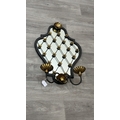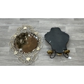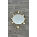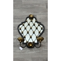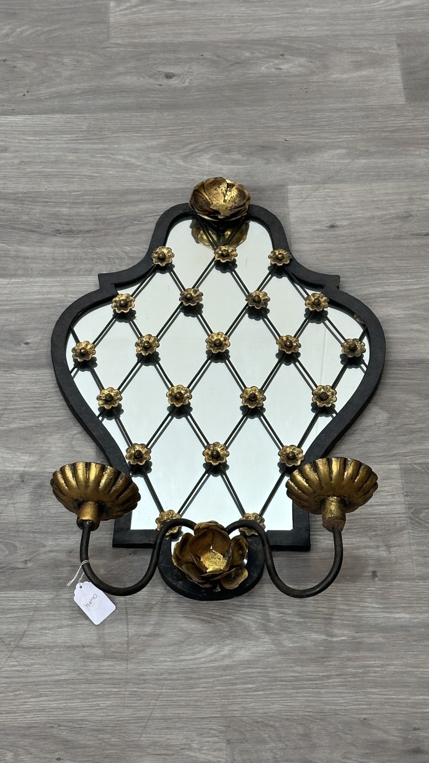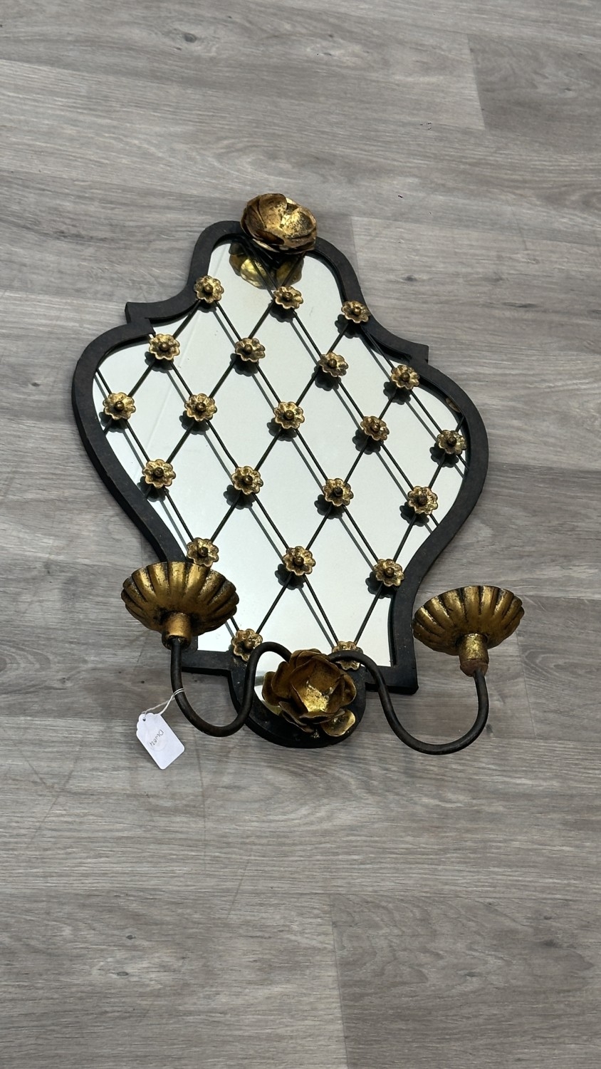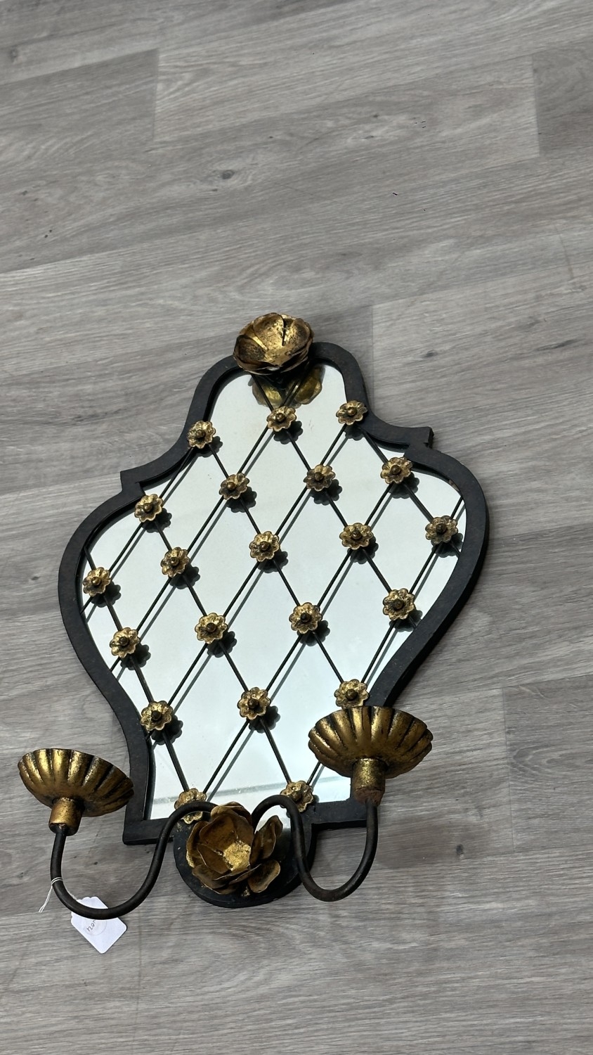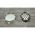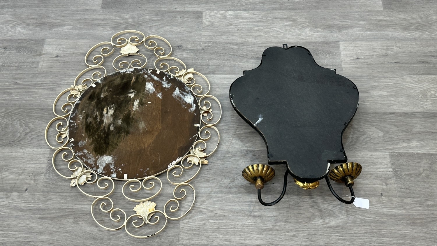 Two metal framed wall mirrors with floral decoration, one white painted - approx. 75cm high x 54cm wide and one black and gold painted with two fitted wall sconces - approx. 57cm high x 38cm wide