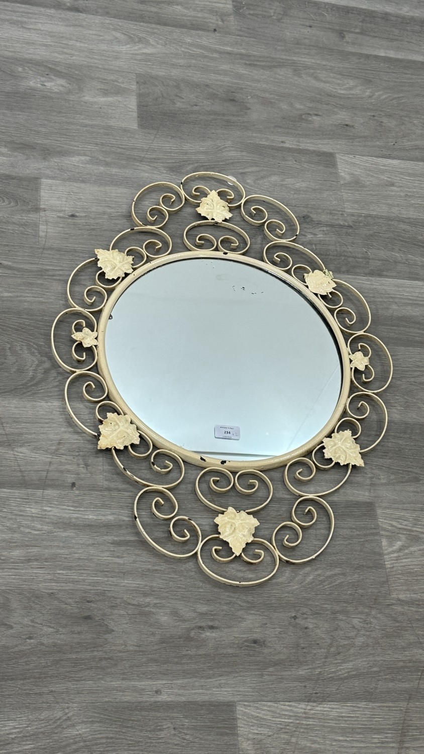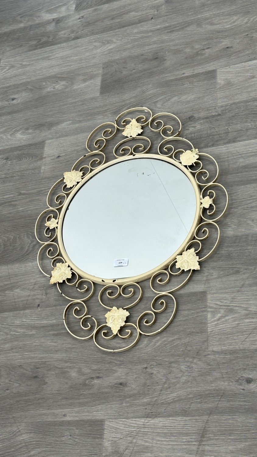 The white painted framed mirror shows losses to paintwork.