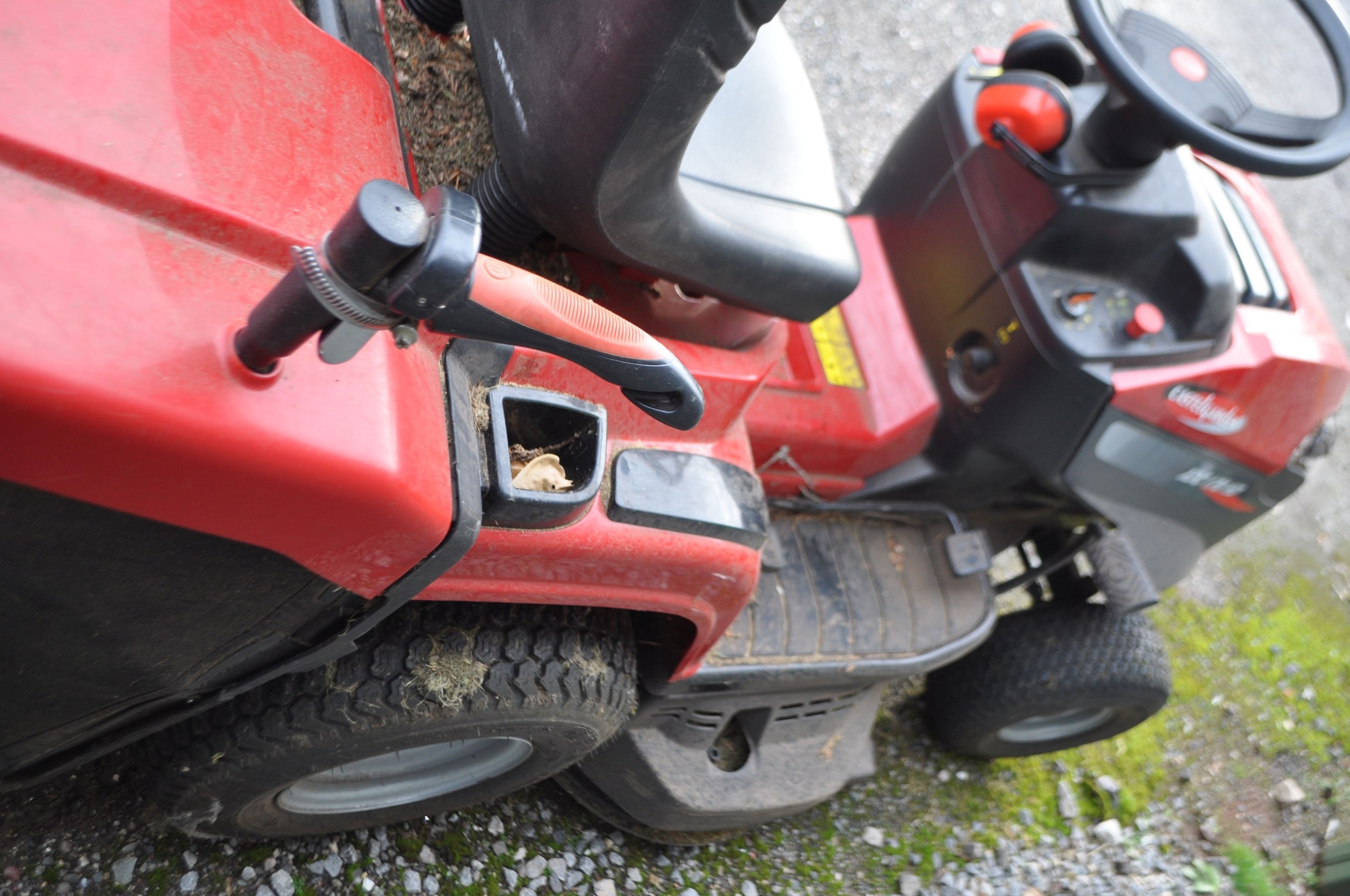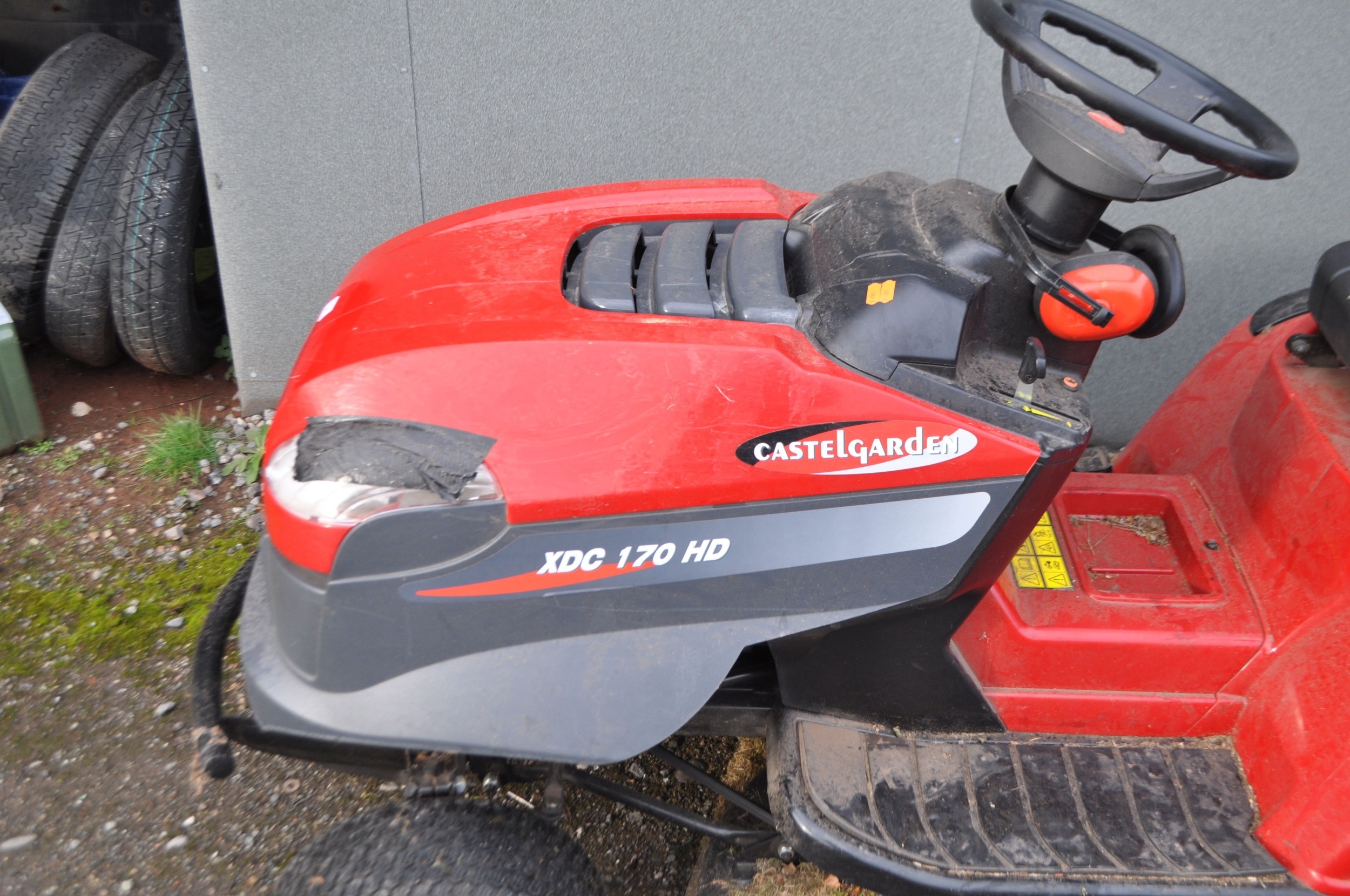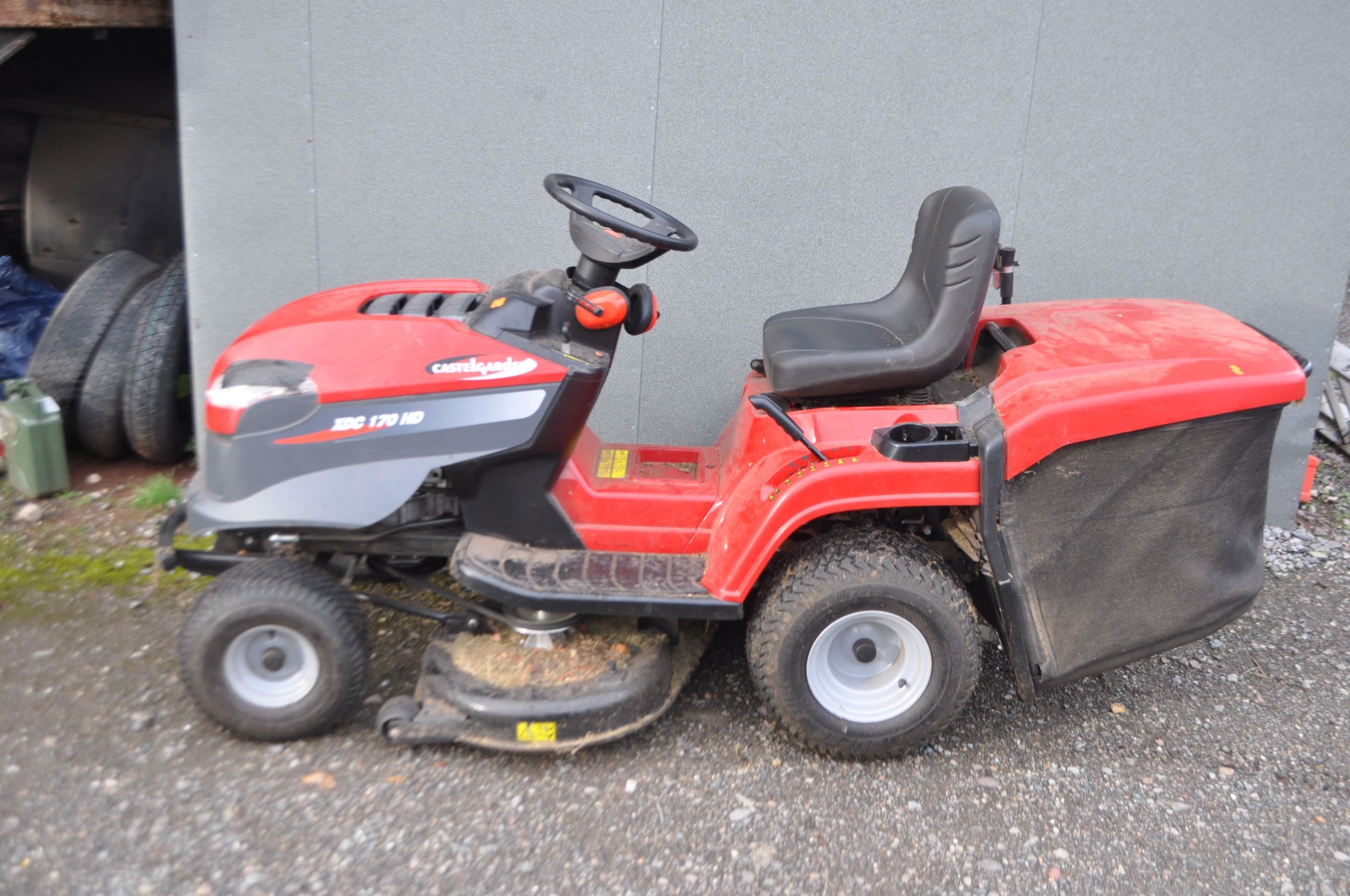 A CASTELGARDEN XDC170HD RIDE ON LAWN MOWER with collection box, key and manual. Condition Report; starts and drives, blades rotate, lights taped at front