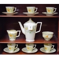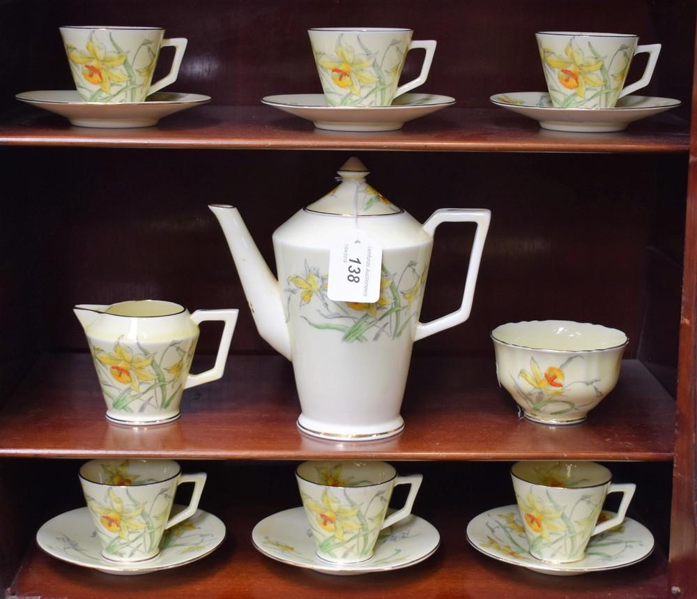 A Crown Staffordshire Daffodils pattern coffee set, for six, comprising coffee pot, cream jug, sugar bowl, cups and saucers, c.1930