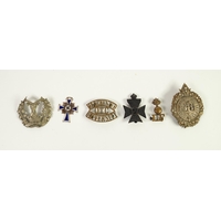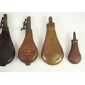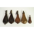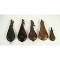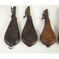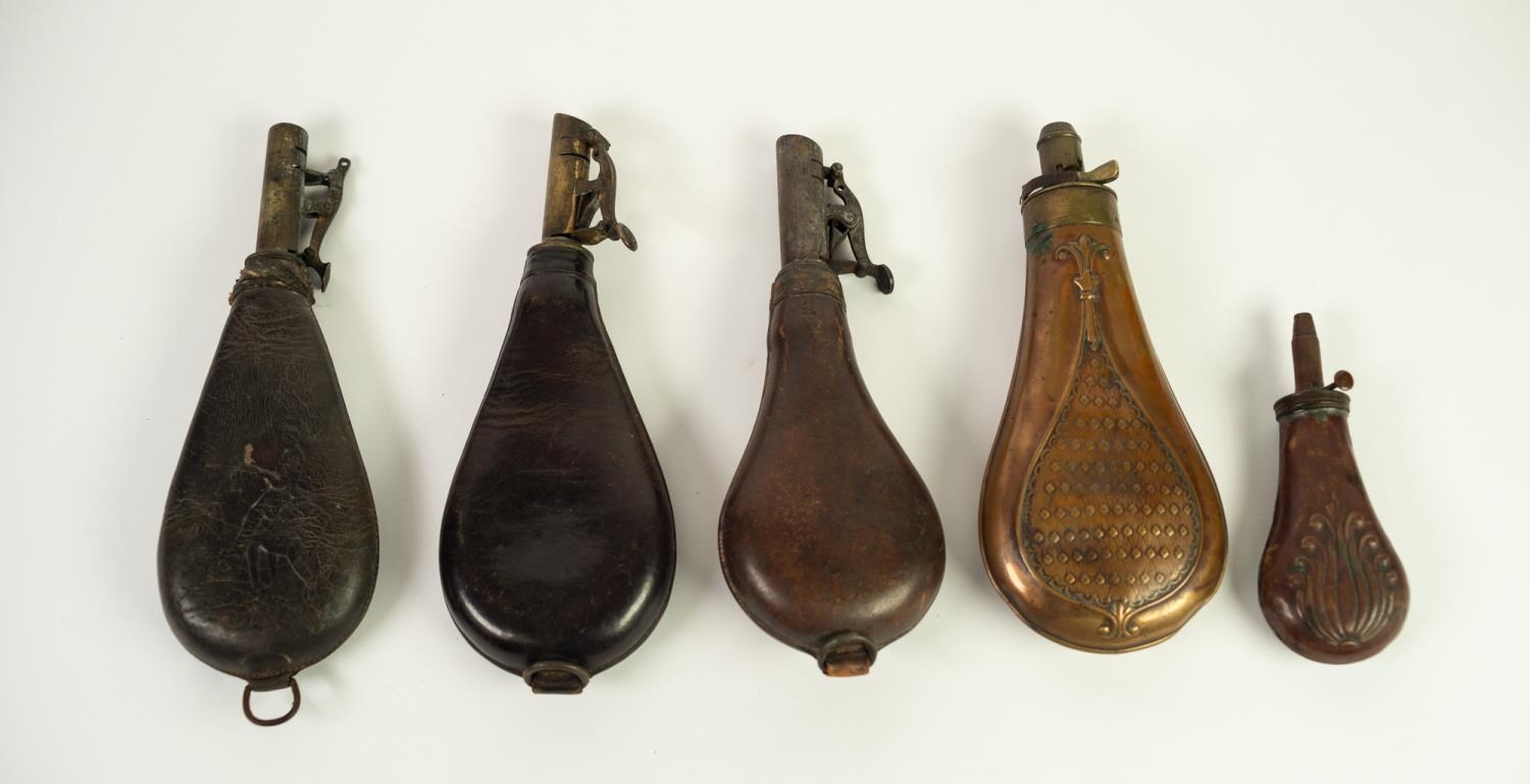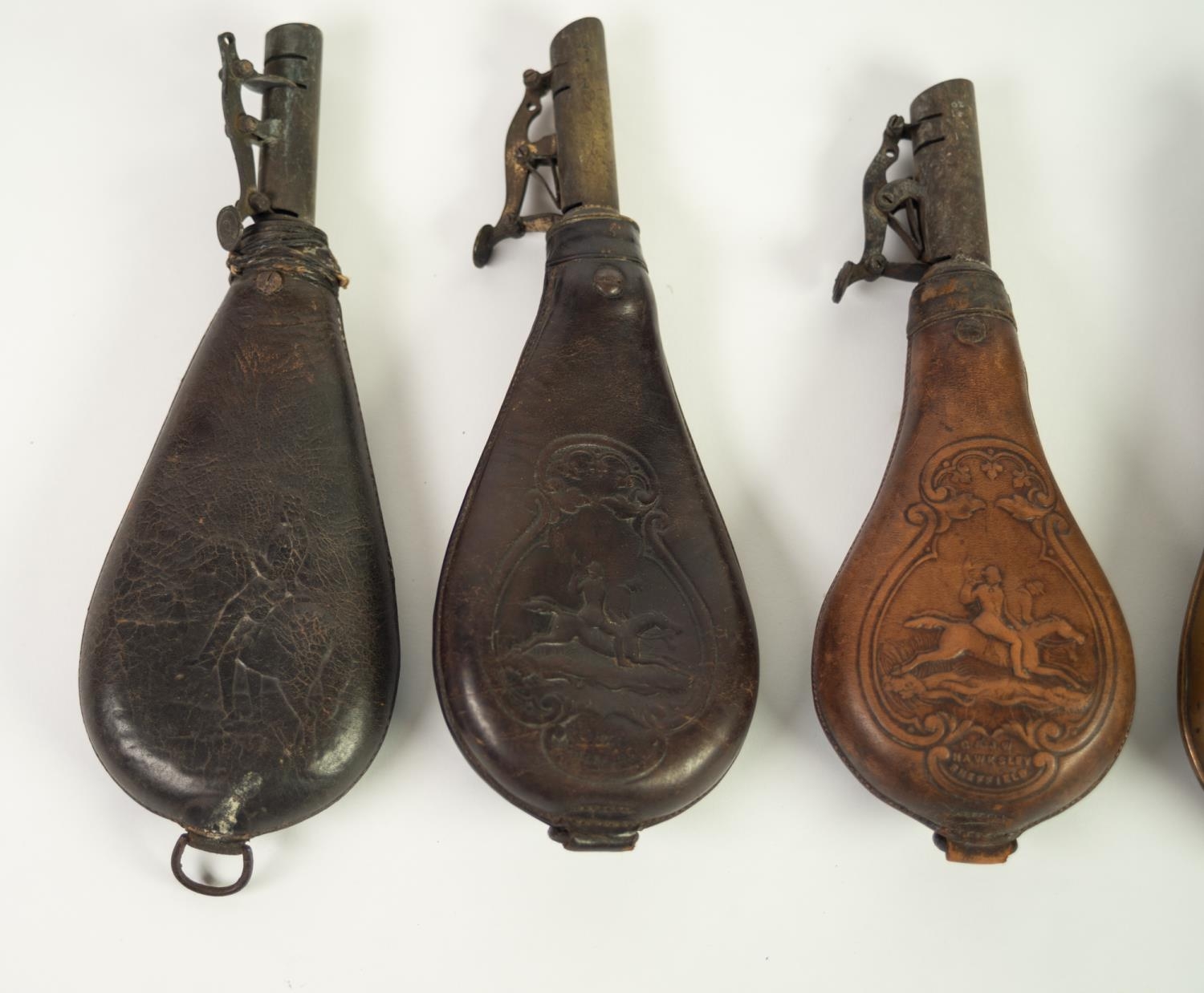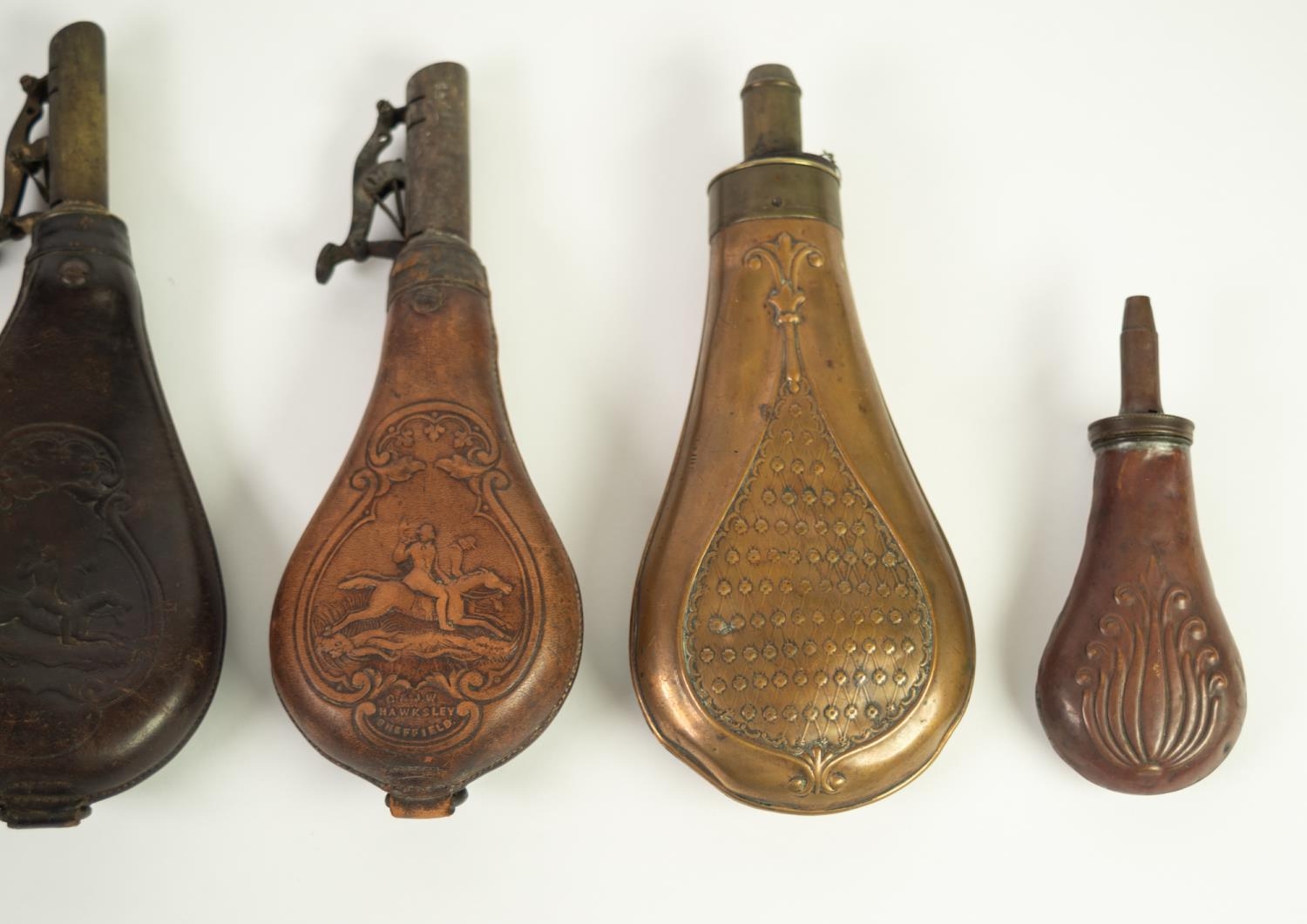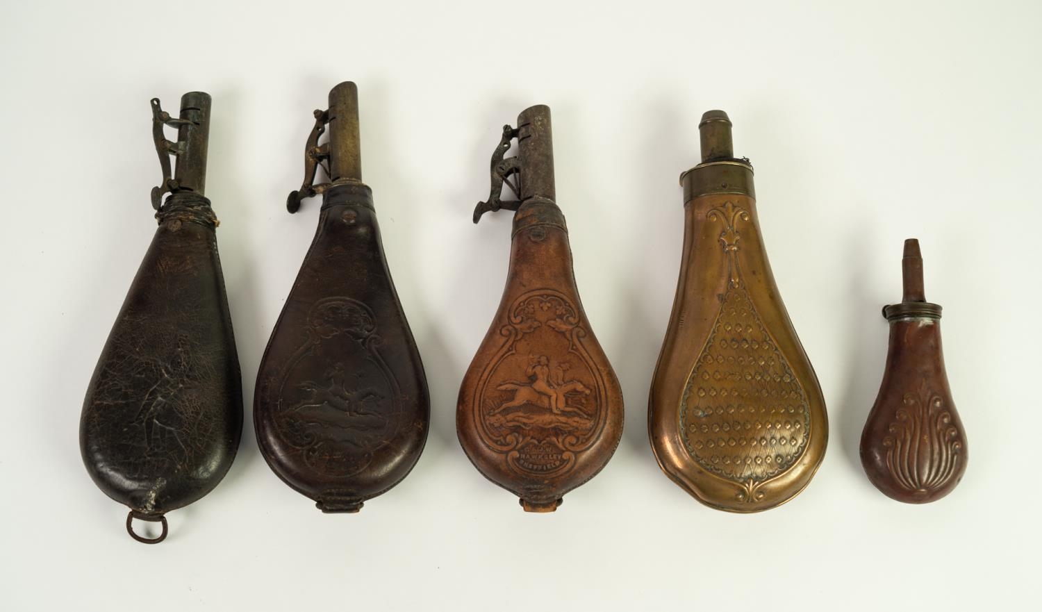 TWO G & J.W. HAWKSLEY, SHEFFIELD LEATHER AND BRASS SHOT FLASKS, embossed to one side with hunting scene and maker's name, metal loop to base, 8 1/2in (21.6cm) high; ANOTHER SIMILAR, with faults; EMBOSSED COPPER AND BRASS FITTED POWDER FLASK with lattice pattern decoration, 7 3/4in (19.7cm) high and a SMALLER SIMPLER EXAMPLE, with scrolled decoration, 5in (12.7cm) high (5)