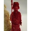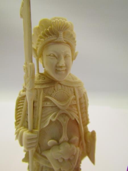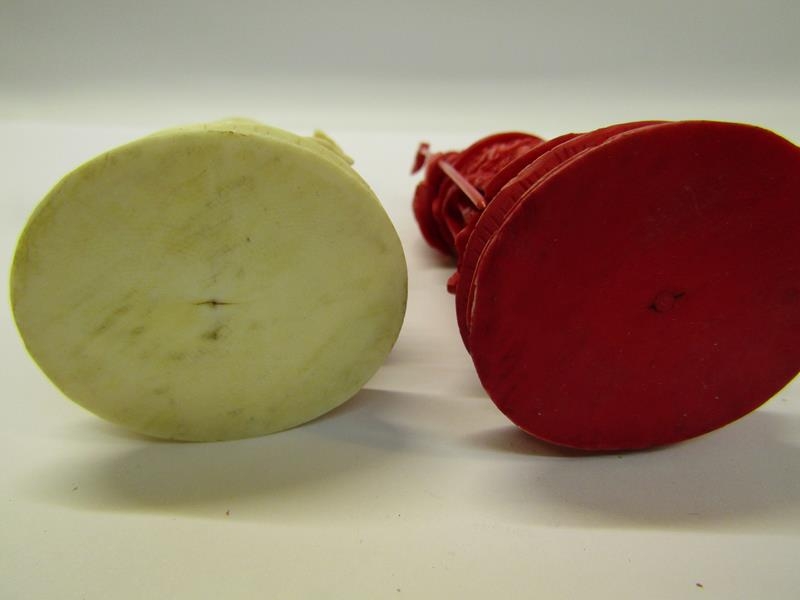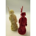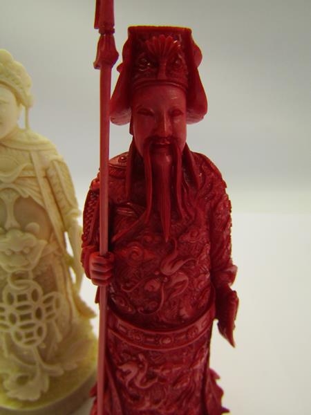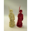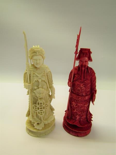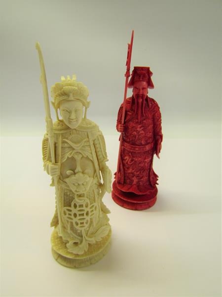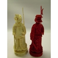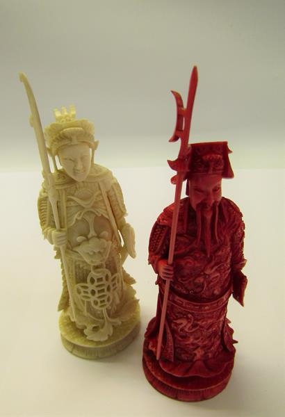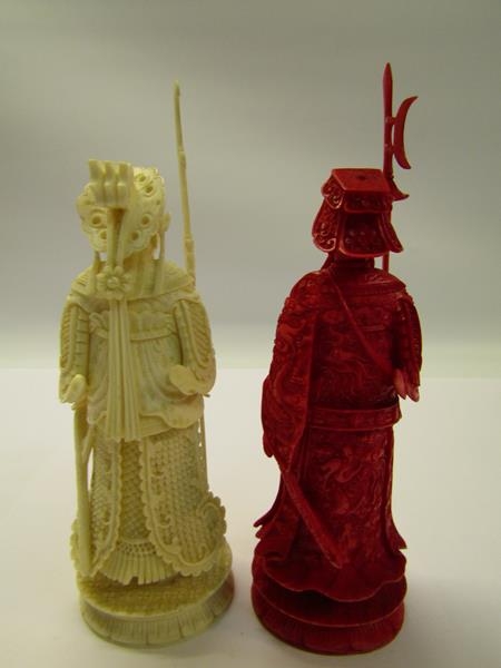 Two 19c Chinese carved ivory chess pieces, both in the form of warriors, one white and one red stained, each 14.5cm h. Weight 253g appx
