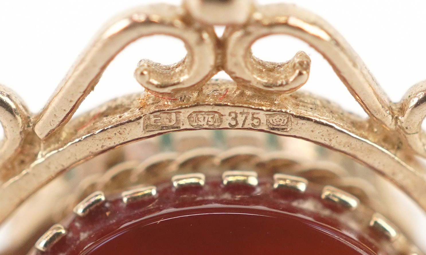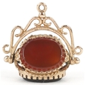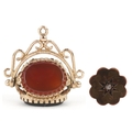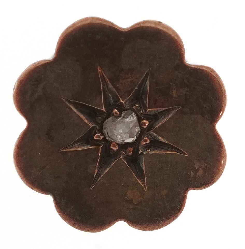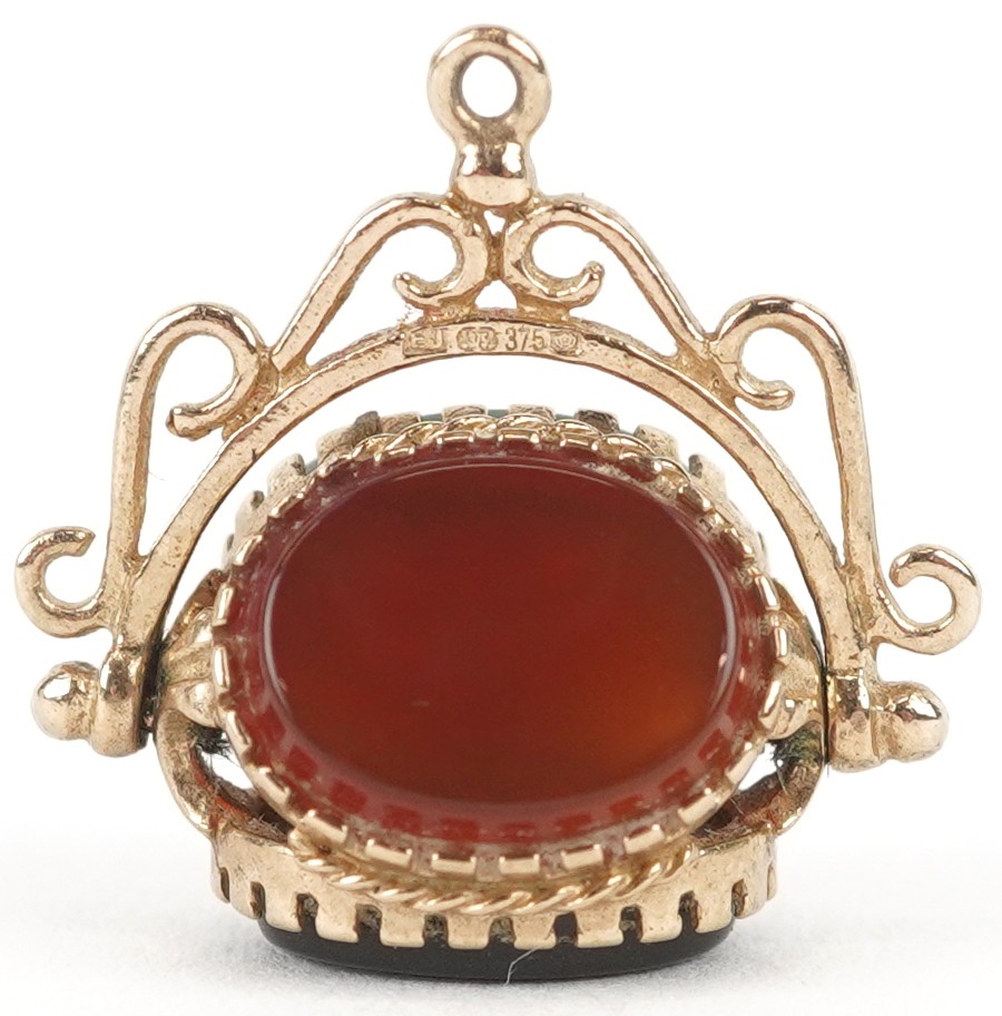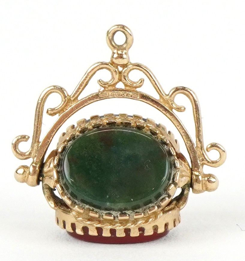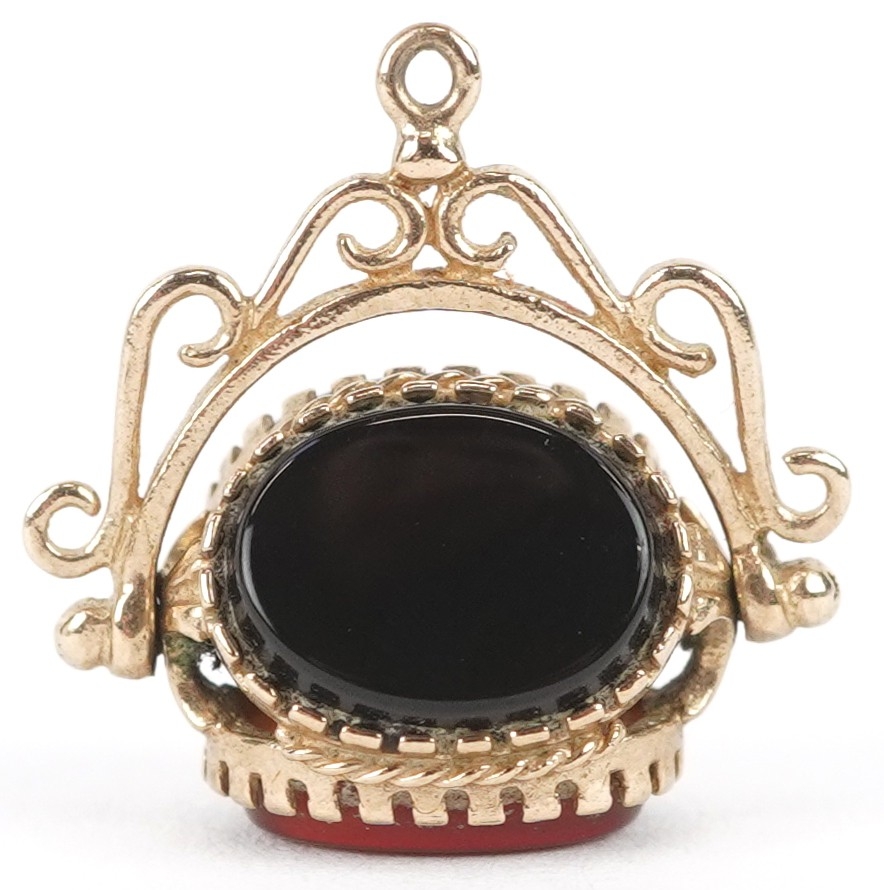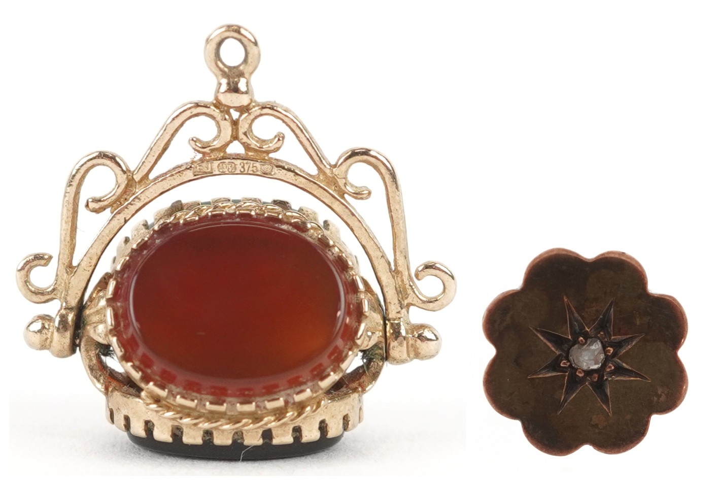 A 9ct gold carnelian, bloodstone and onyx spinner fob, 1.8cm high together with an unmarked gold diamond starburst design dress stud, 10mm in diameter, total 3.8g.