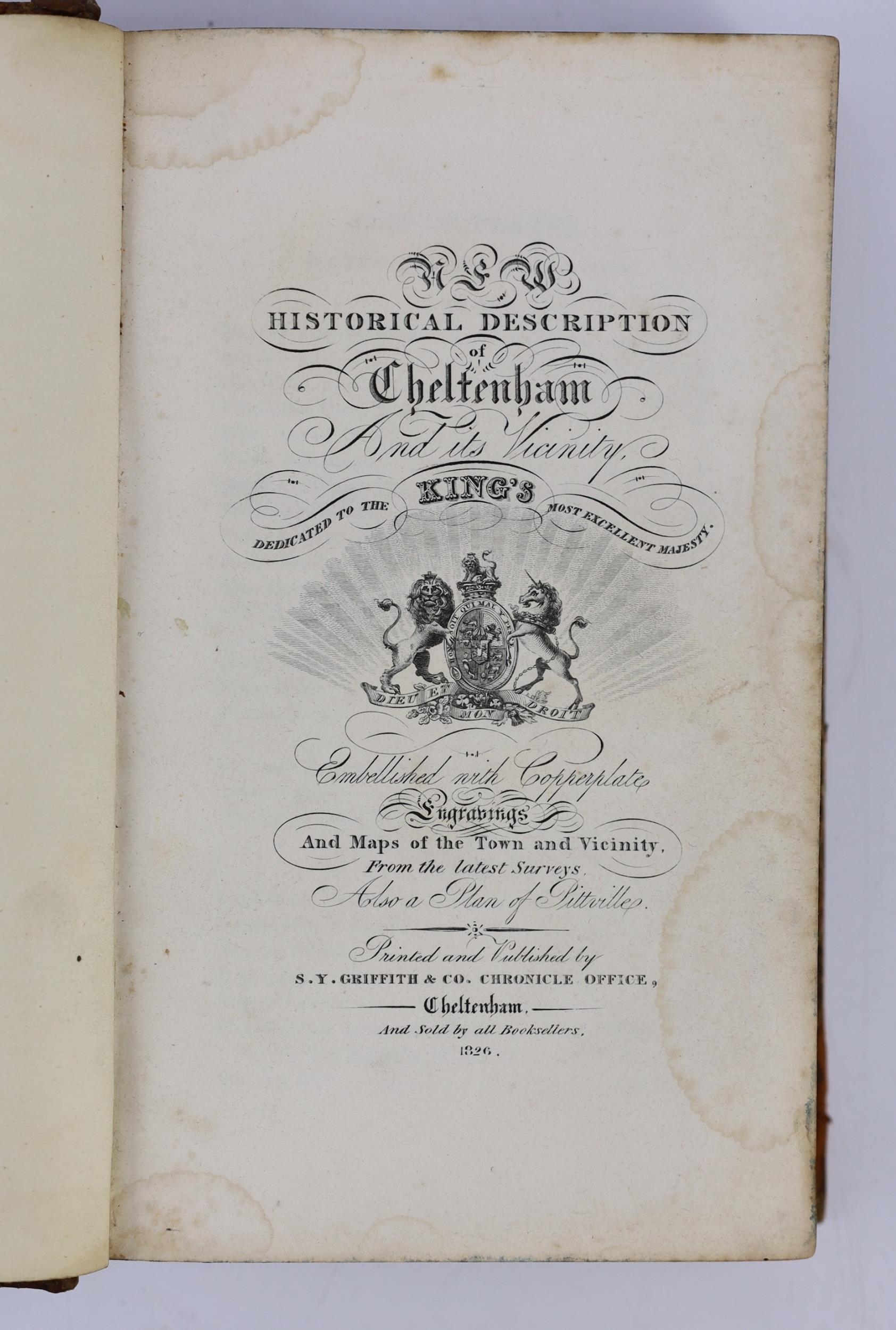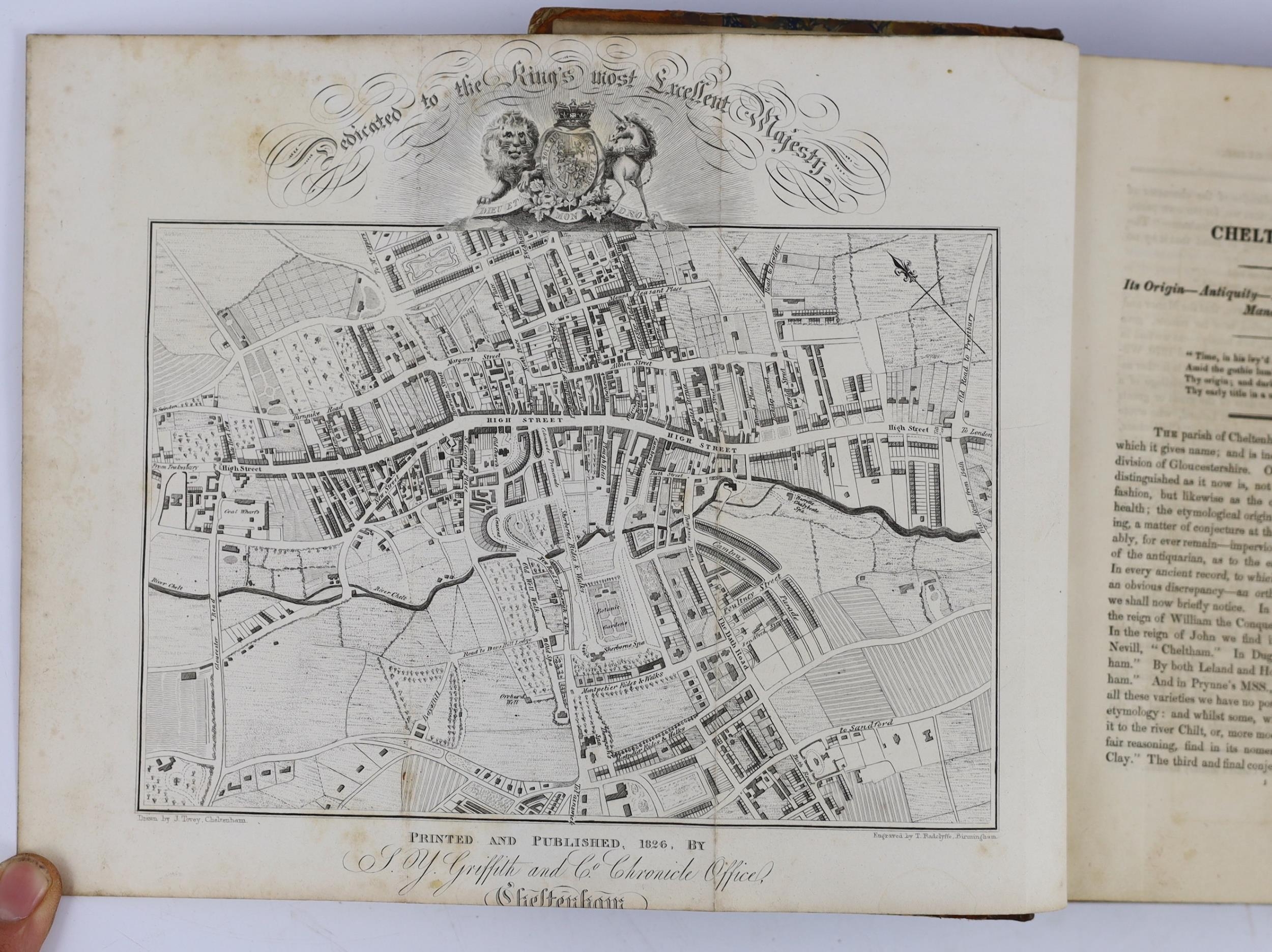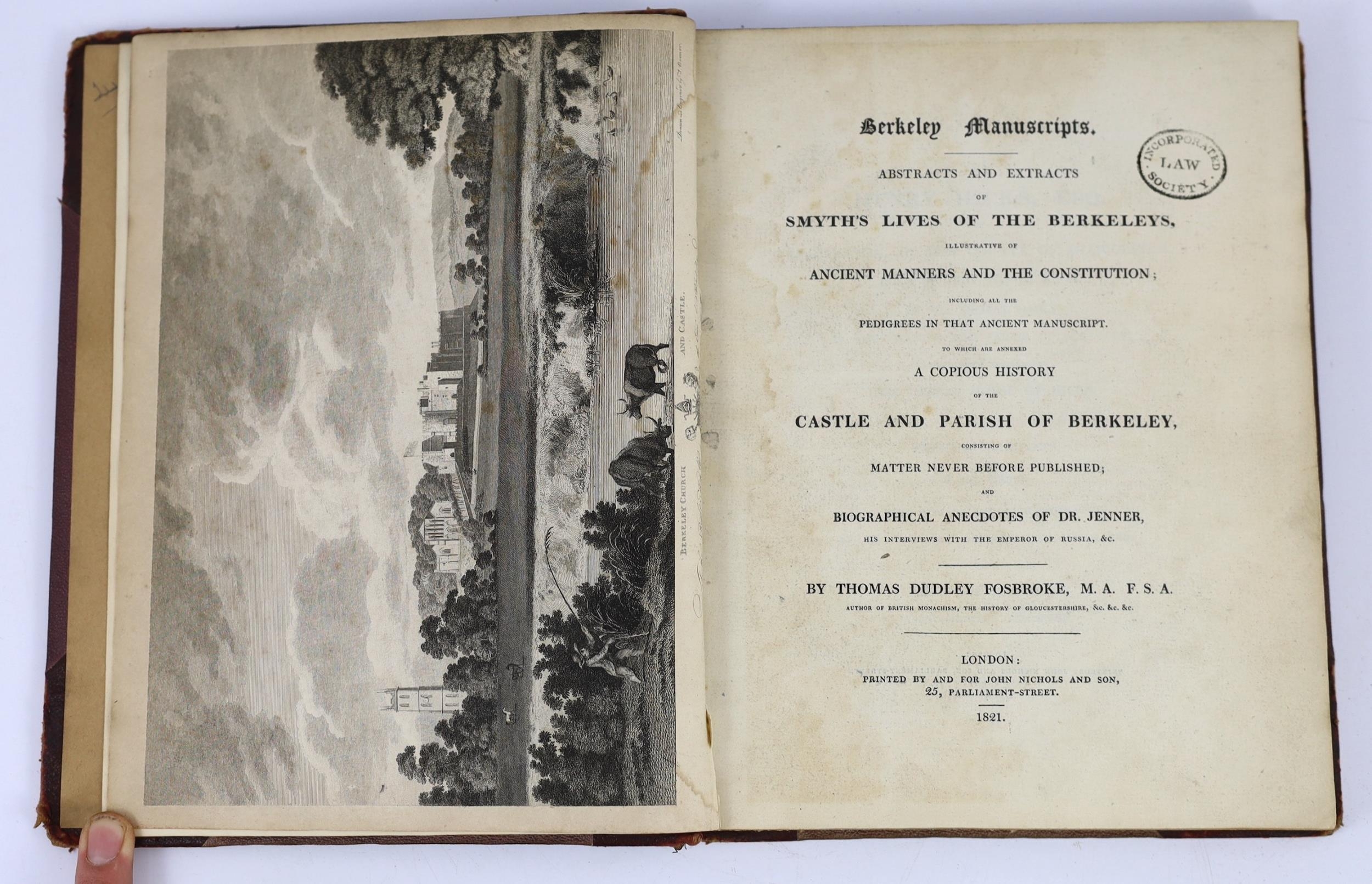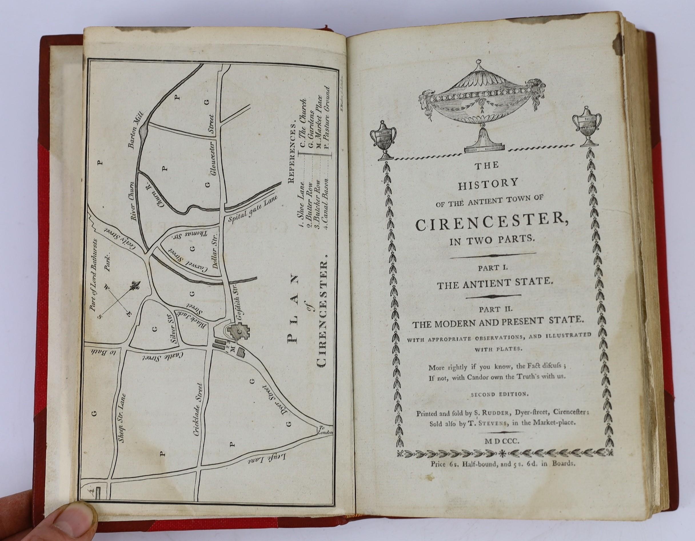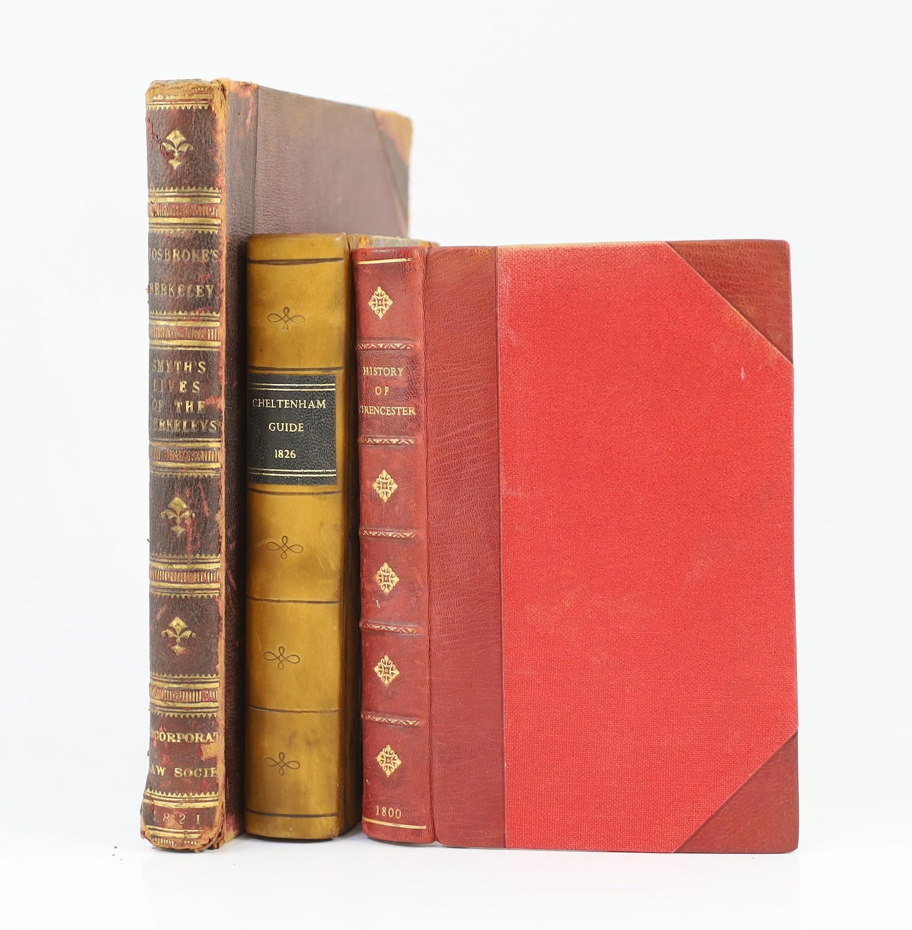 ° ° GLOUCS: (Rudder, Samuel) The History of the Ancient Town of Cirencester ... title within decorated border, 3 plans (2 pictorial and folded) and 6 plates (3 folded, 1 hand coloured); 20th cent. red half morocco and cloth, gilt-decorated and panelled spine, Cirencester, 1800: Fosbroke, Thomas Dudley - Berkeley Manuscripts. Abstracts and Extracts of Smyth's Lives of the Berkeleys ... (and) a Copious History of the Castle and Parish of Berkeley ... frontis., 2 folded pedigrees; old half morocco and cloth, 4to. 1821; New Historical Description of Cheltenham, 2 vols. (bound together). pictorial engraved titles, folded map, 2 folded plans and 24 plates; old half calf and marbled boards (rebacked, with gilt label). Cheltenham, 1826 (3)