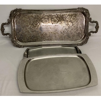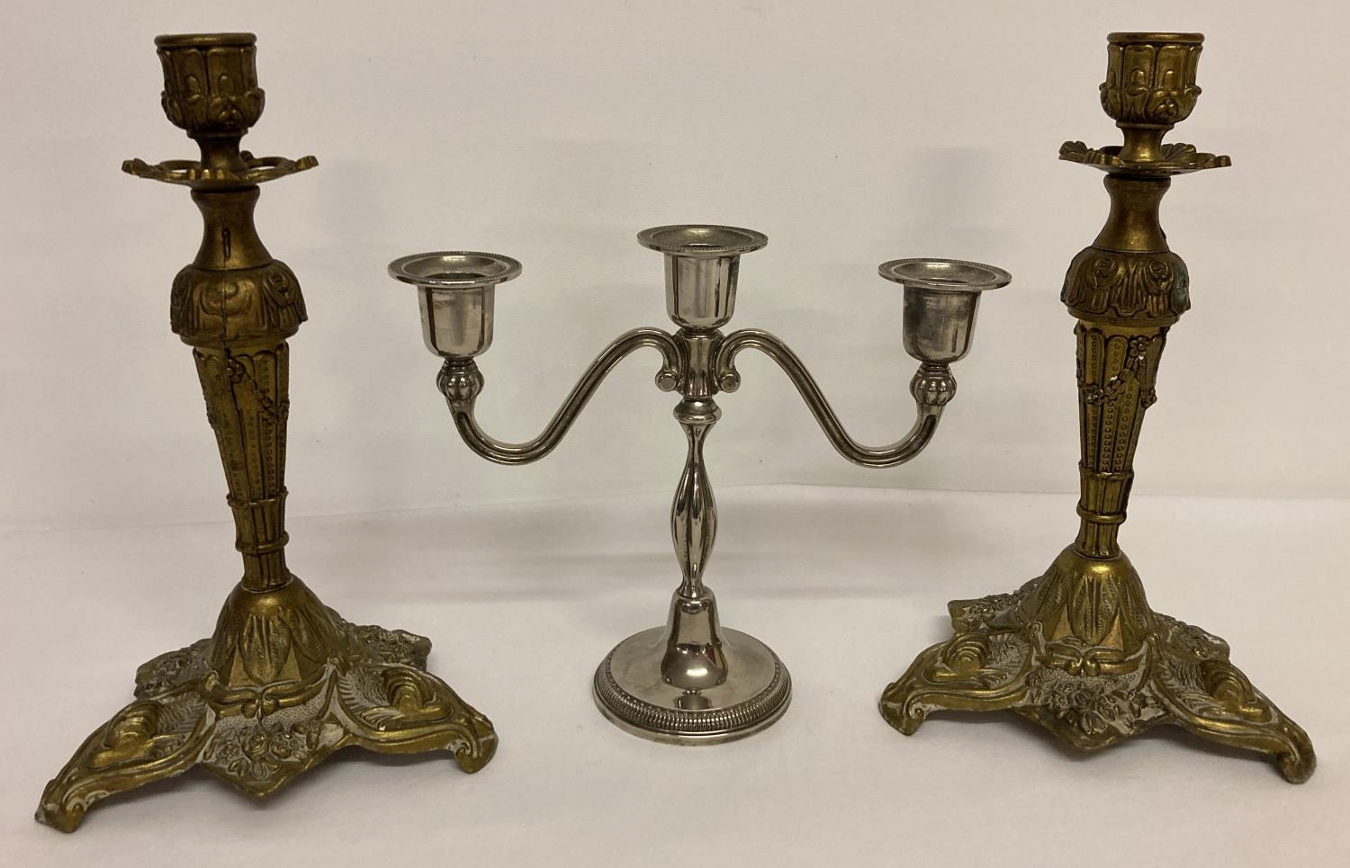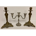 A pair of brass Italian rococo style candle sticks together with a vintage silver plate candelabra. Candle stick approx. 25cm tall.