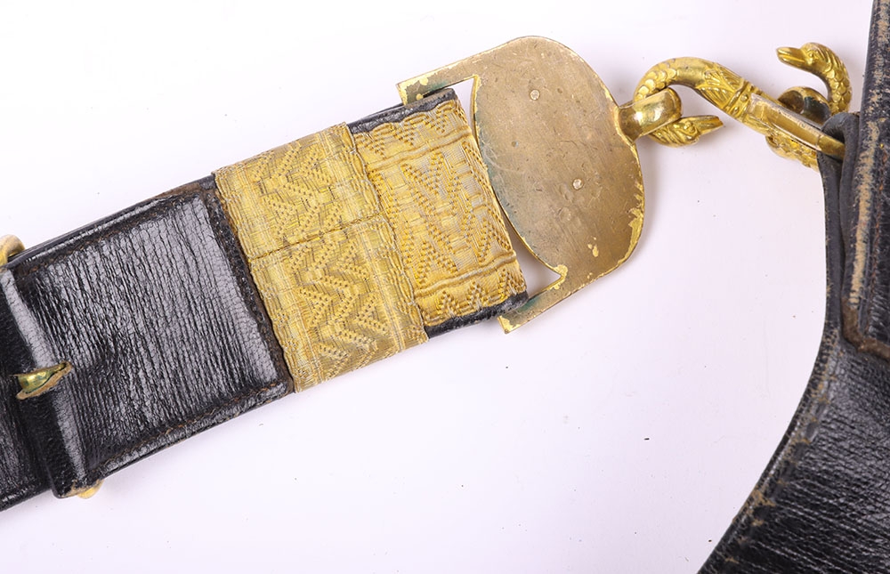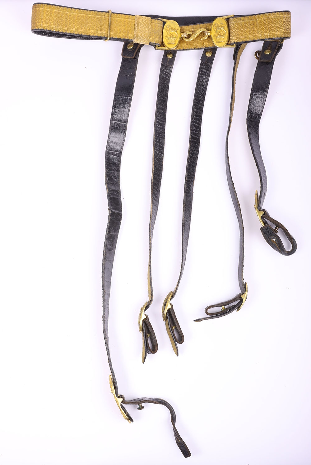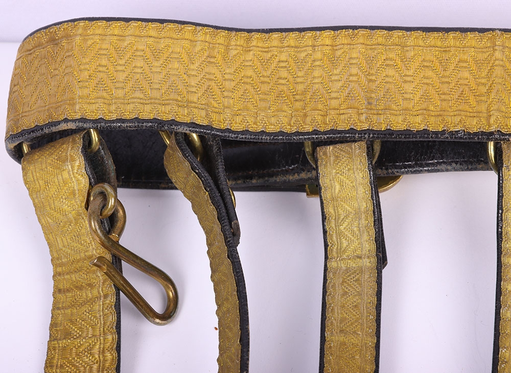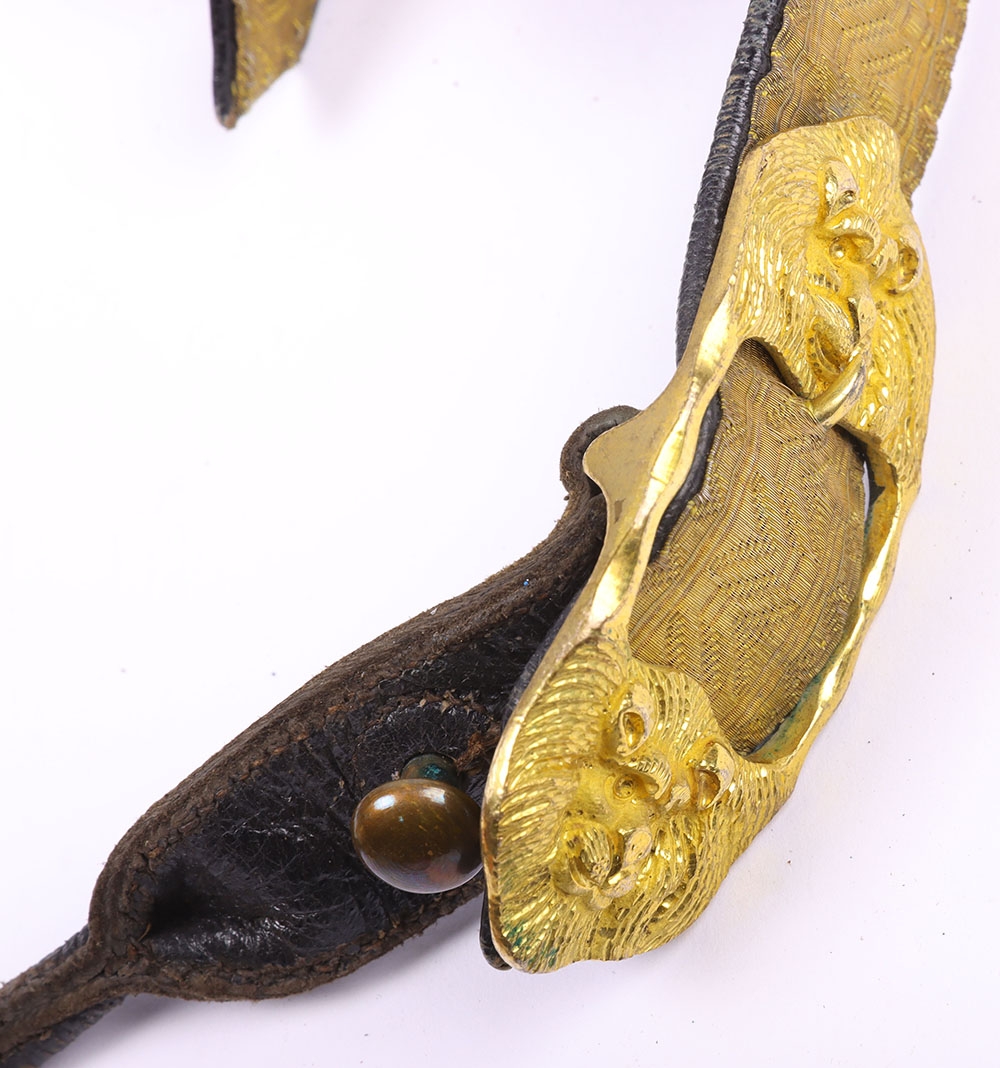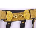 British Victorian Royal Artillery Officers Waist Belt, fine example of black leather officers full dress waist belt with gilt lace top, two piece gilt metal oval fittings with snake clasp. Complete with the original sabretache / sword slings. Good condition overall.