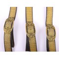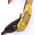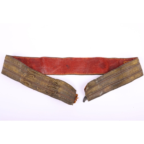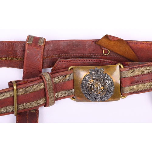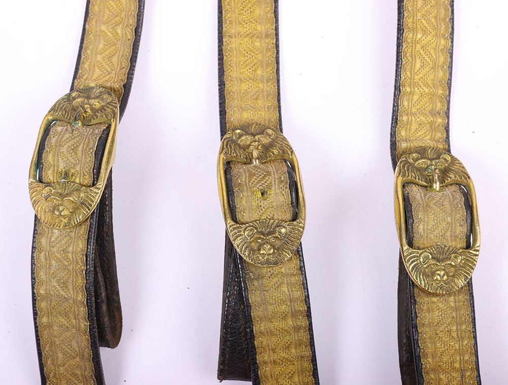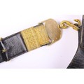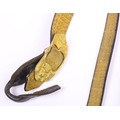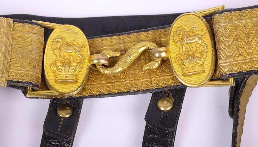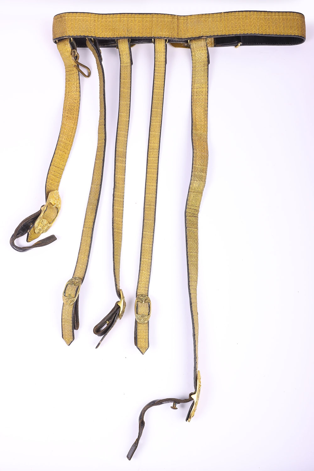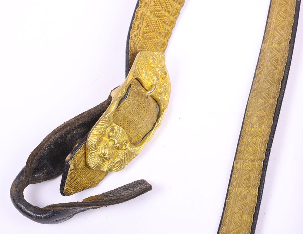 British Victorian Royal Artillery Officers Waist Belt, fine example of black leather officers full dress waist belt with gilt lace top, two piece gilt metal oval fittings with snake clasp. Complete with the original sabretache / sword slings. Good condition overall.