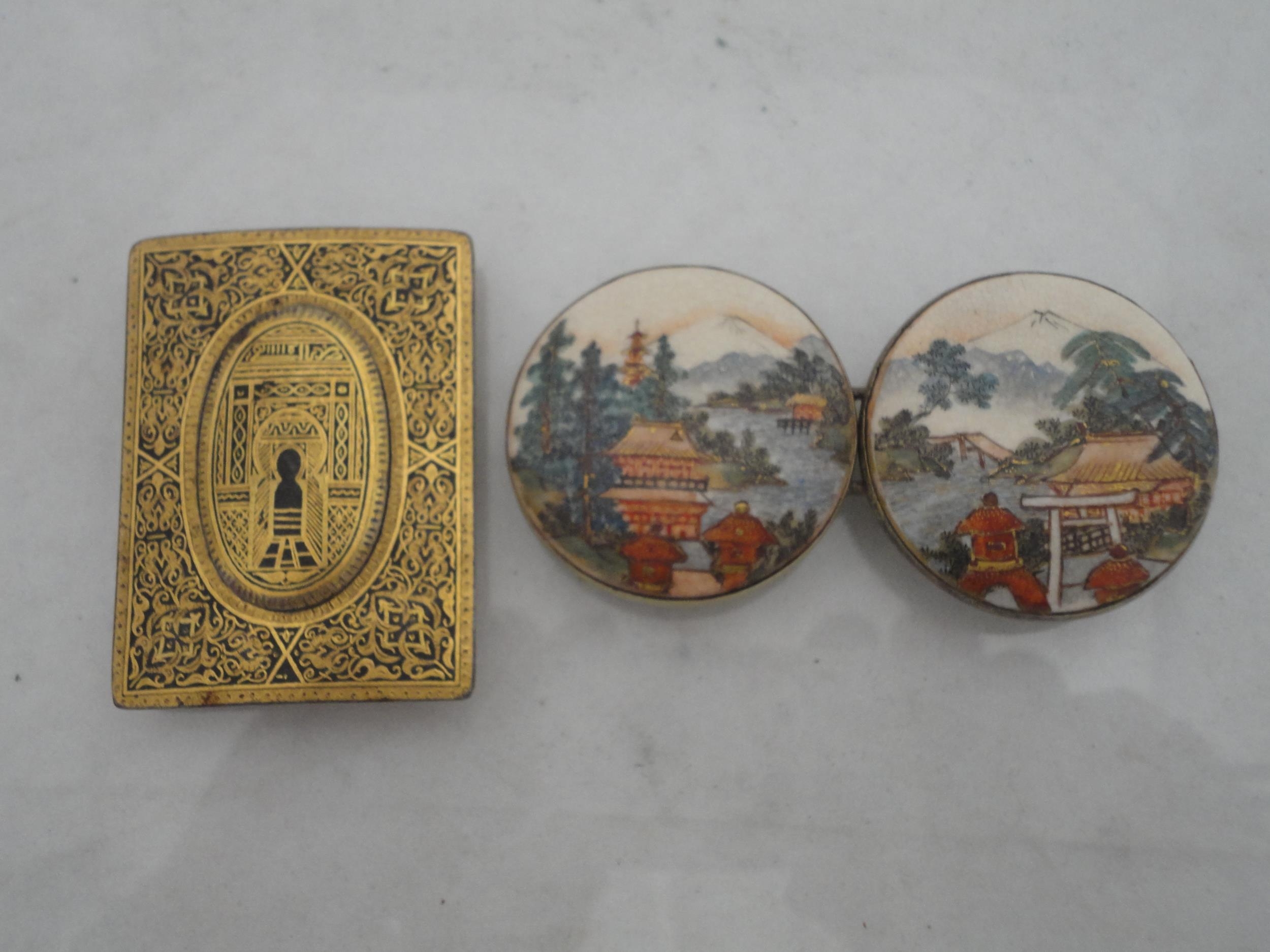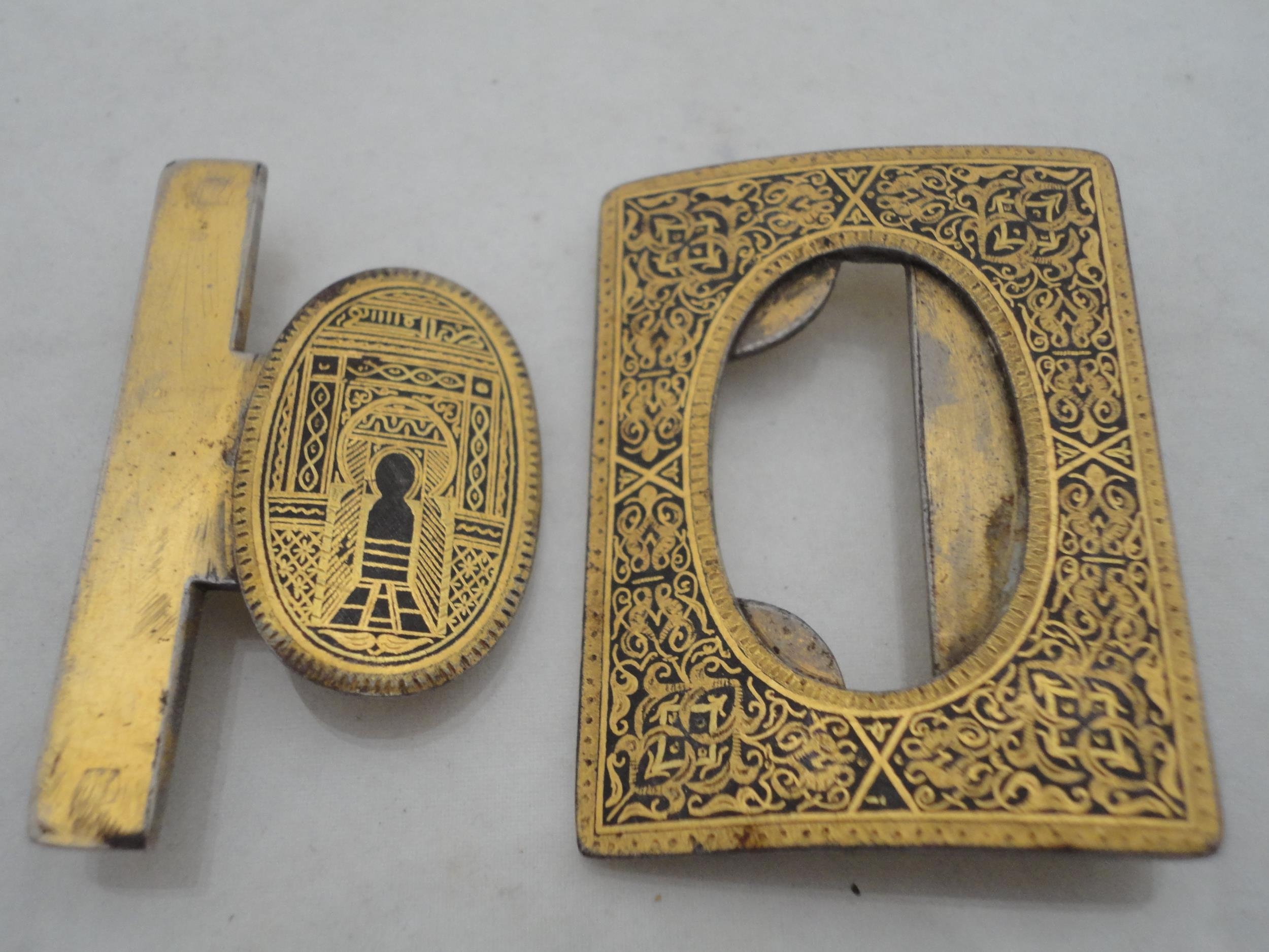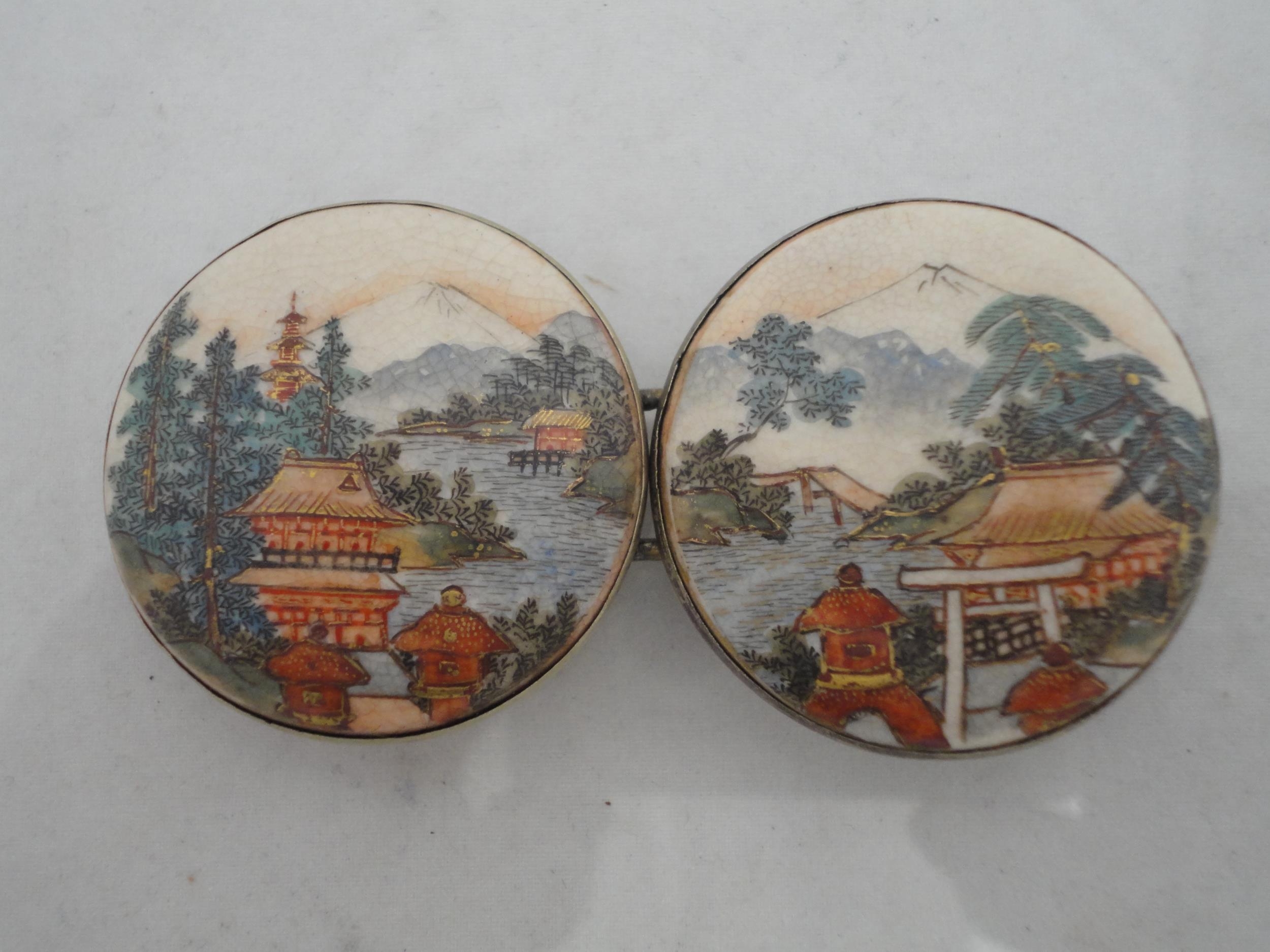 Pair of Japanese Satsuma buckles and a Japanese gilt metal buckle. (3)