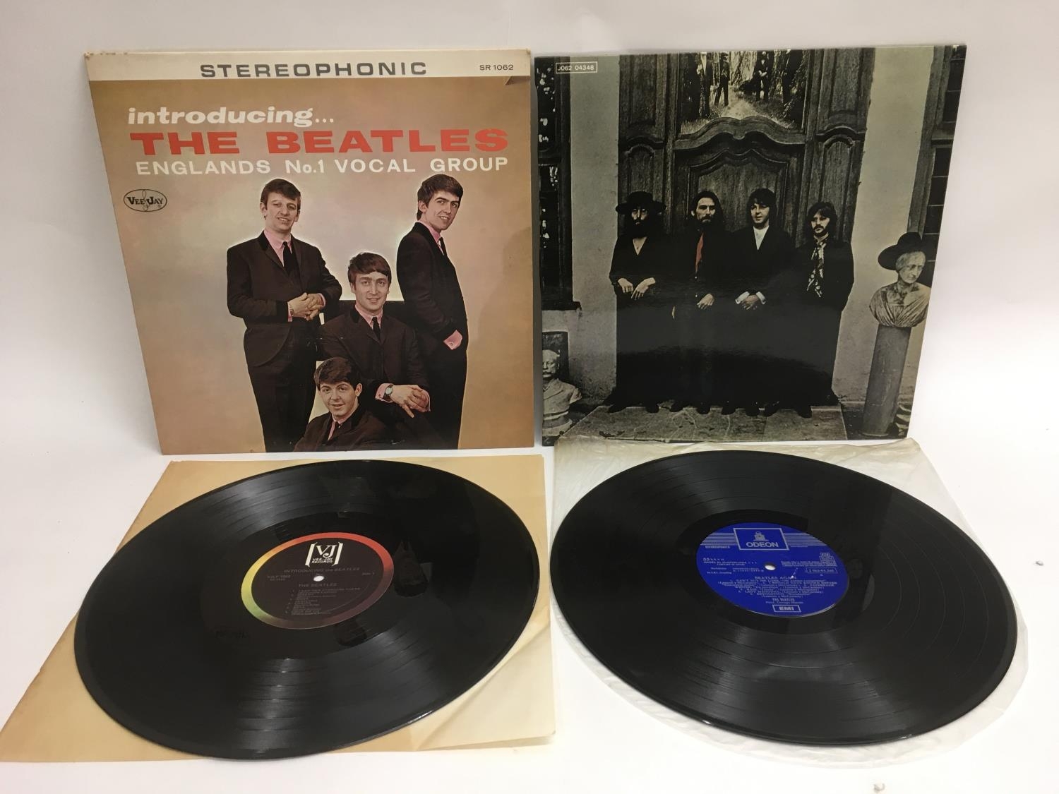 A stereo pressing of 'Introducing The Beatles' on Capitol SR 1062 plus a Spanish pressing on Odeon of the 'Hey Jude' compilation LP retitled as 'Beatles Again' 1 J 062-04.348.