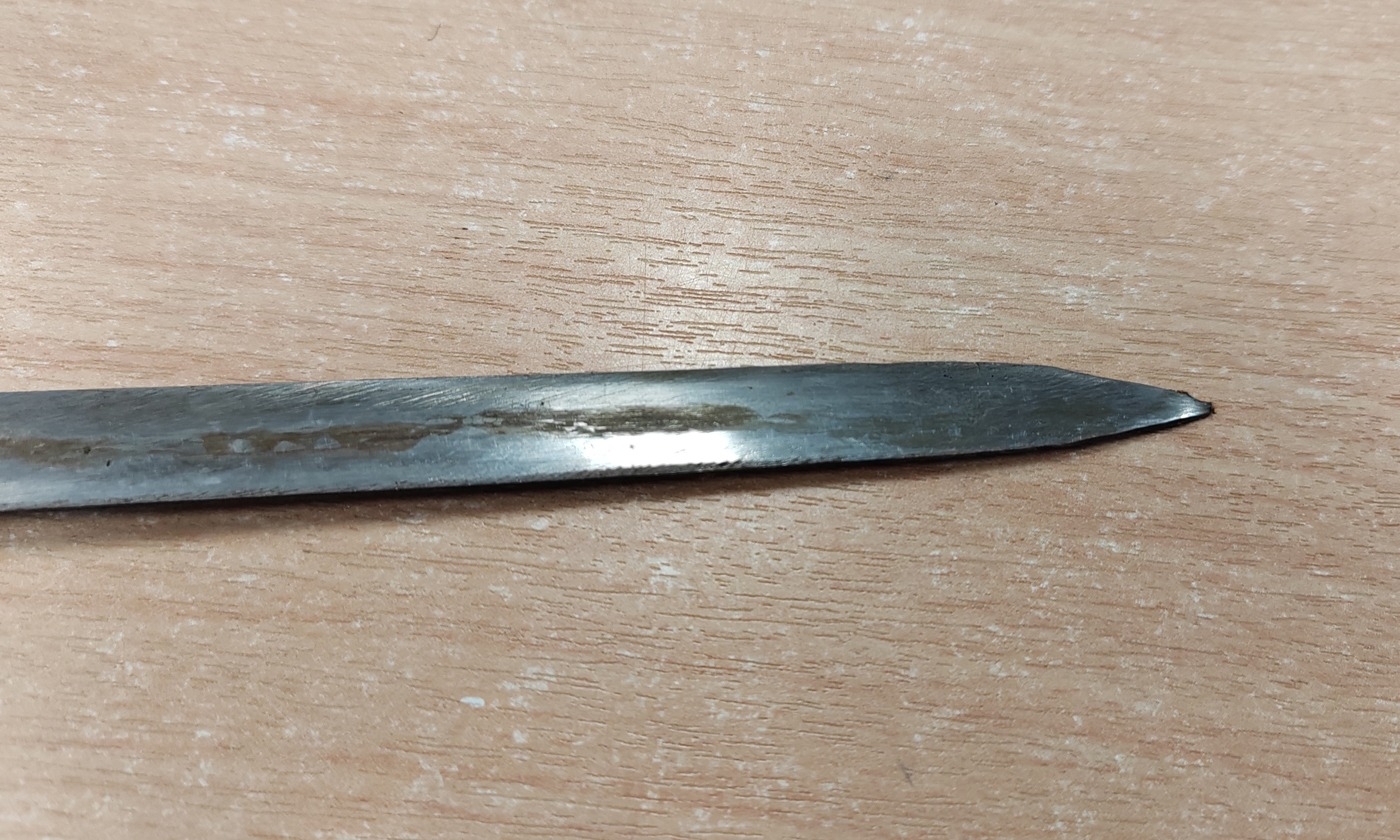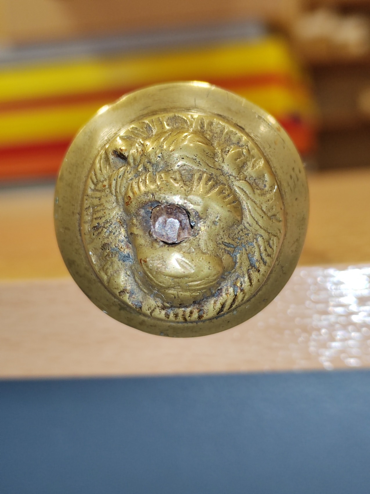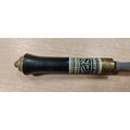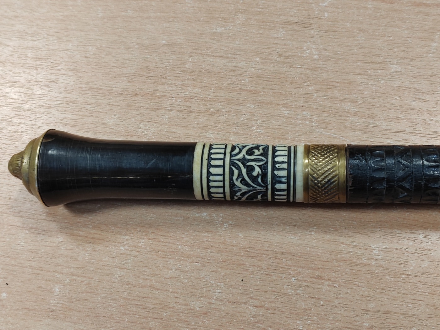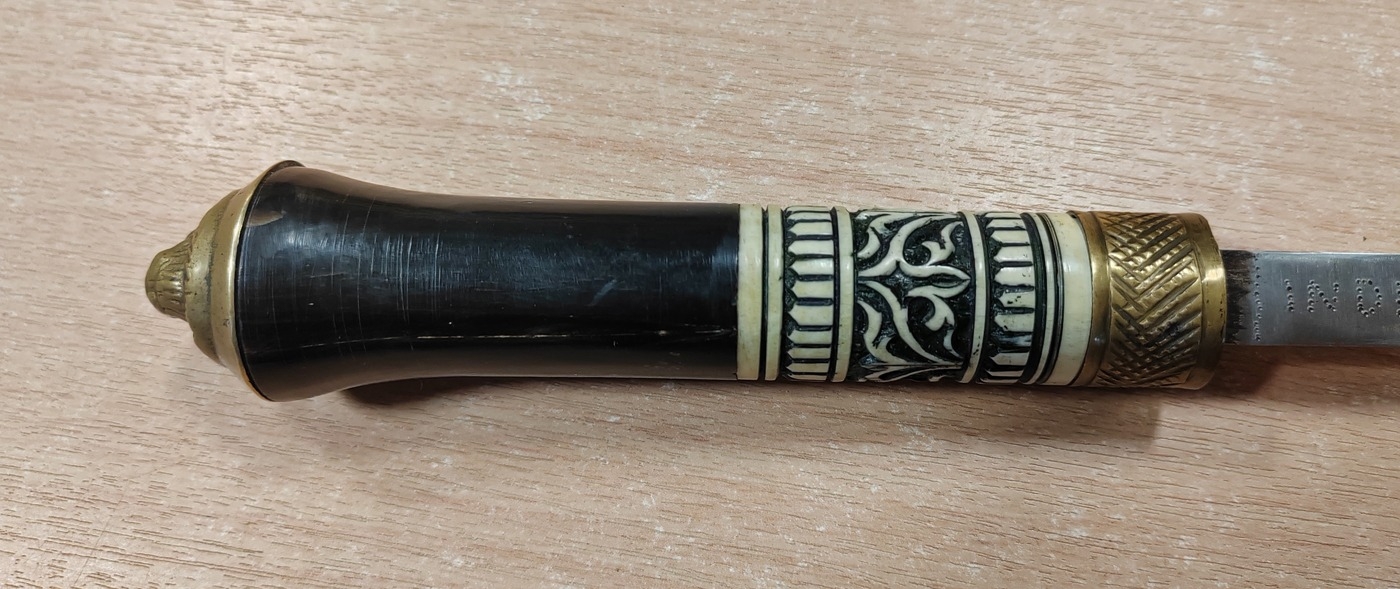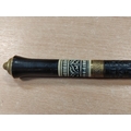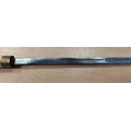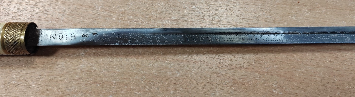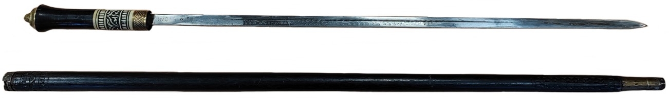 Indian sword cane, ricasso marked India with pattern to 70% of blade, raised brass Lion head on the butt of the handle (twists), brass 'twist and lock' mechanism to lock blade into place, slight twist to blade with some scratches otherwise very fine. (Tube) BUYER MUST COLLECT.