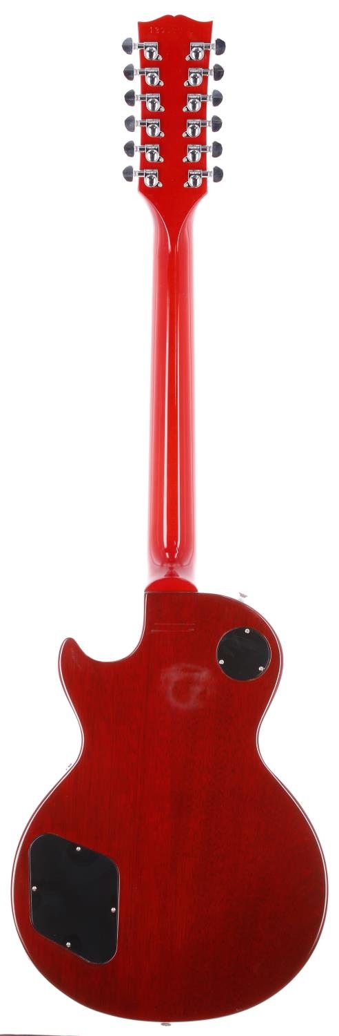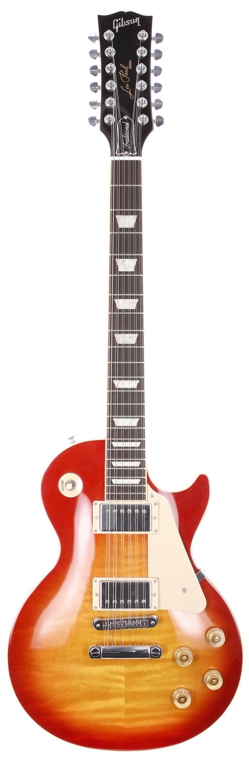 2012 Gibson Les Paul Traditional twelve string electric guitar, made in USA; Body: cherry sunburst finished plain maple top upon cherry mahogany back, light nitro stand burn to upper back; Neck: mahogany; Fretboard: ebony; Frets: good; Electrics: working; Hardware: good; Case: original hard case with papers; Weight: 4.49kg; Overall condition: very good