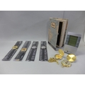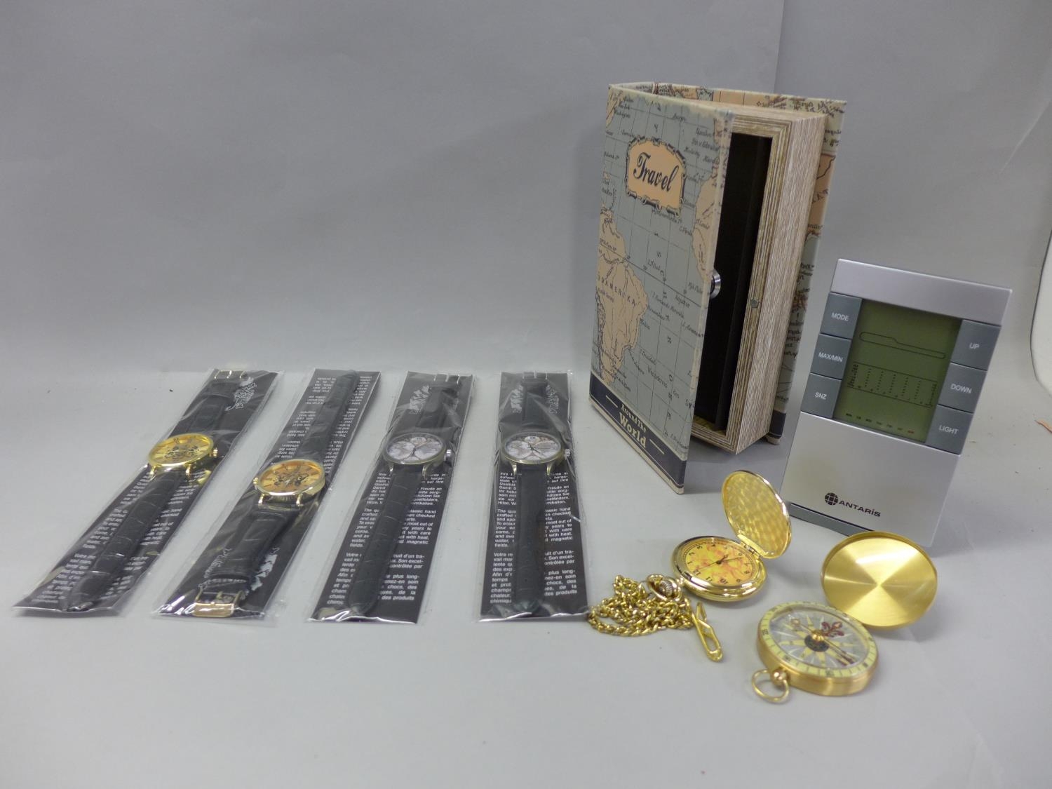 A compass, a weather station, a travel safe, a pocket watch and four wristwatches