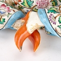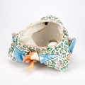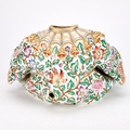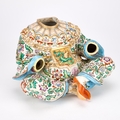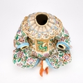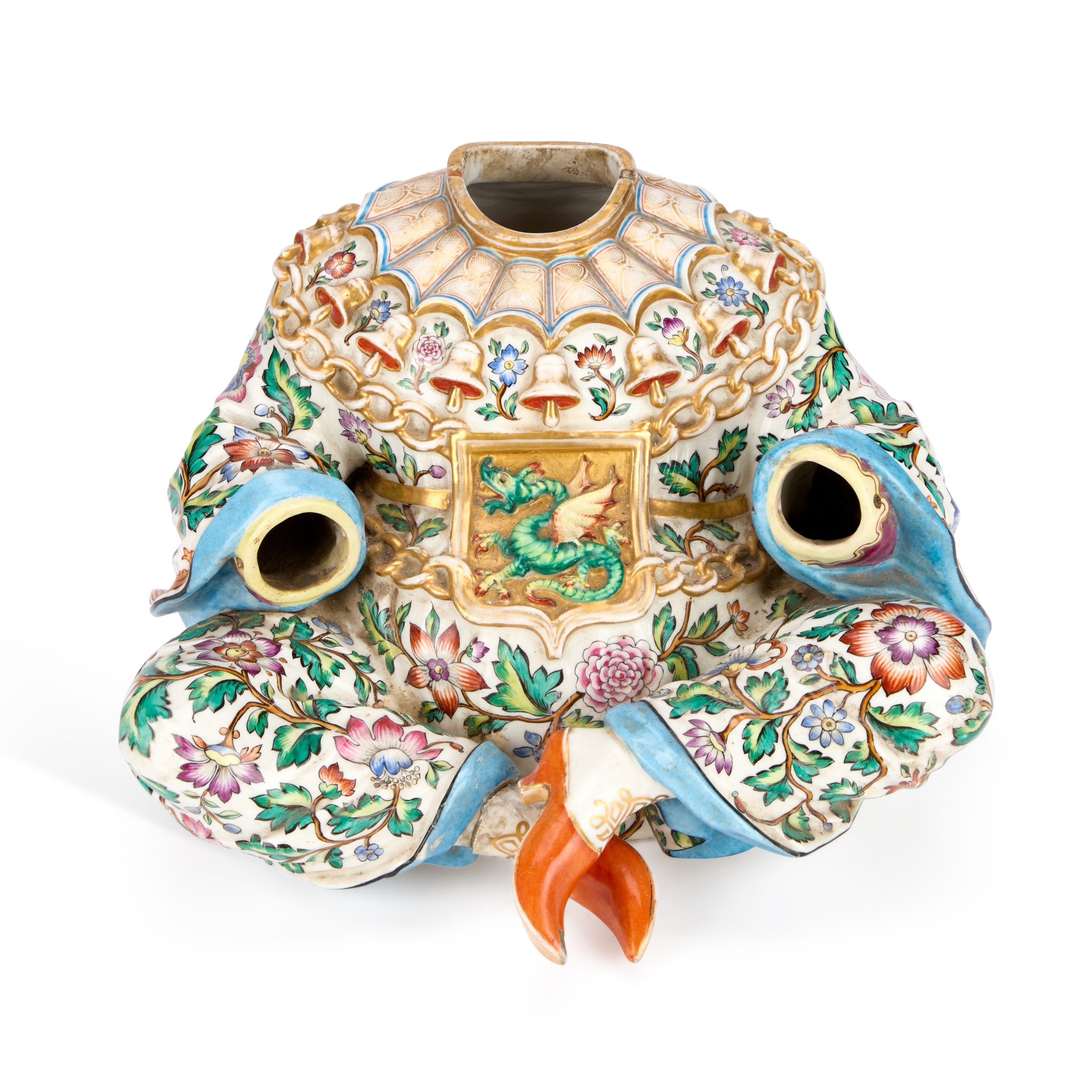 modelled seated cross-legged and wearing gilt chains, brightly enamelled with flowering foliage, unmarked. 17cm high