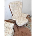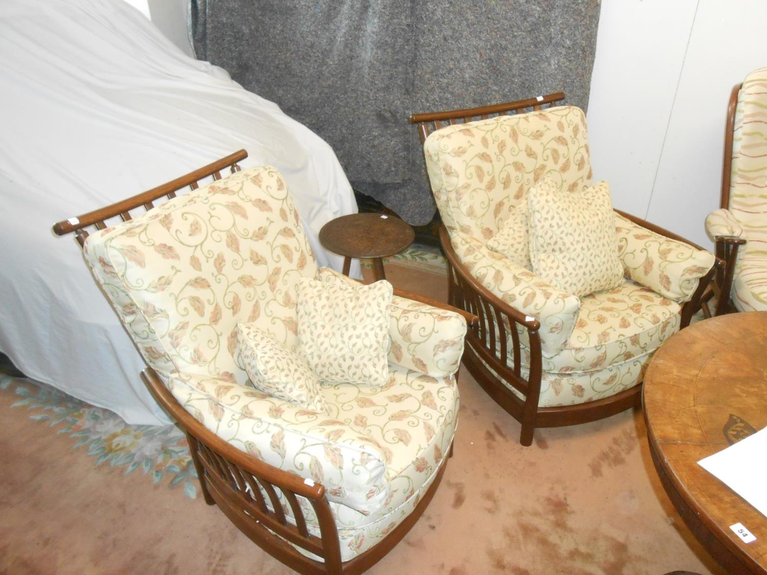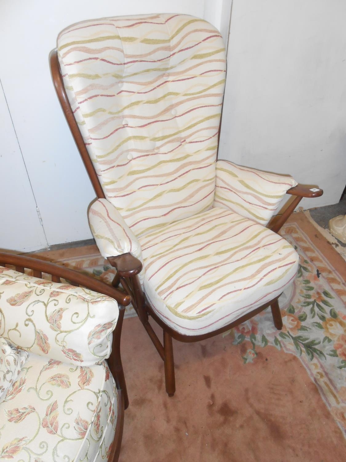 A lady's modern dark elm armchair, a matching gentleman's armchair and an Ercol dark elm Evergreen pattern armchair