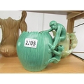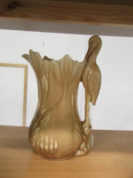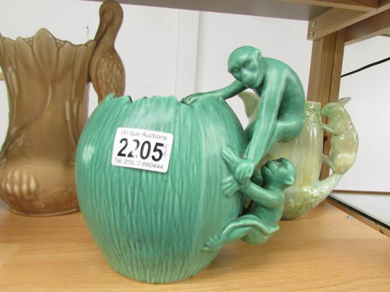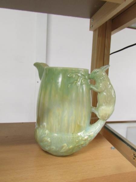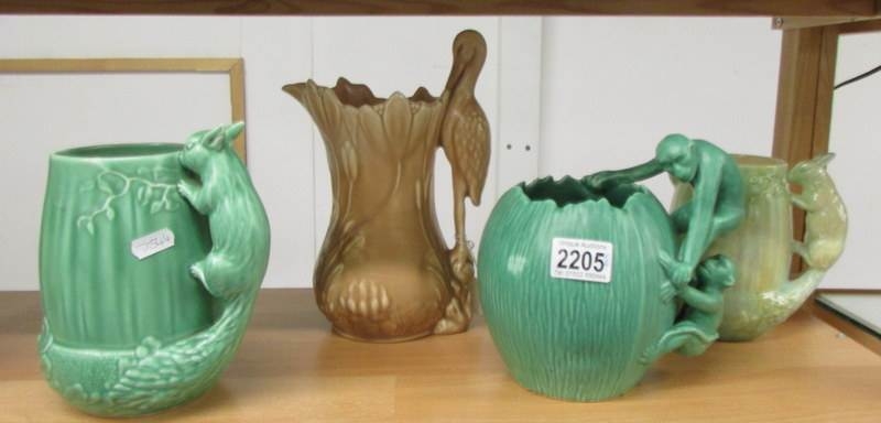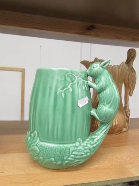 A Sylvac jug with stork handle, 2 Sylvac jugs with squirrel handles and a green jug with monkey handle.