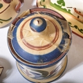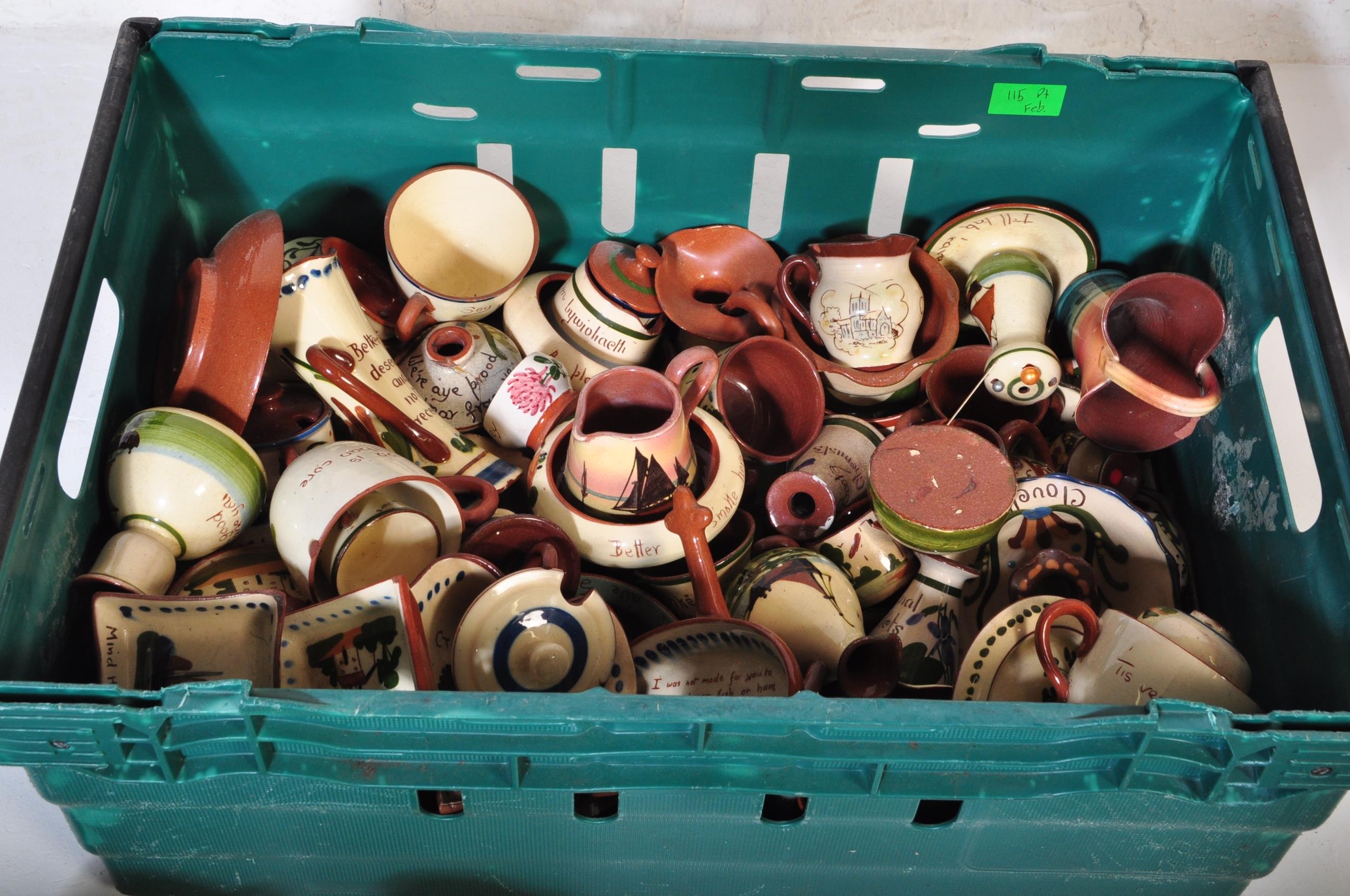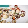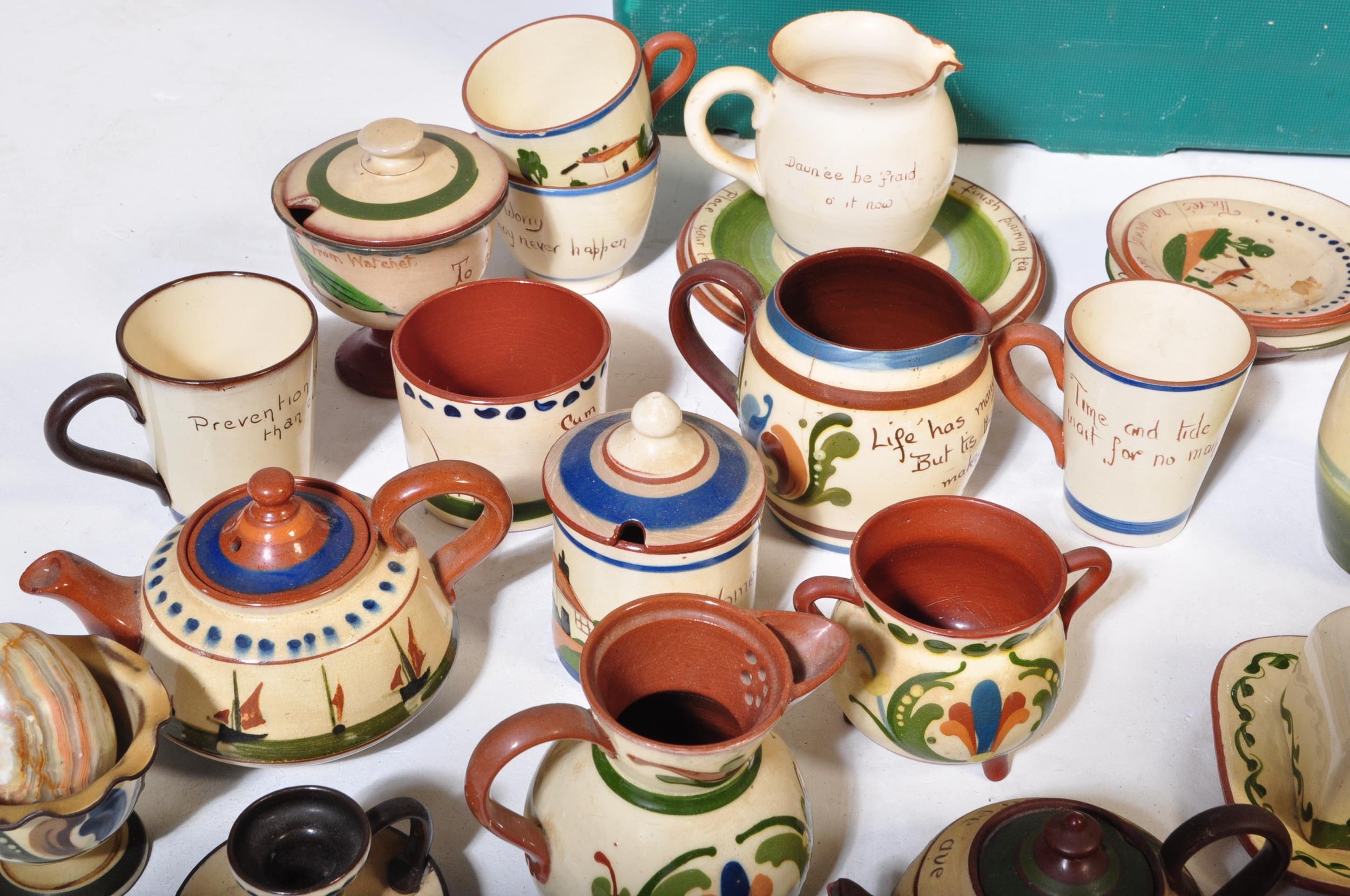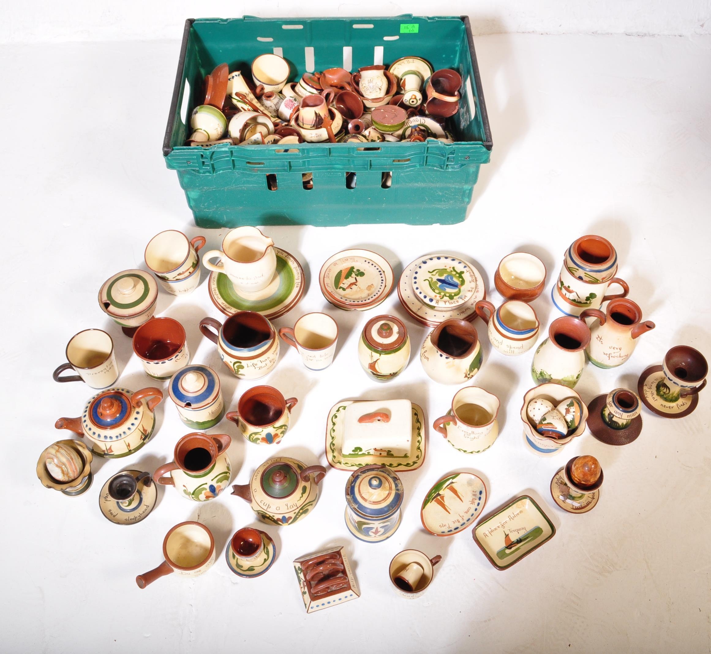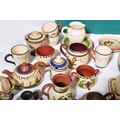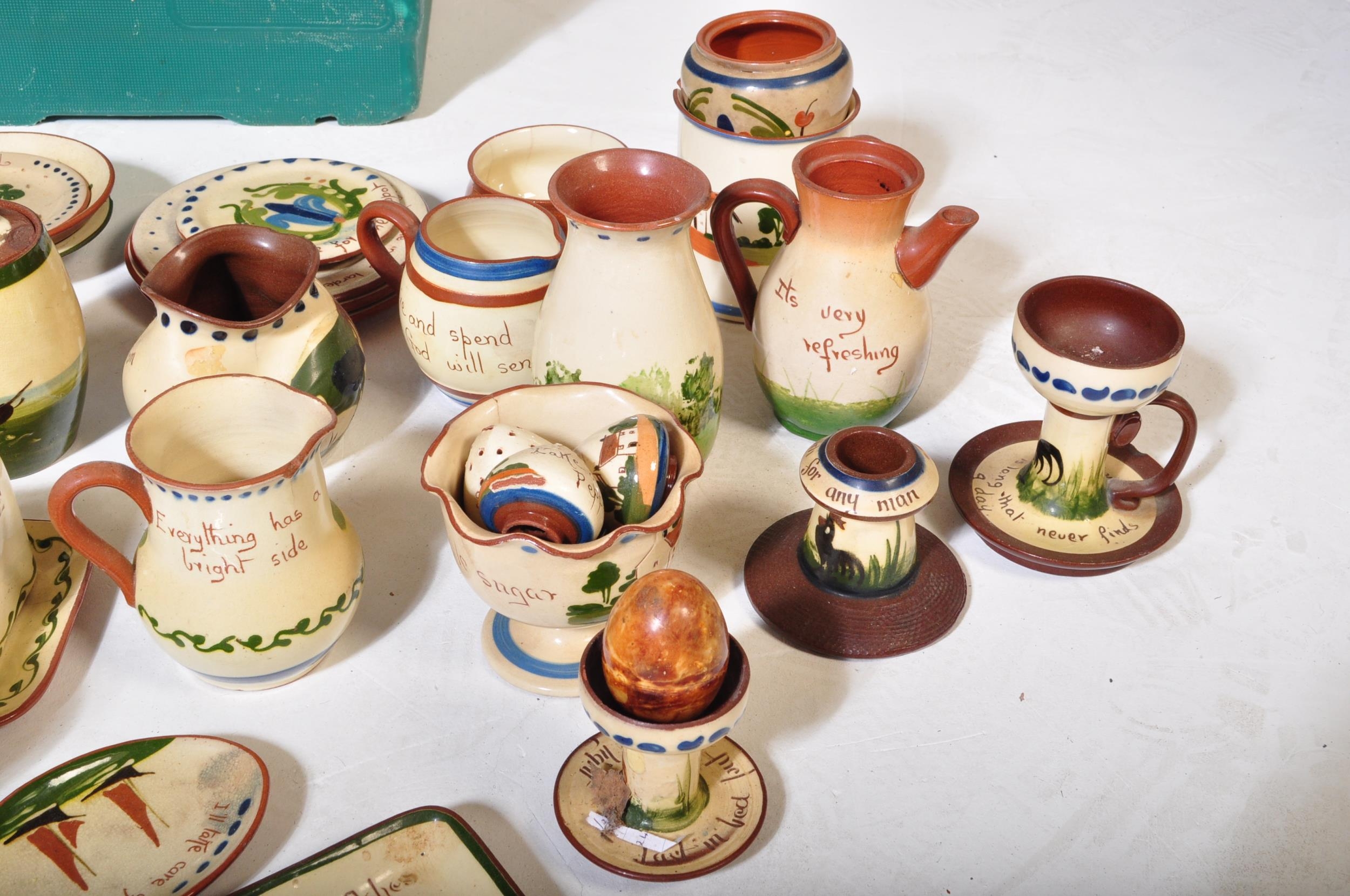 Torquay & Dartmouth pottery tea service set. Large collection of vintage 20th Century ceramic pottery items to include; handle jugs, jars, cups, mugs, teapot, lidded containers, plates, candle holders, salt & pepper shakers, cheese cover and ornaments. With hand painted decoration of flowers and cottages, with sayings in a stoneware brown colourway. Some items with stamps to underside.