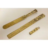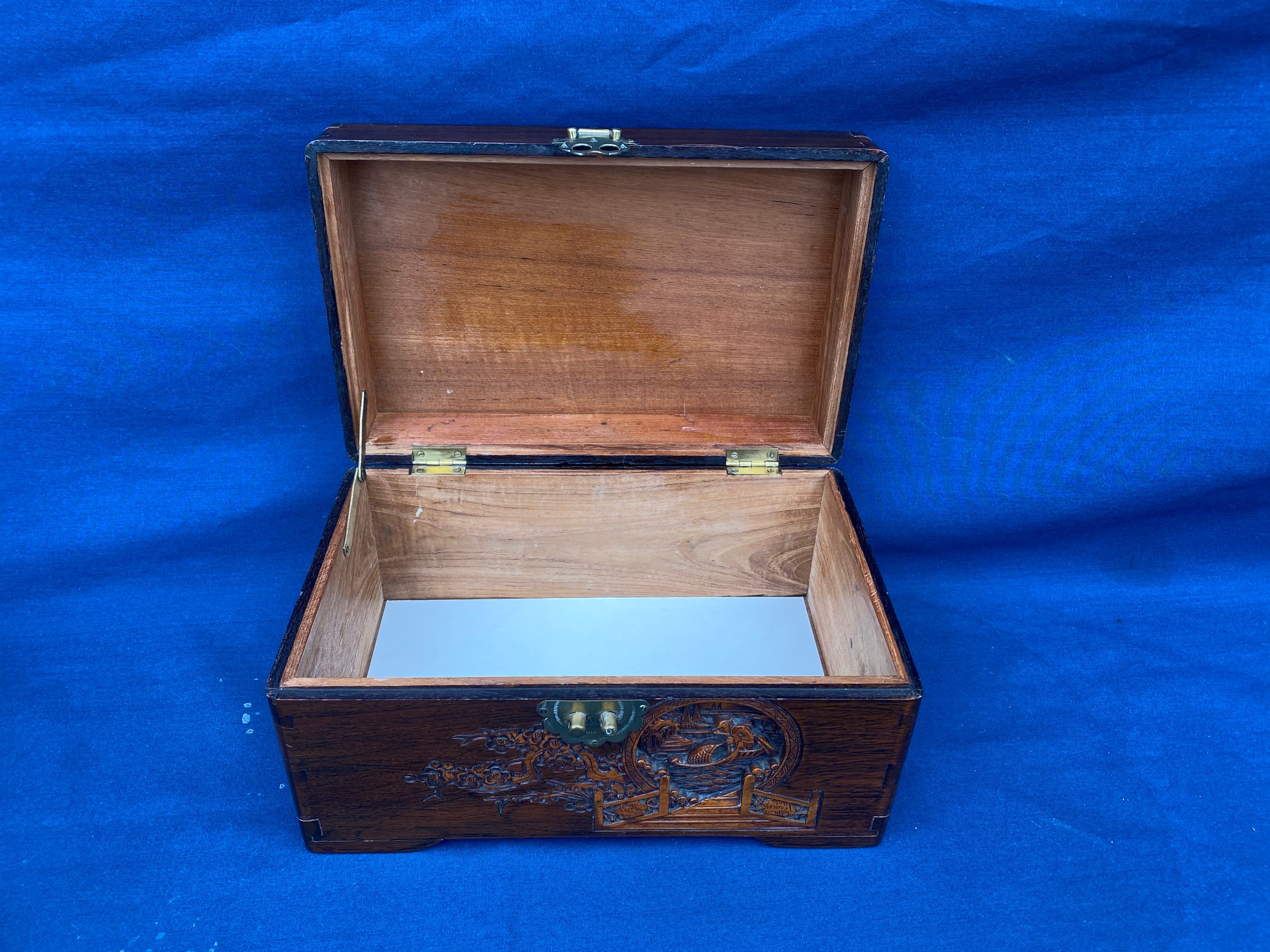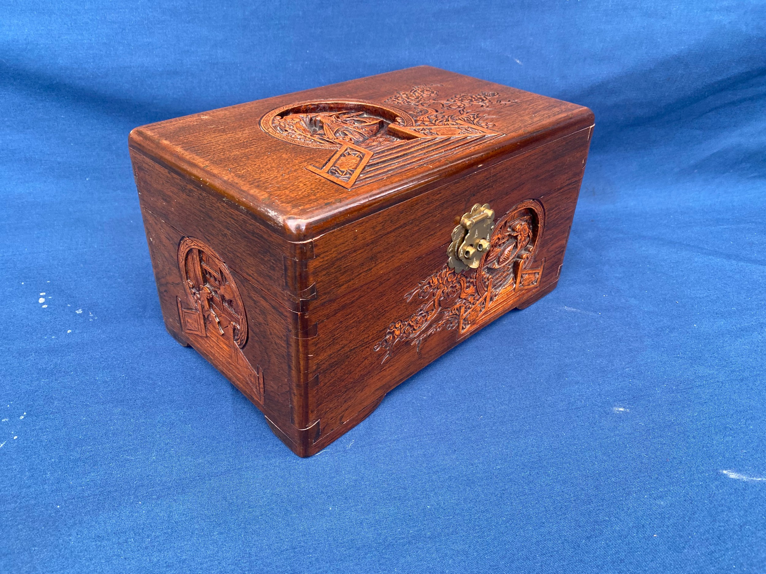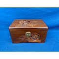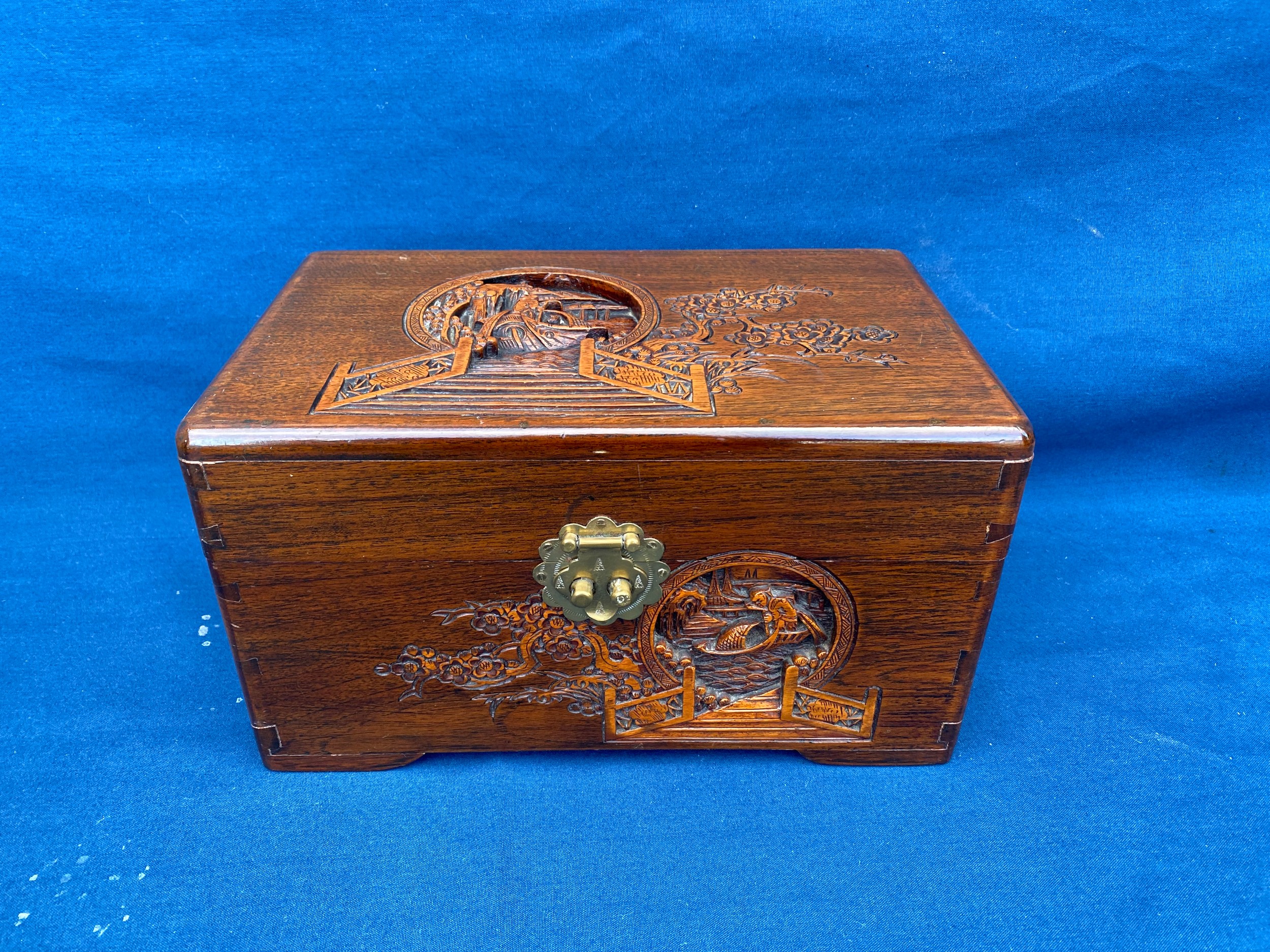 An eastern carved table top box, carved with boating scenes and landscapes -