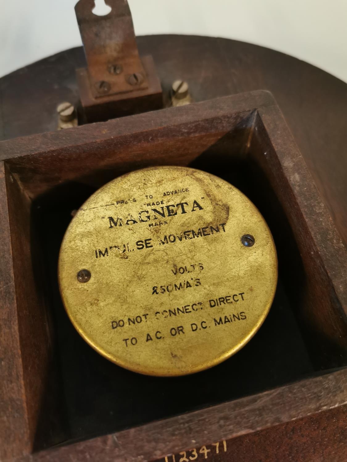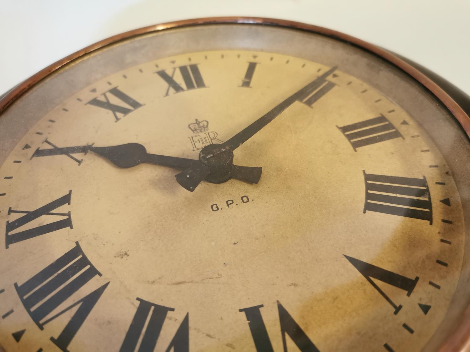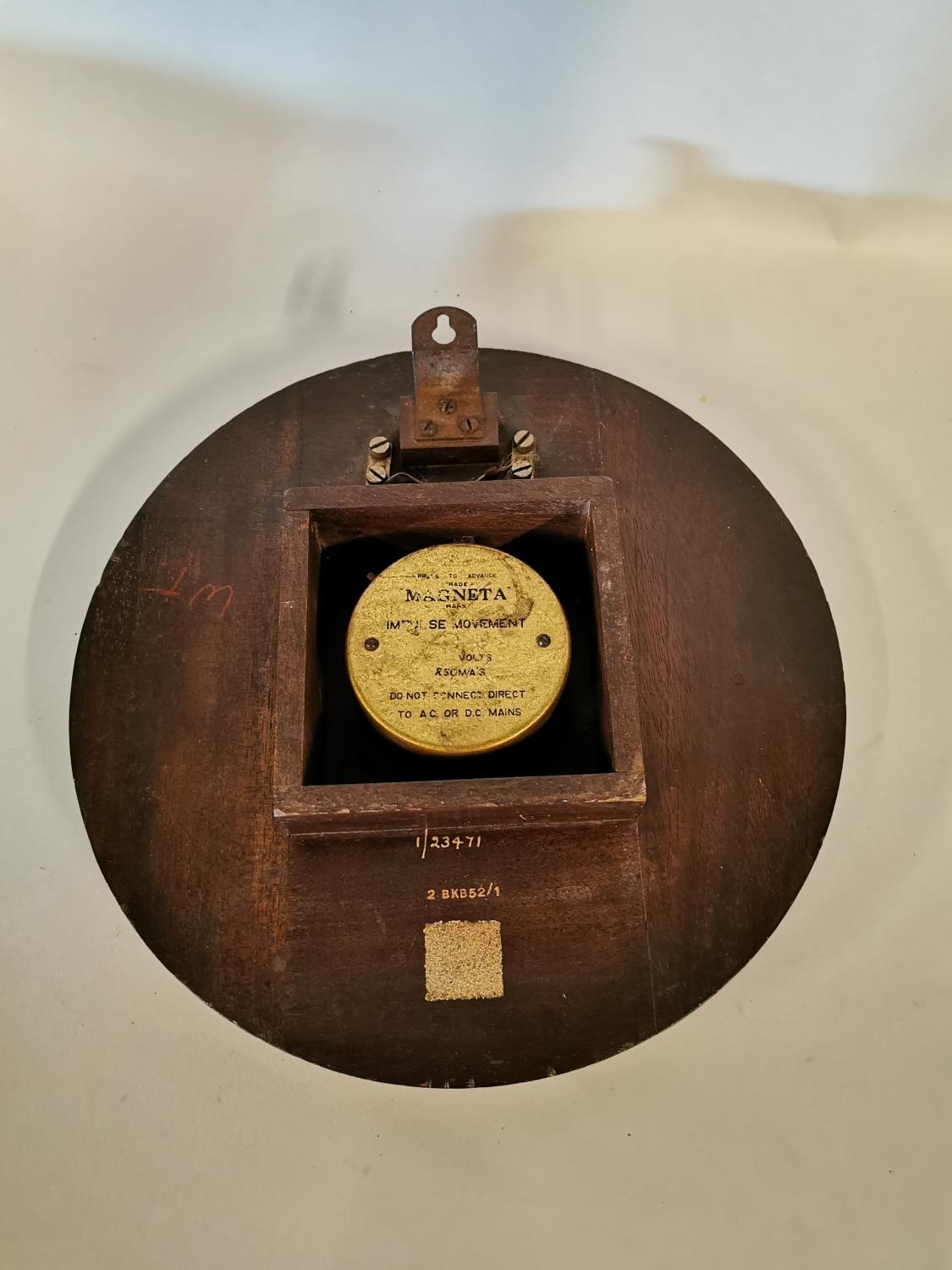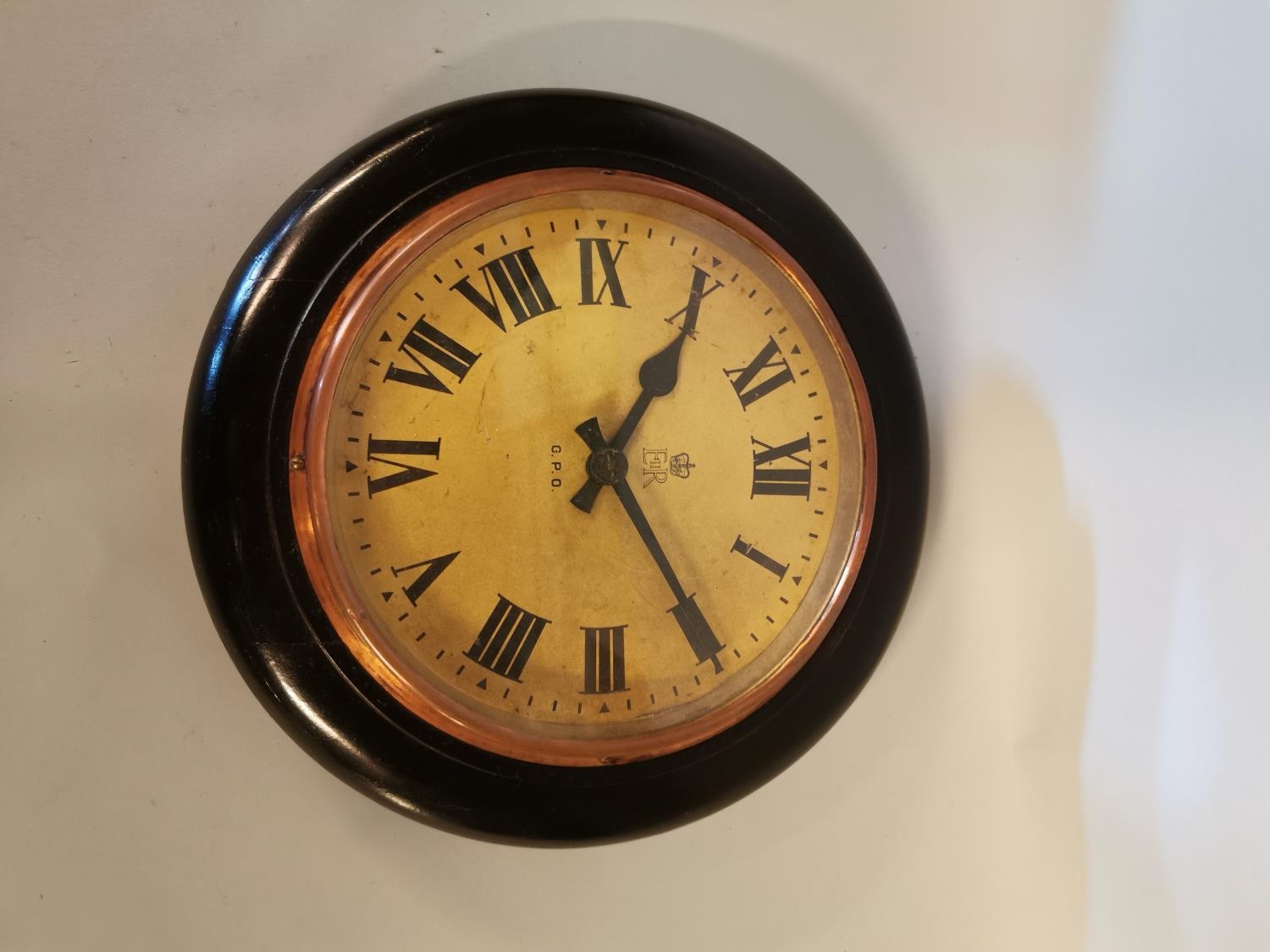 Edwardian mahogany GPO wall clock with painted dial {29 cm Dia.}.