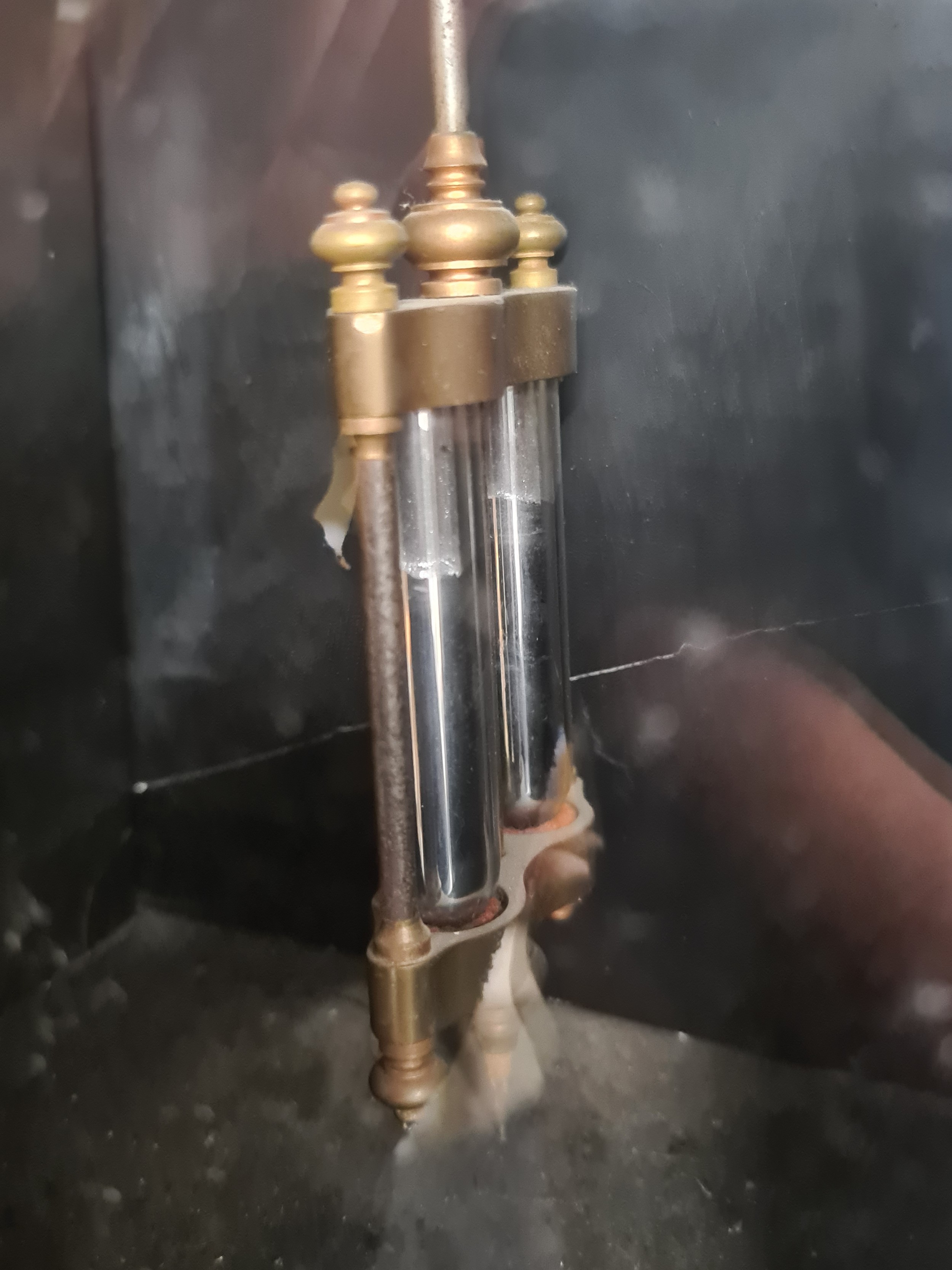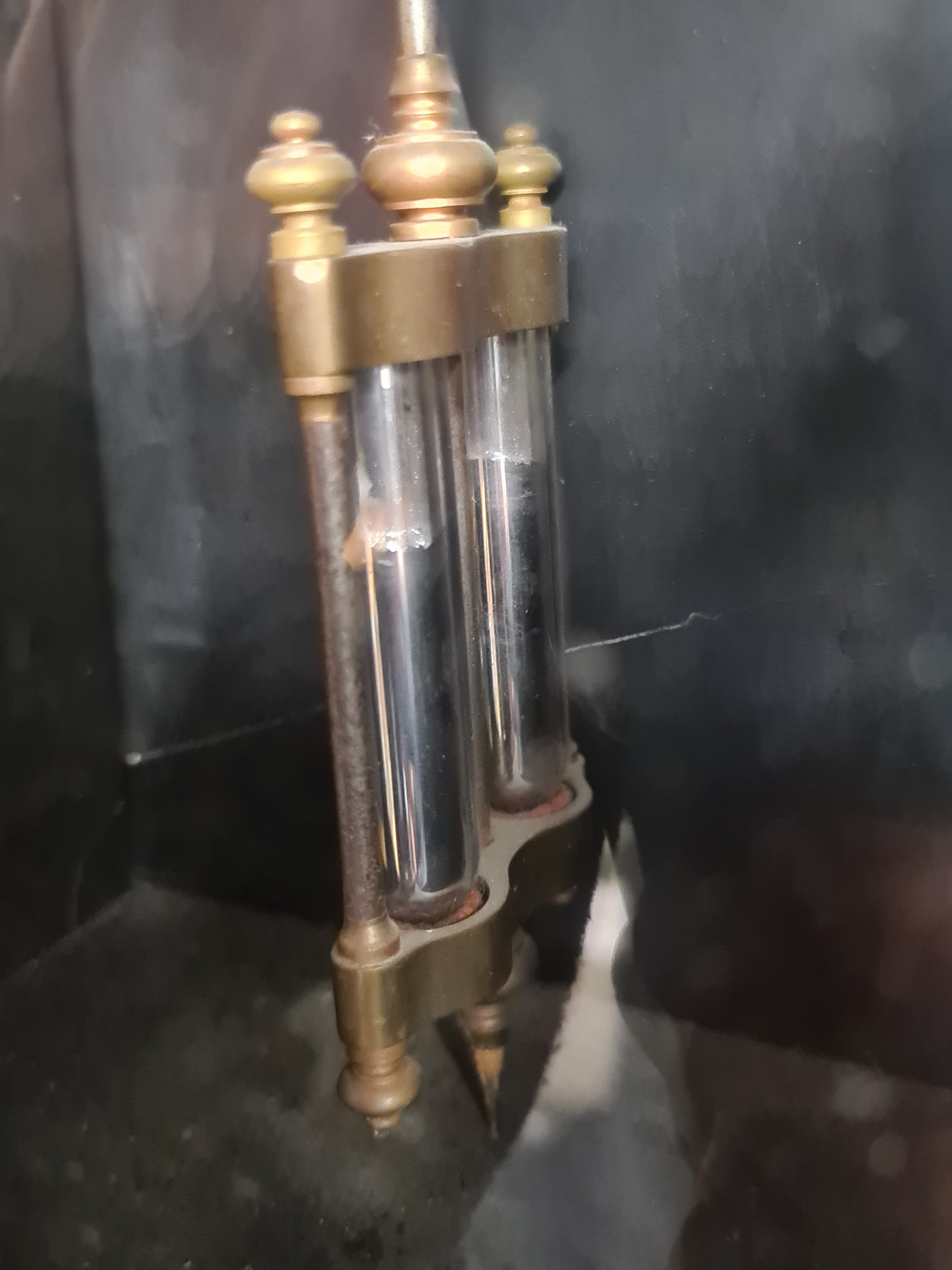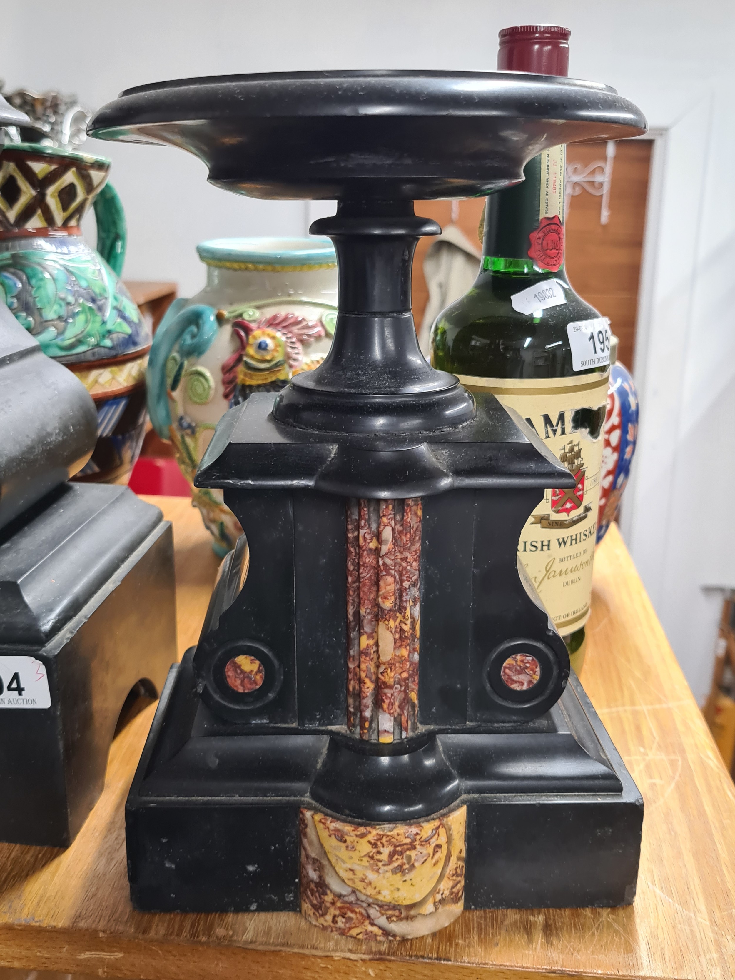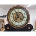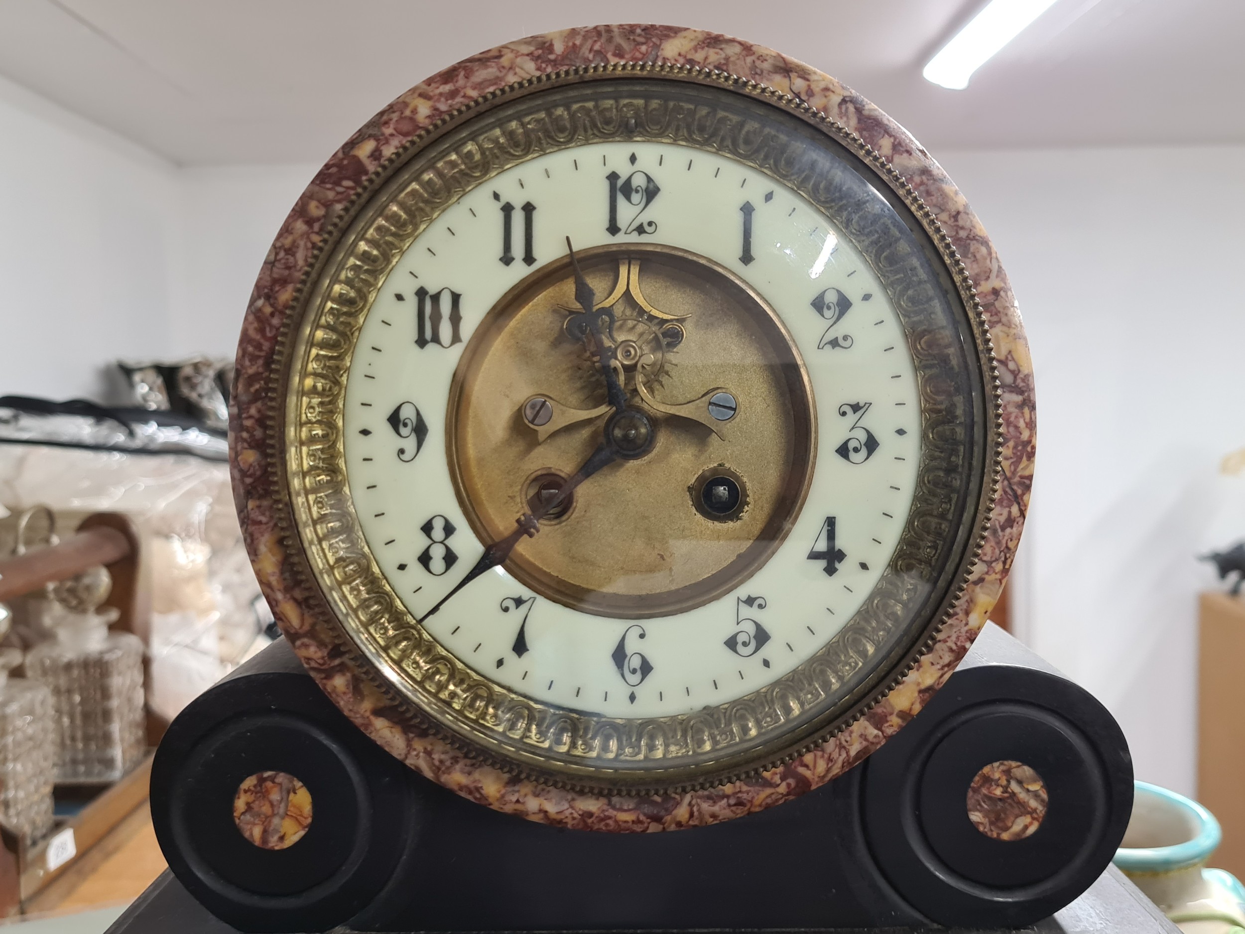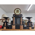 Star Lot: A fantastic 19th century French antique marble clock and garniture set with rare double mercury pendulum and original key. Featuring black Belgian marble with Breccia marble inserts and a mercury balance wheel to clock mechanism. An incredible set to have.