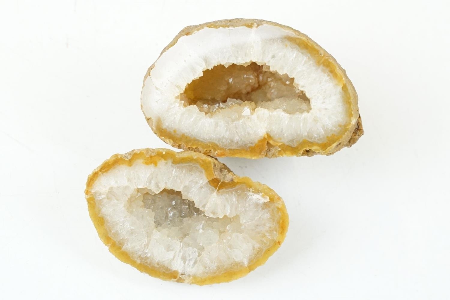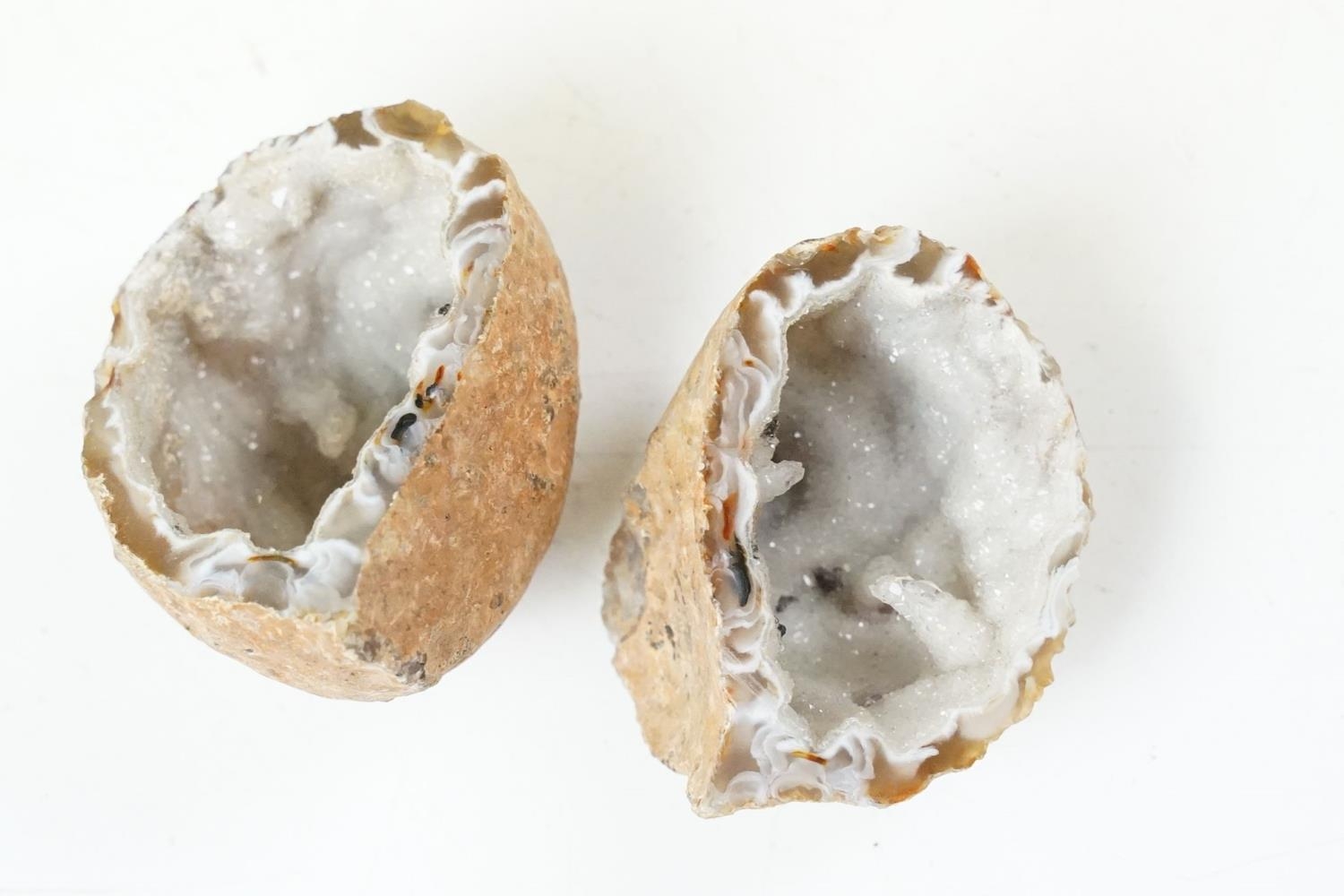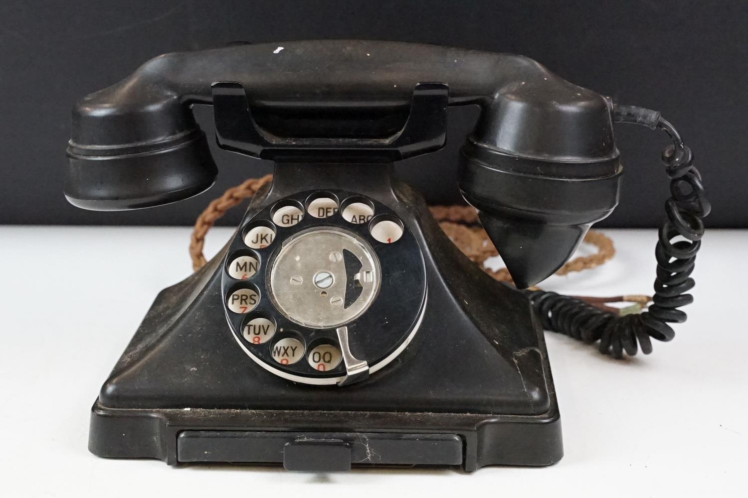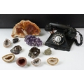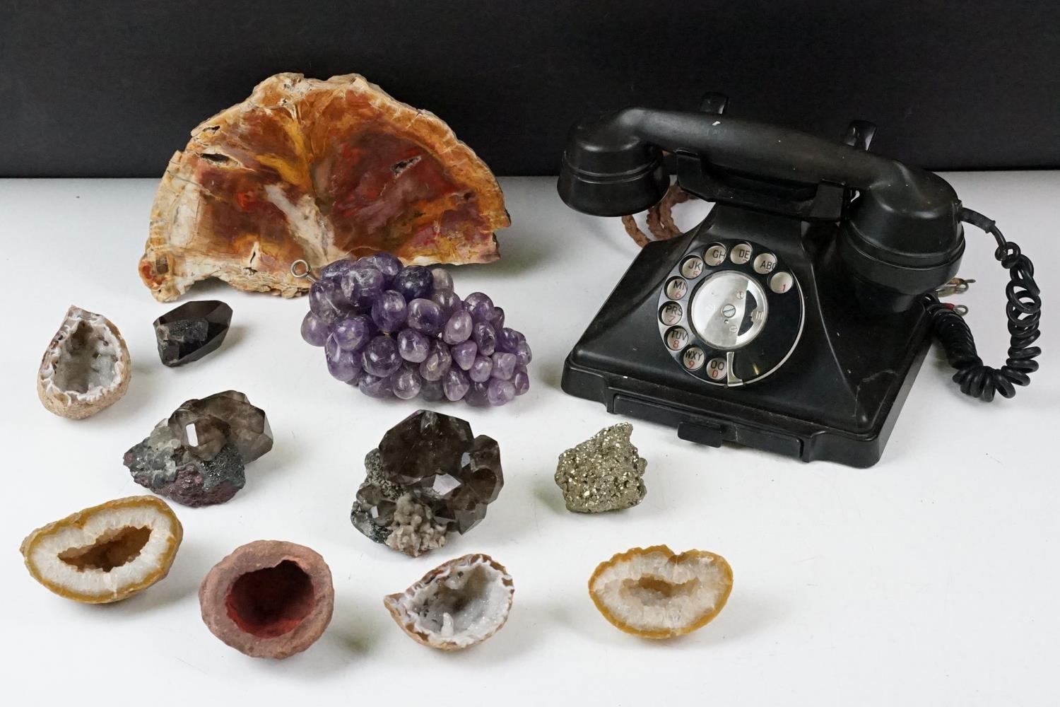 Collection of mineral specimens to include geode, pyrite, crystals and amethyst grapes. Together with a bakelite ring dial telephone.