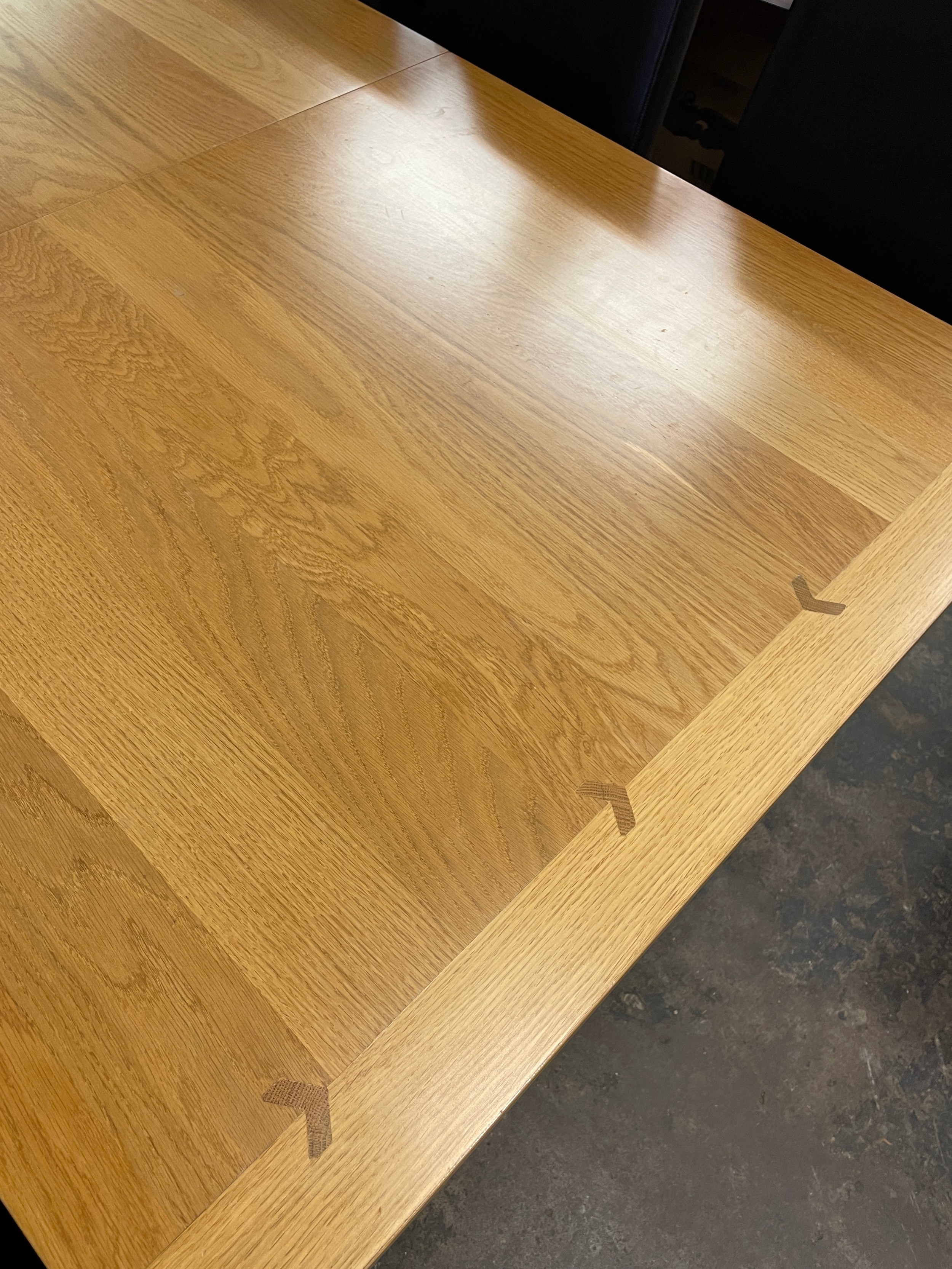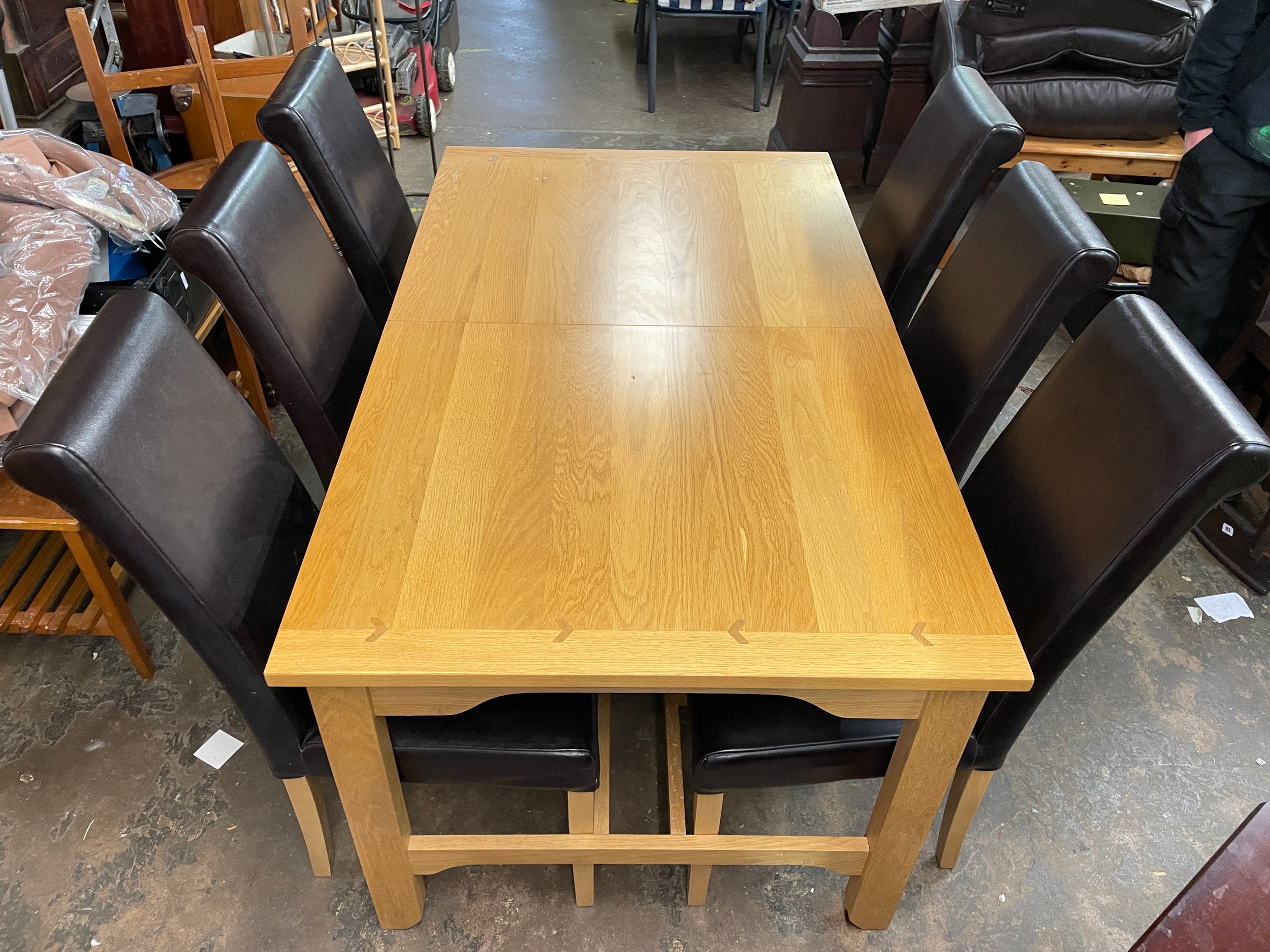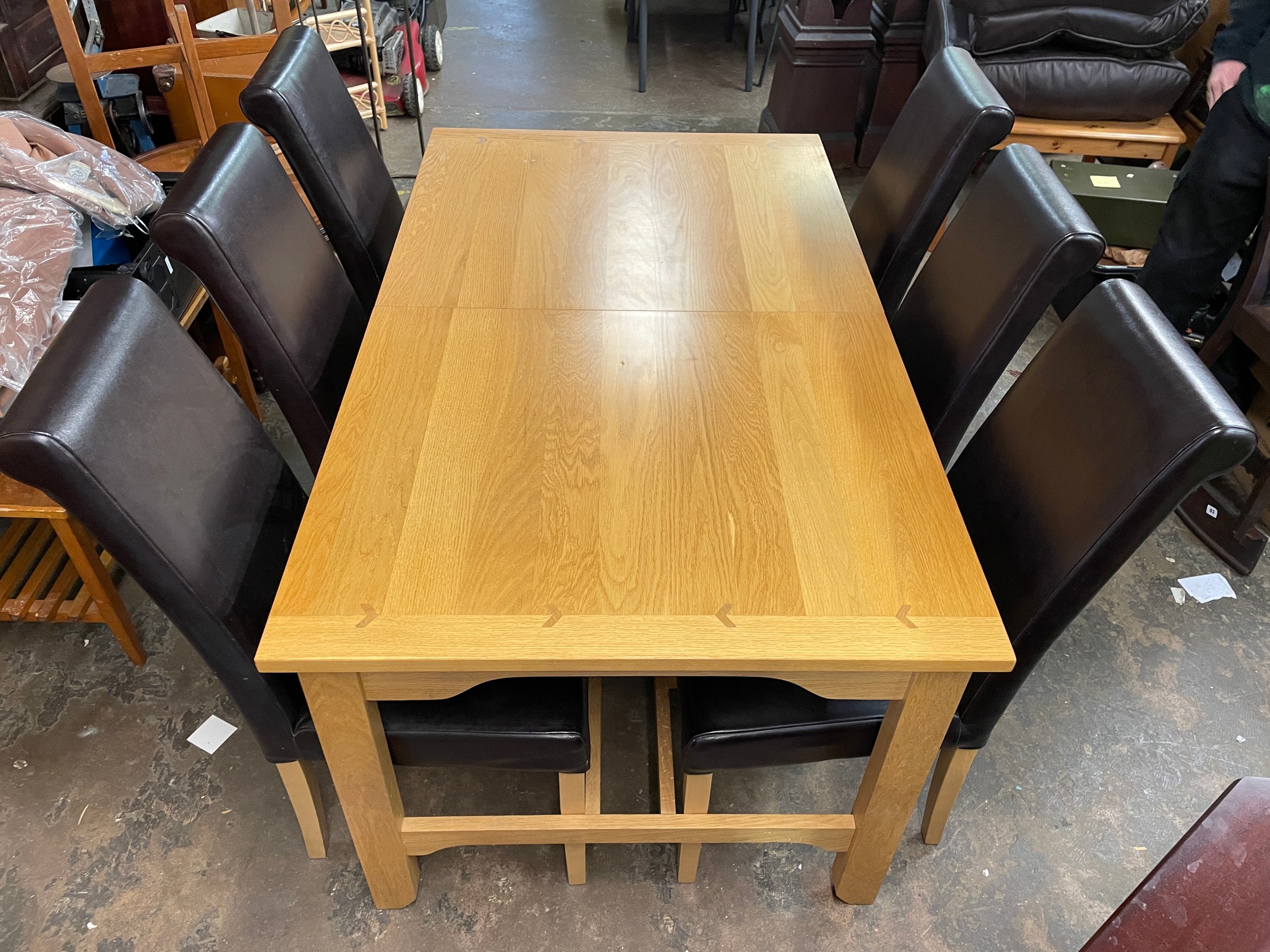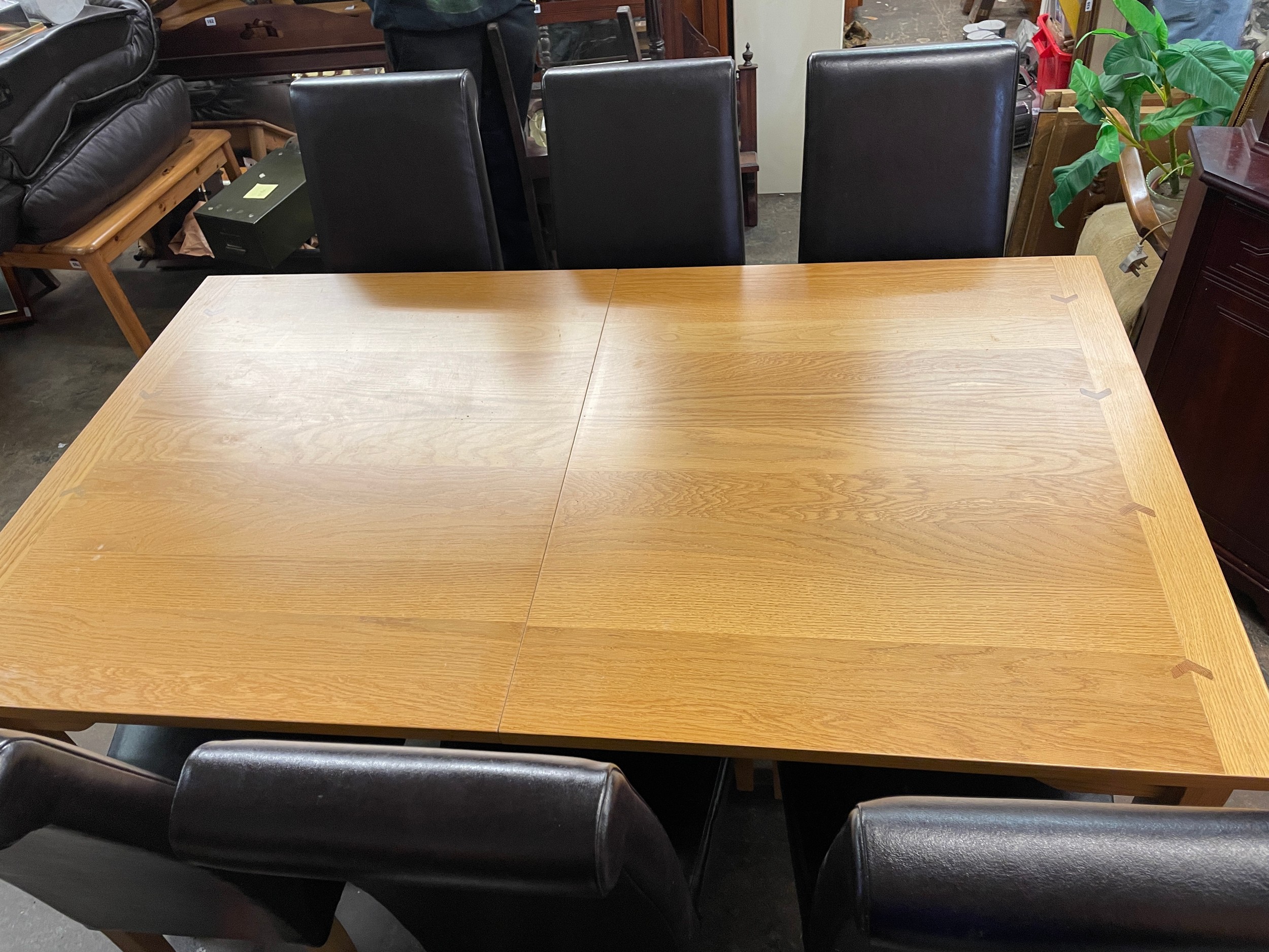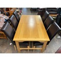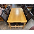 GOOD QUALITY OAK DINING TABLE WITH SIX TAN HIGH BACK CHAIRS