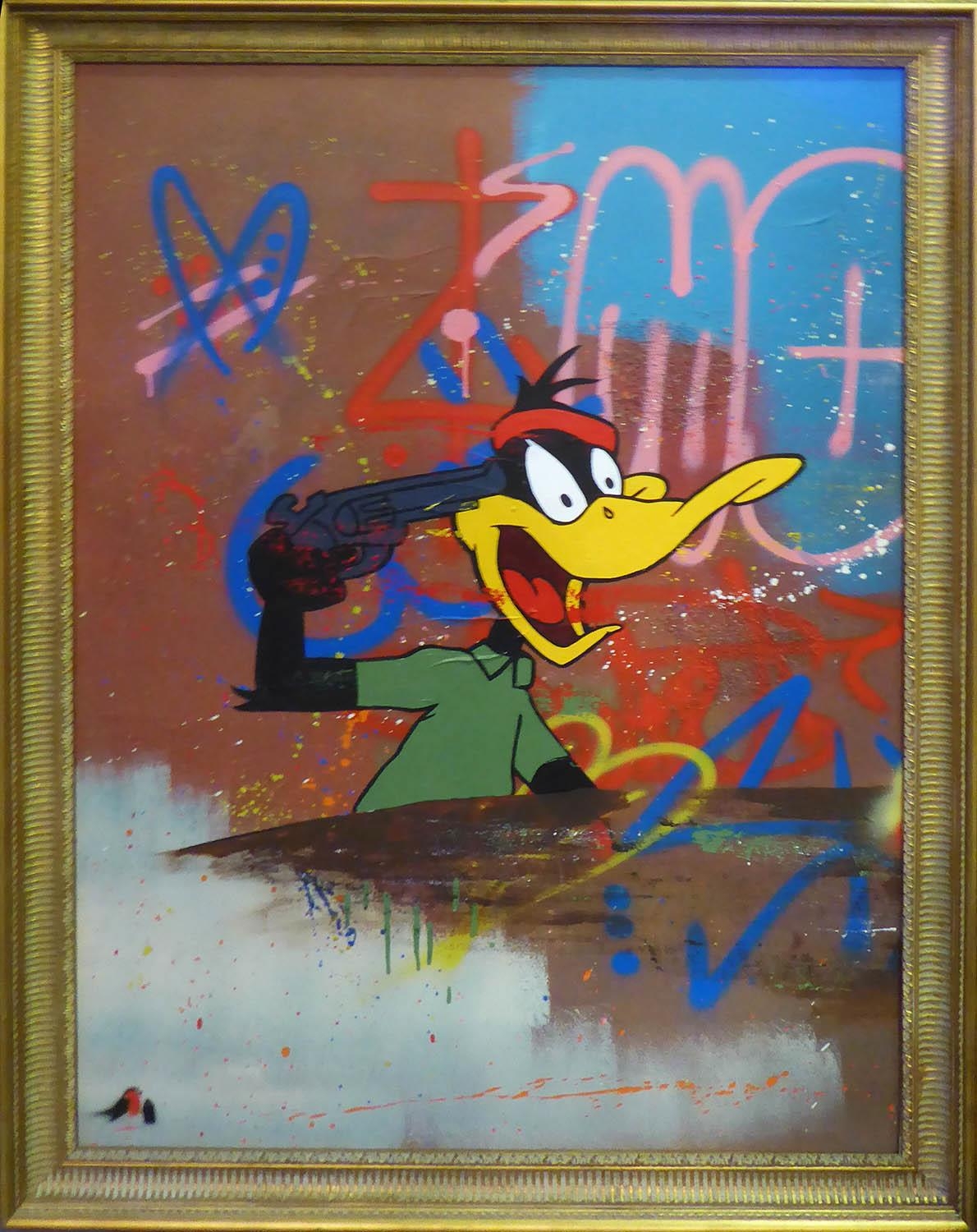 ROBIN WARD (Contemporary Irish-US based) 'Daffy', spray paint, oil, and acrylic on canvas, monogrammed, 120cm x 80cm, framed.