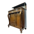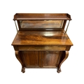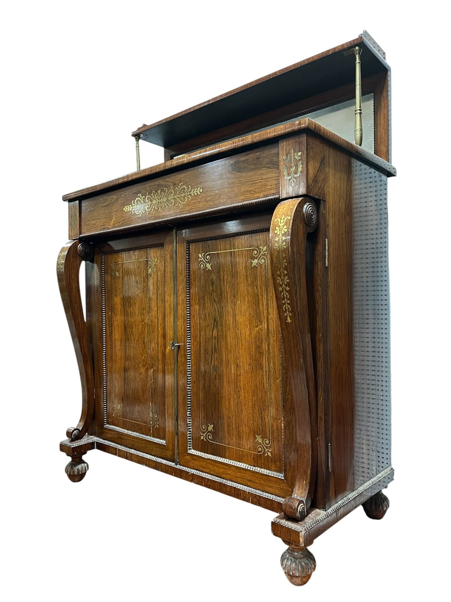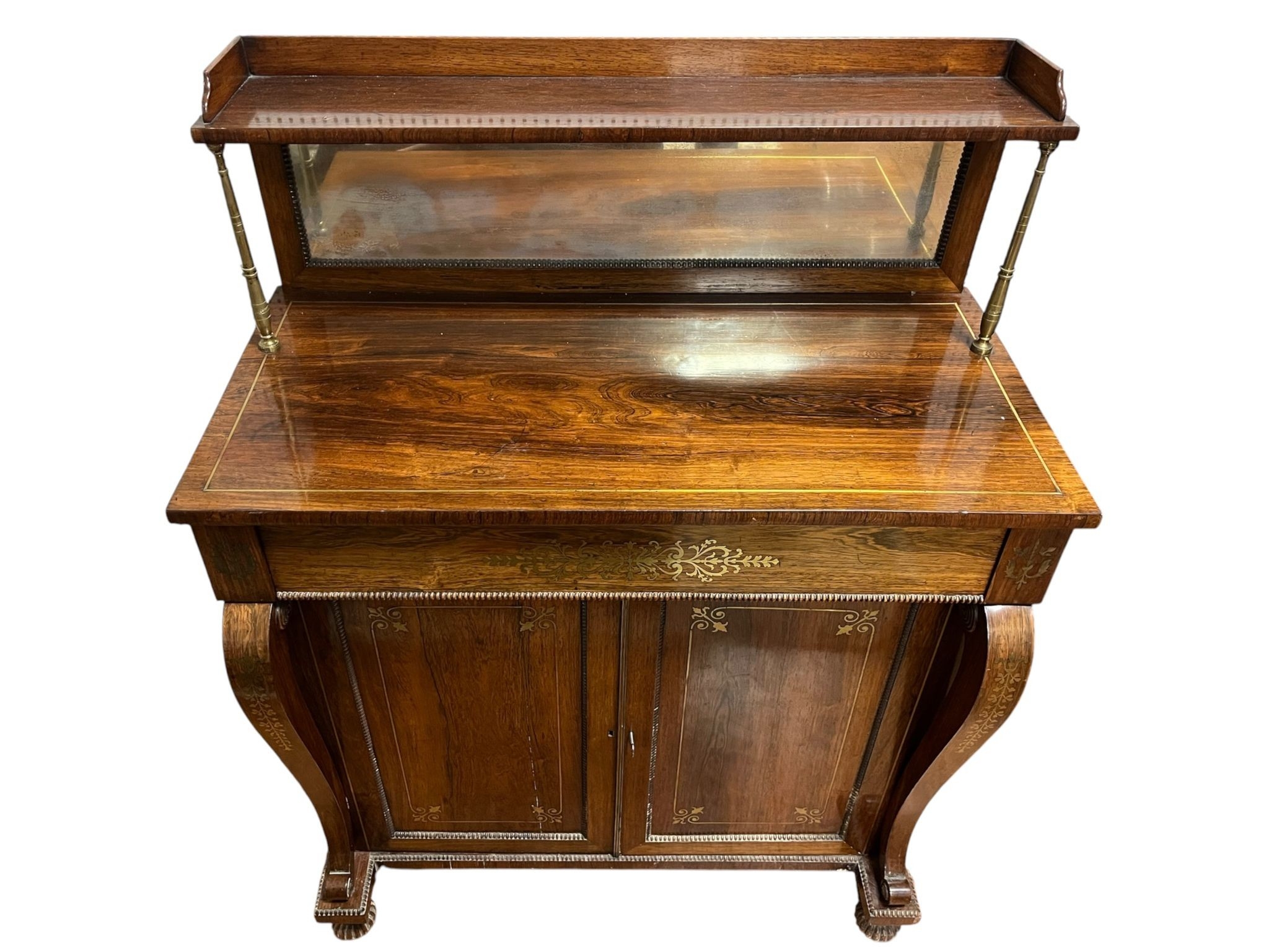 A GOOD REGENCY MAHOGANY AND BRASS INLAID SIDE CABINET the superstructure with moulded shelf and mirrored back raised on gilt brass cylindrical columns above a frieze drawer and cupboards with front scroll supports on platform base with lobed bun feet 124cm (h) x 91cm (w) x 45cm (d)