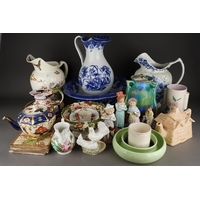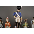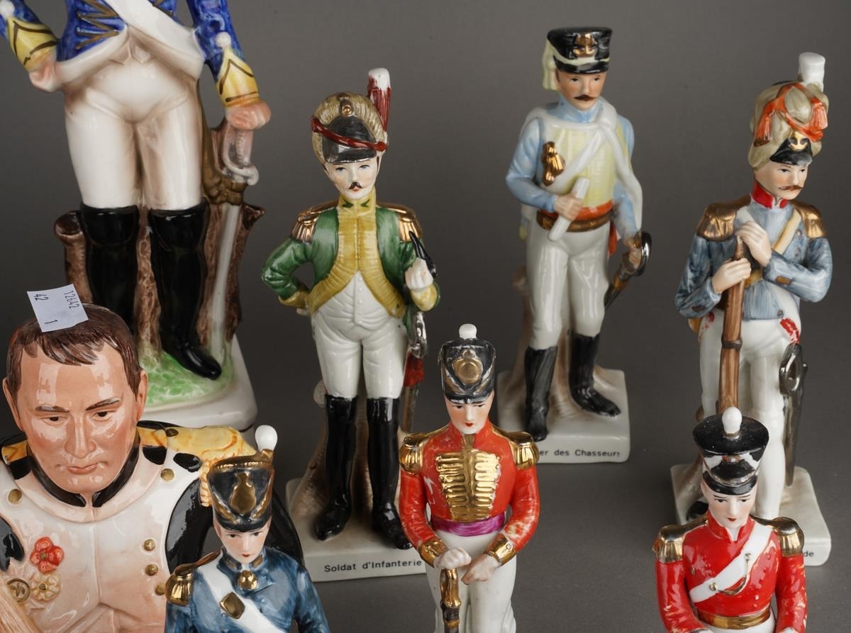 A set of six French porcelain Napoleonic soldiers including: Grenadier Guard, Cavalry Officer, Infantry Solidier, Hussar Officer, each titled in French, approx 22cm high together with six smaller Continental Napoleonic War soldiers including Black Watch, all unmarked, approx 17cm high; a novelty Prince Albert Own Hussars musical decanter, a novelty Leonard's Napoleon teapot etc [1 box]
