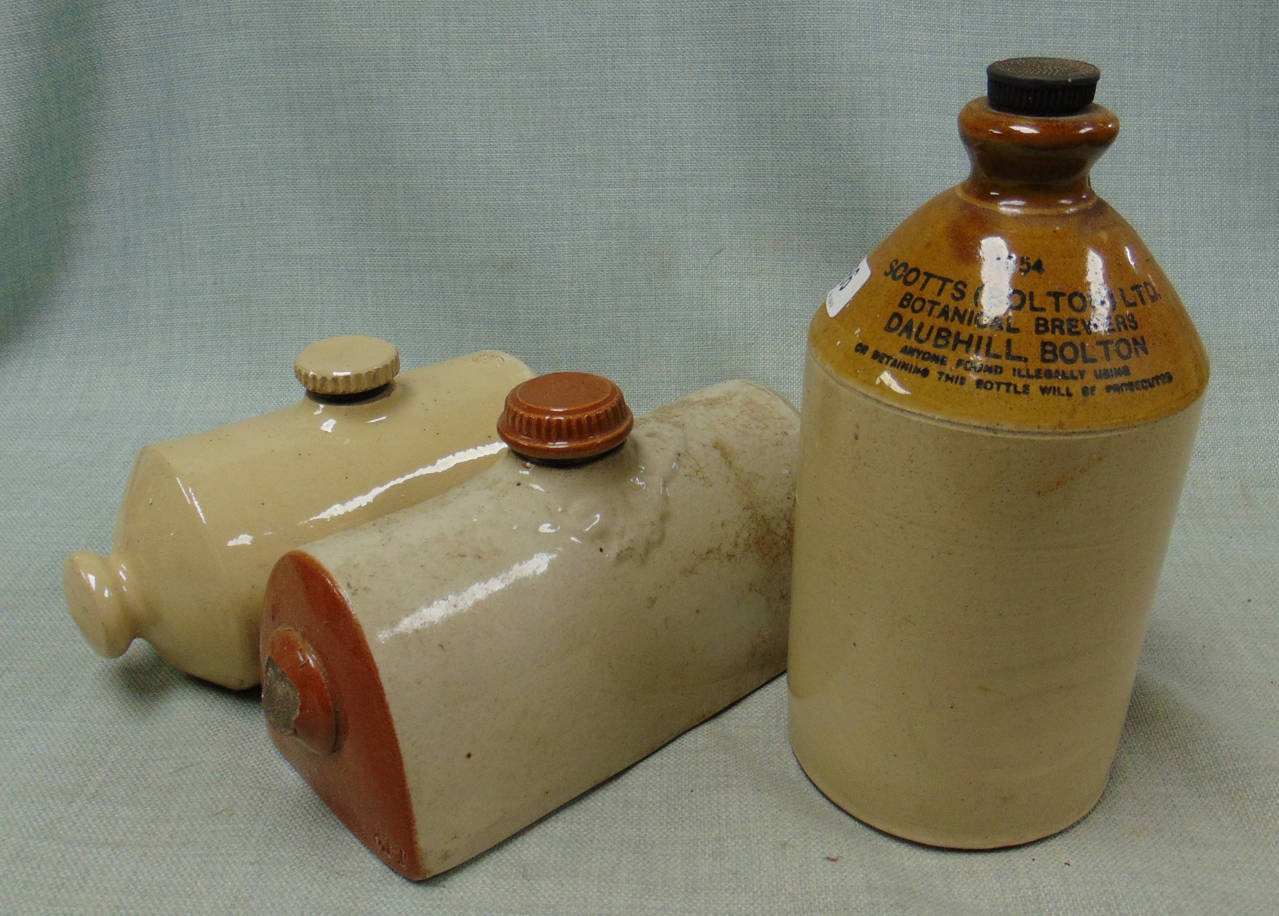 Stoneware Scotts Bolton Botanical brewery flagon and two bed warmers.