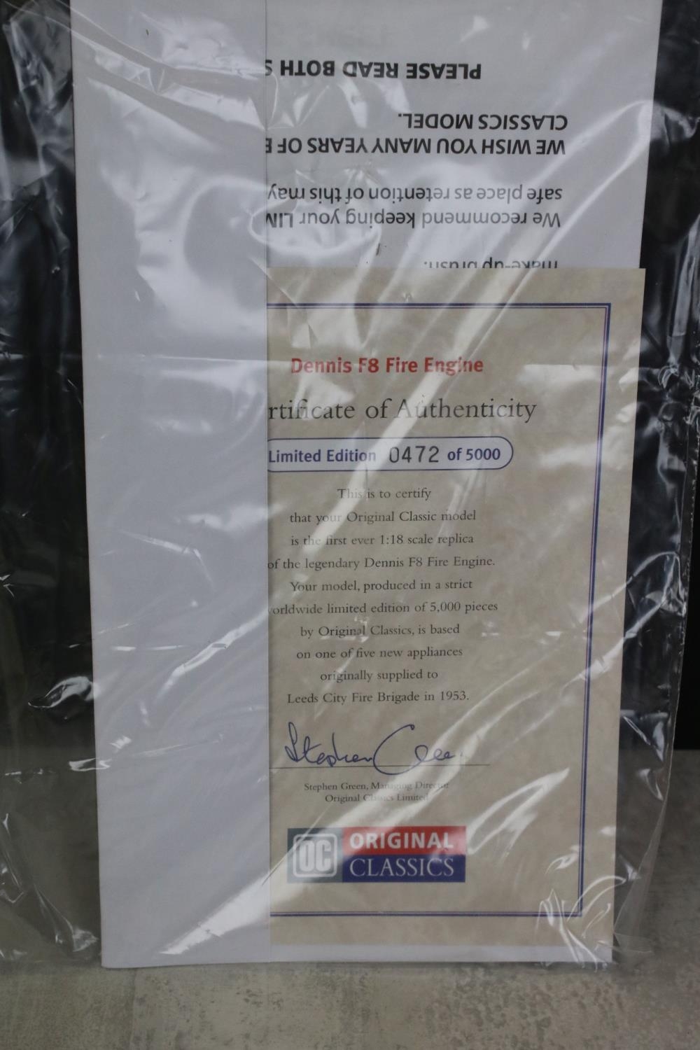 Boxed OC Original Classic ltd edn Dennis F8 Fire Engine diecast model with certificate (0472/5000), vg