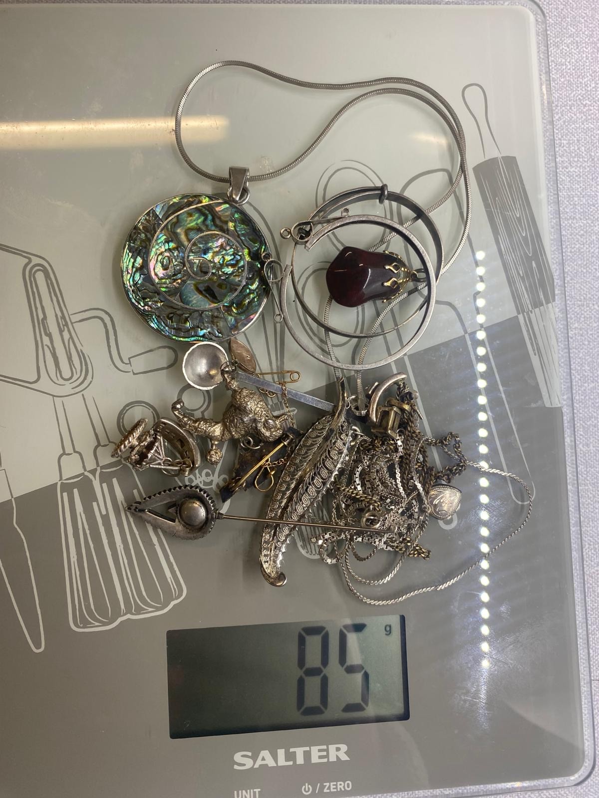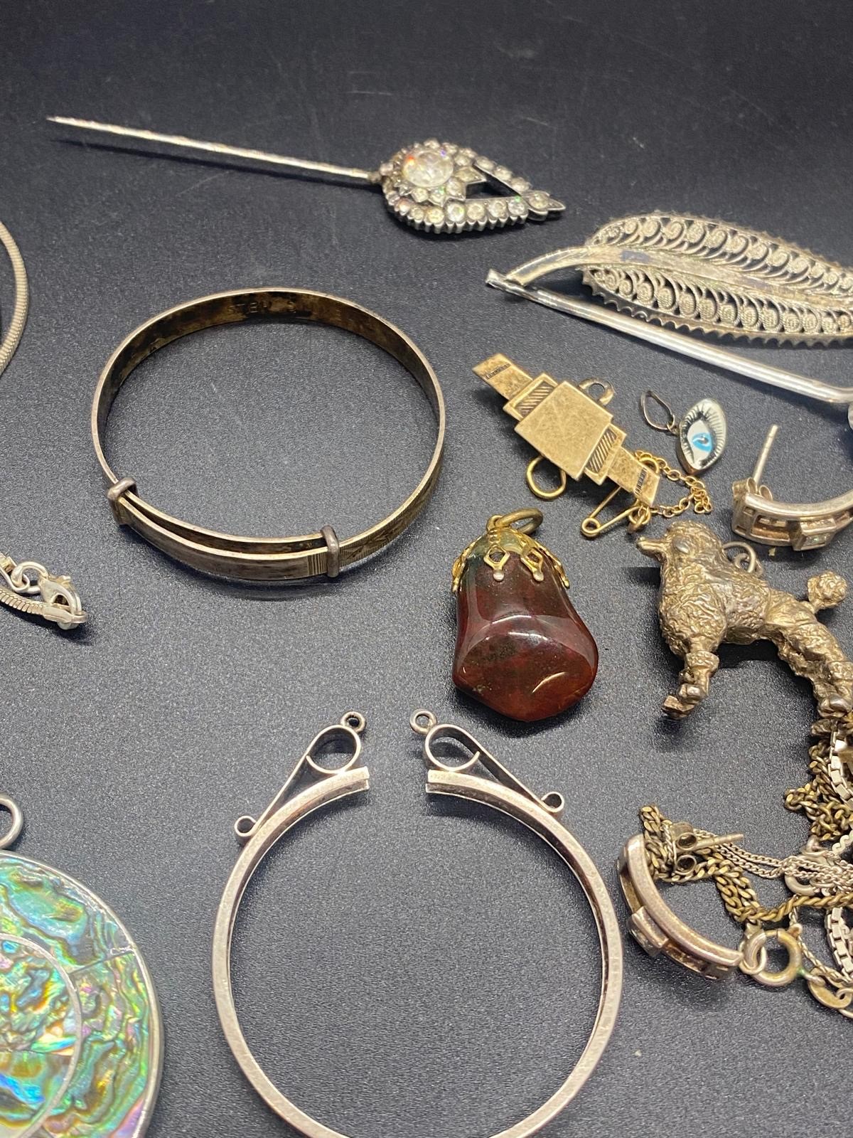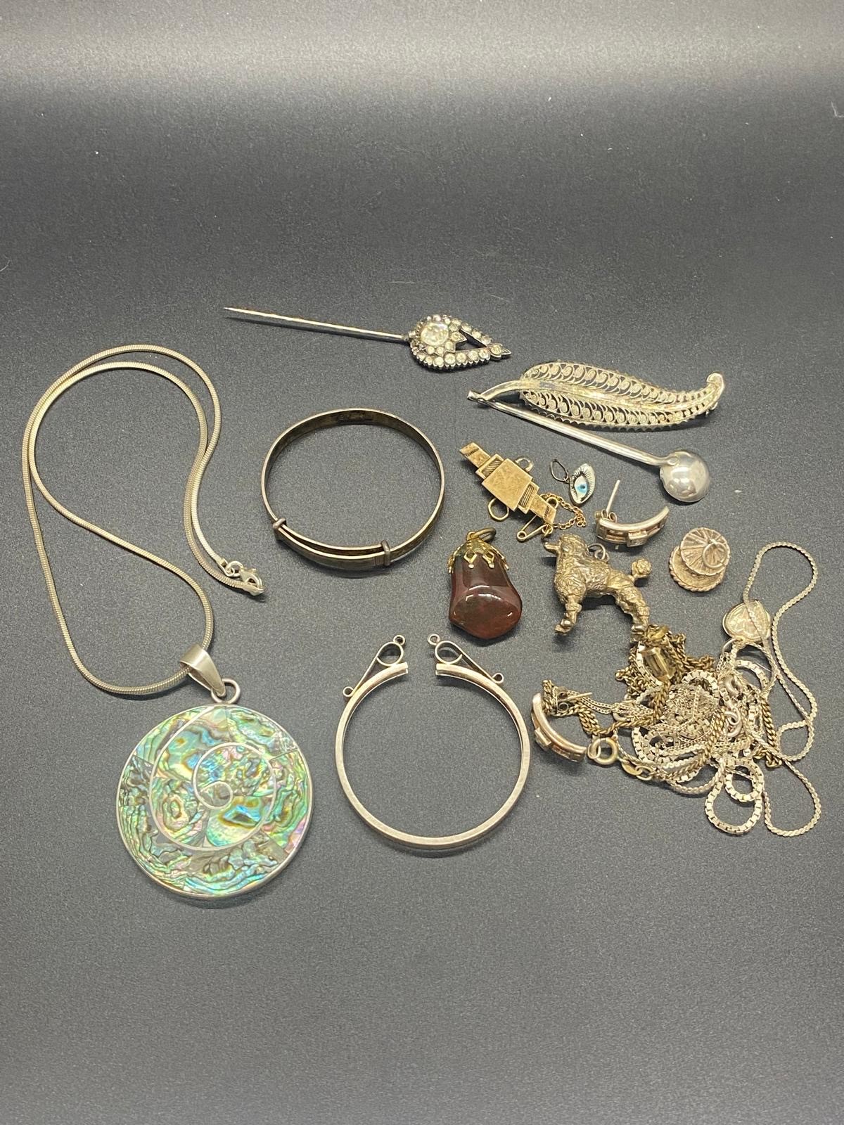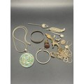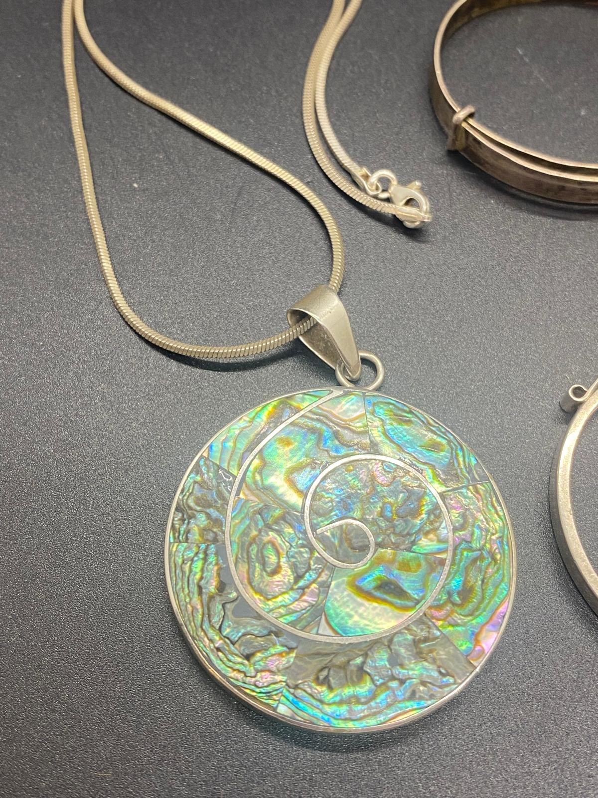 Selection of silver jewellery to include silver and abalone necklace and leaf brooch etc. 85g