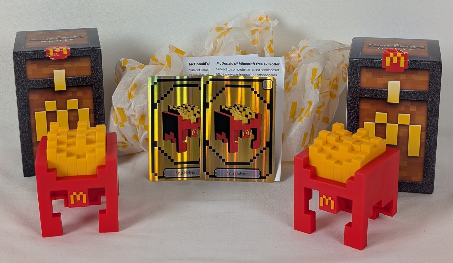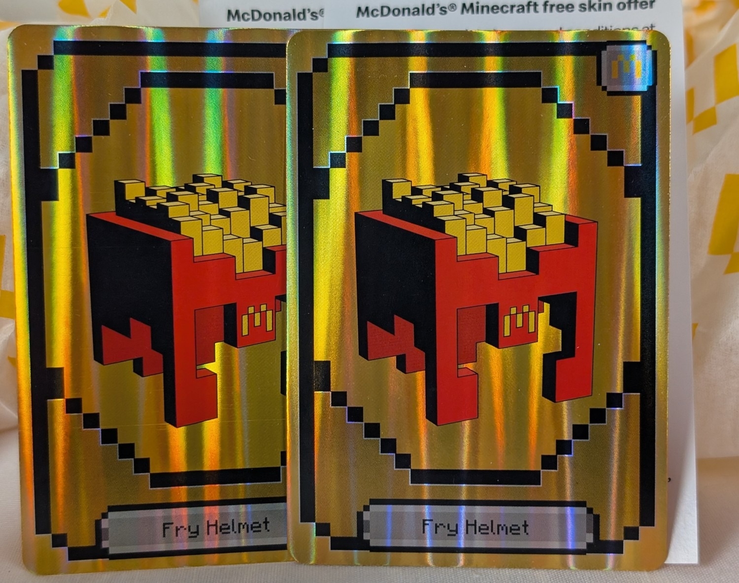2 Mcdonalds Minecraft Movie "Fry Helmet" toys, complete with box and unused code cards.