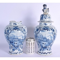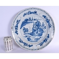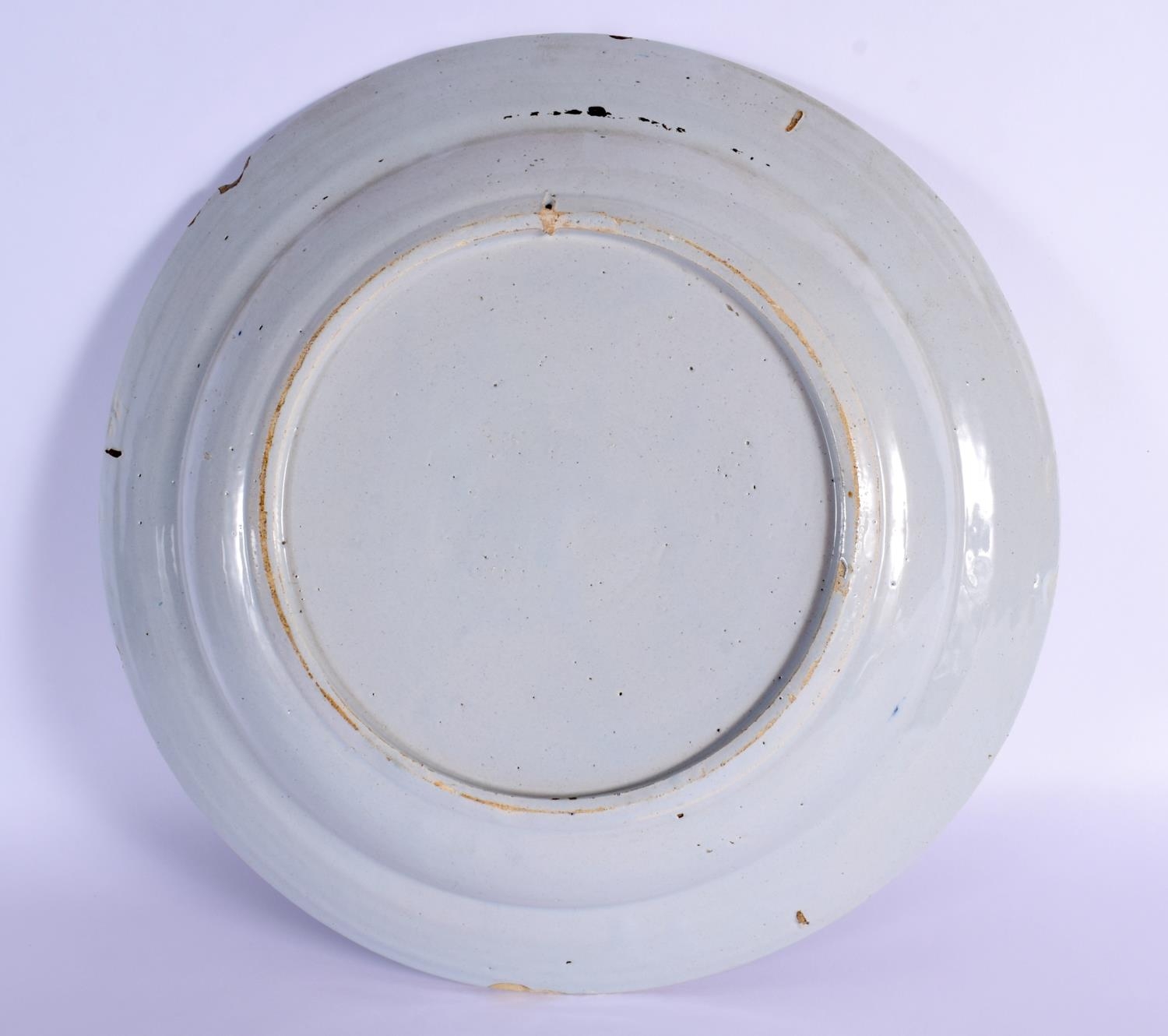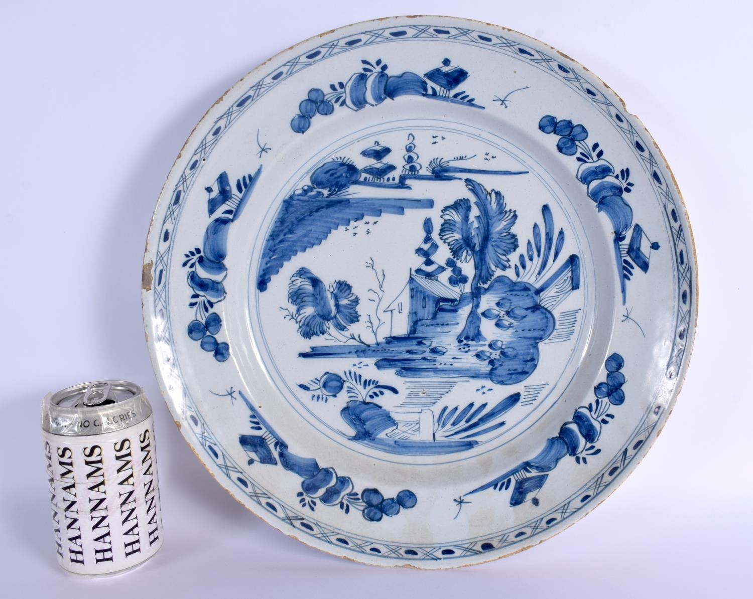 A LARGE 18TH CENTURY DELFT BLUE AND WHITE TIN GLAZED CHARGER painted with landscapes. 34 cm diameter.