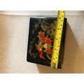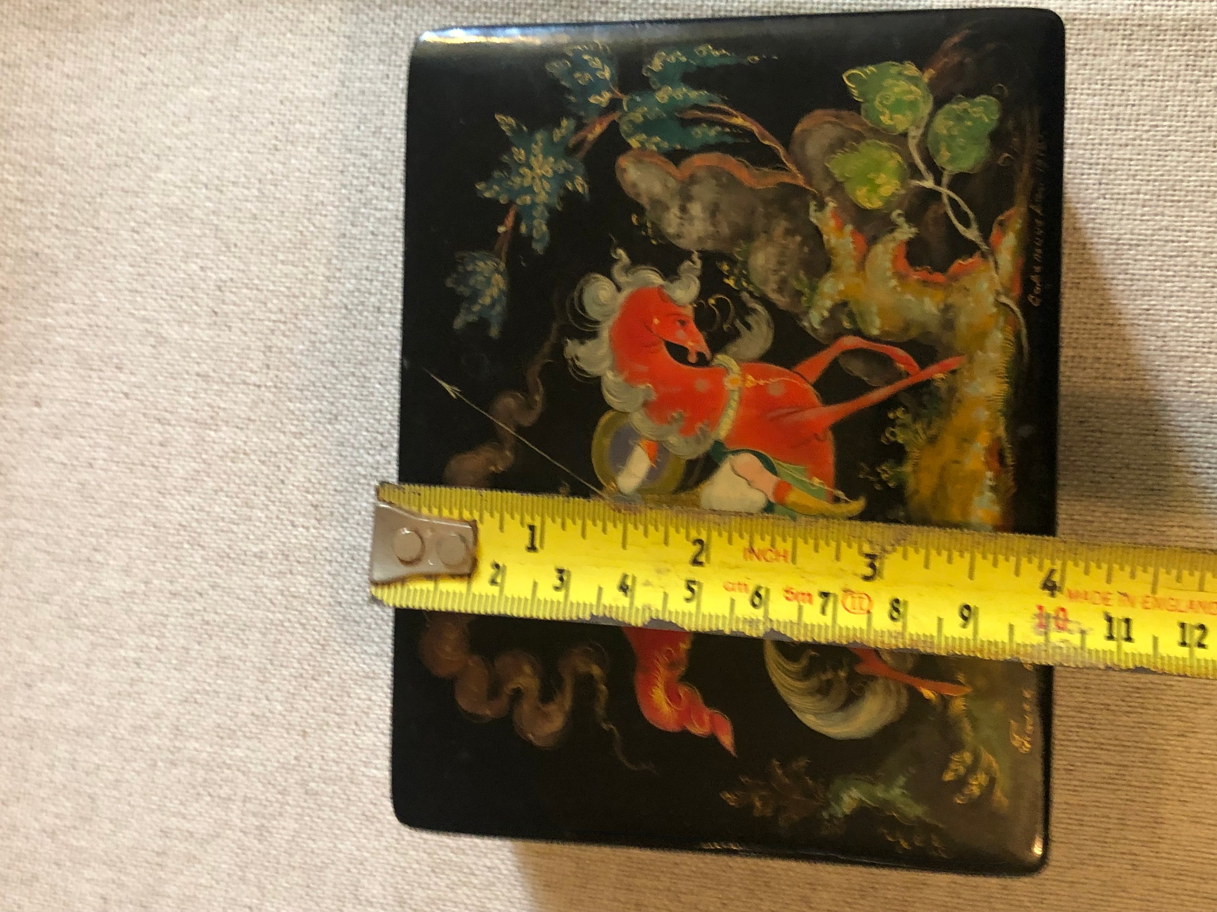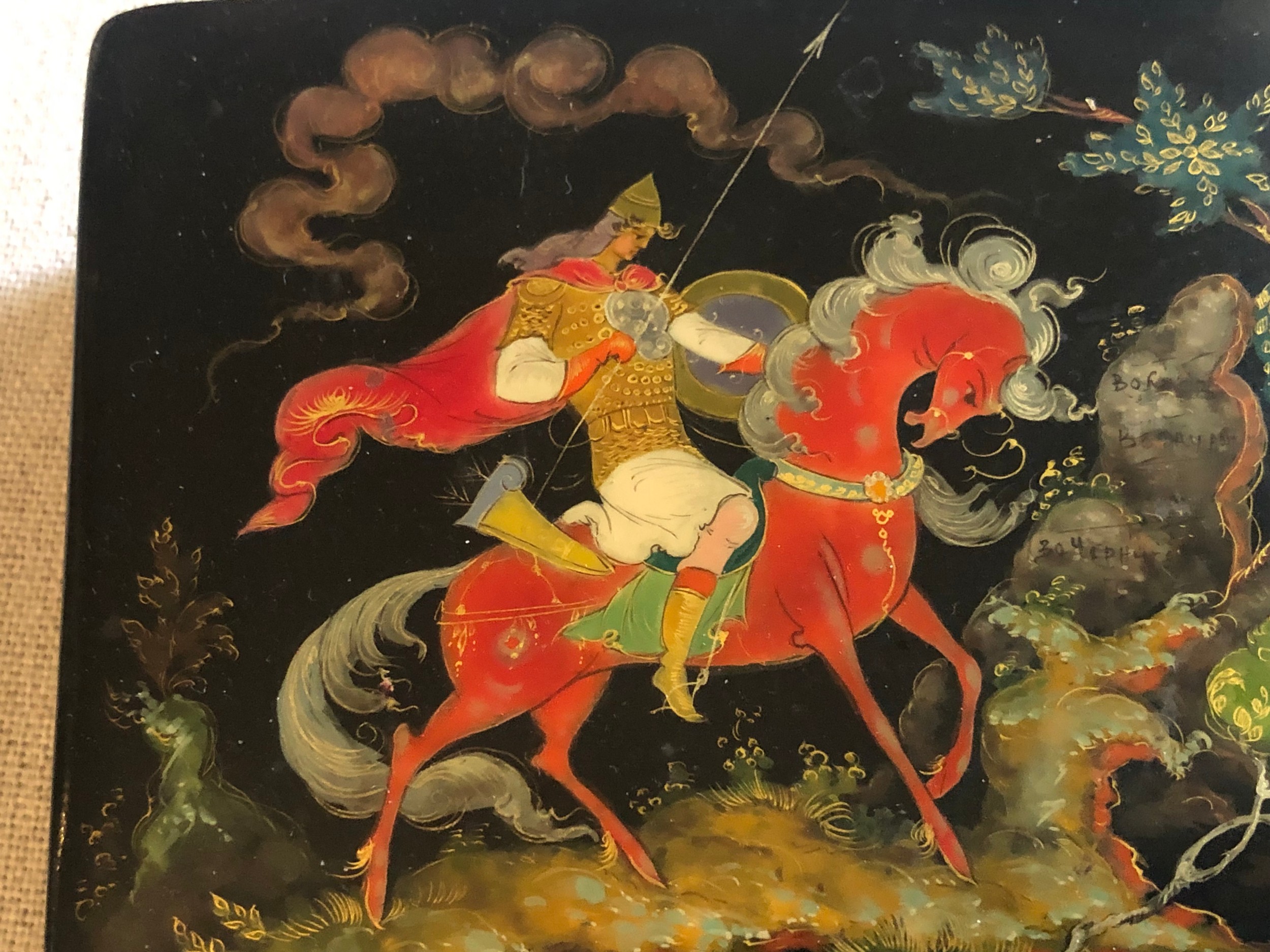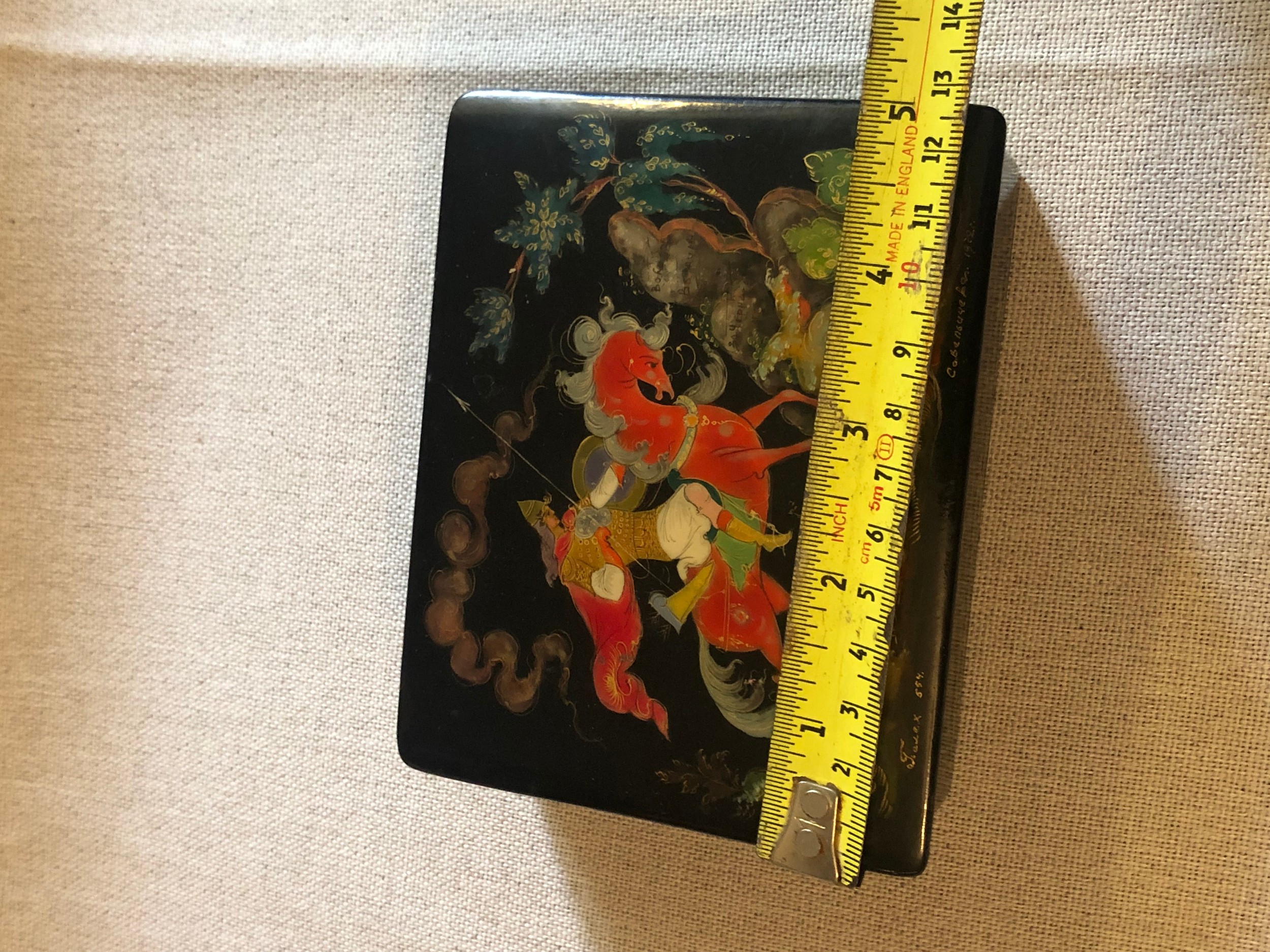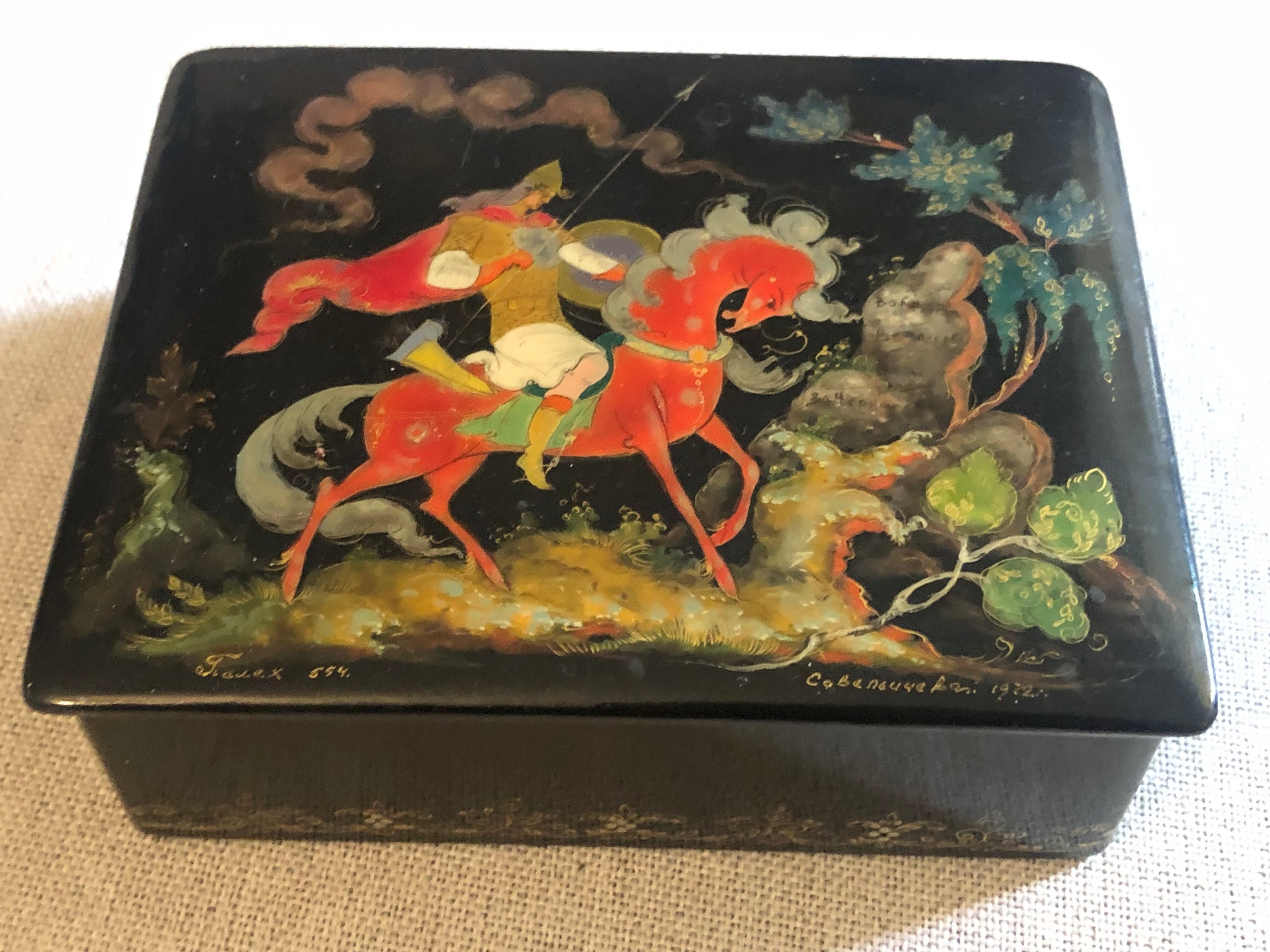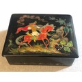 A beautiful Palekh Russian lacquered painted cigarette box with warrior riding a horse in full armour. Signed and dated 1972.