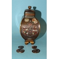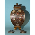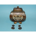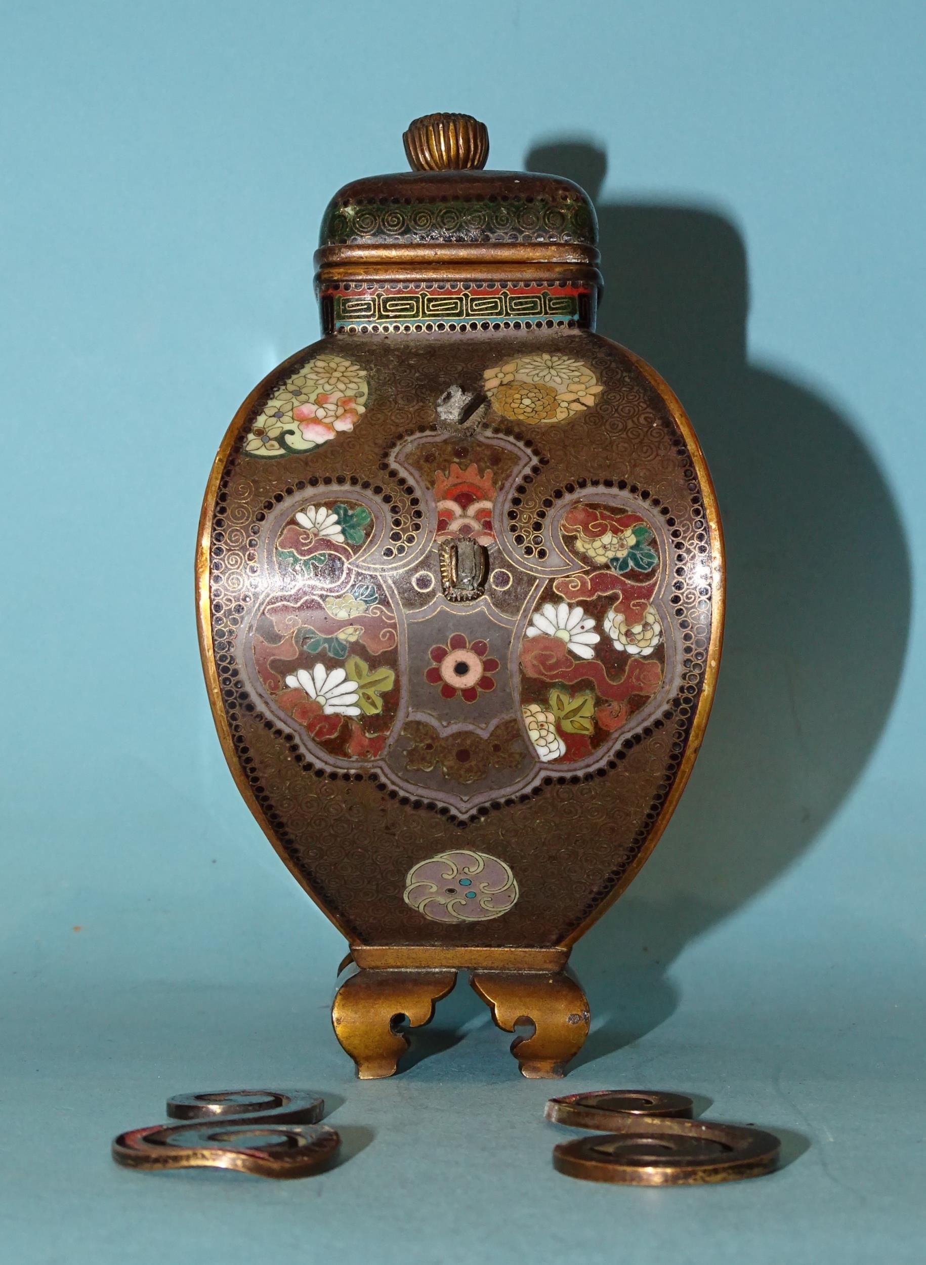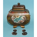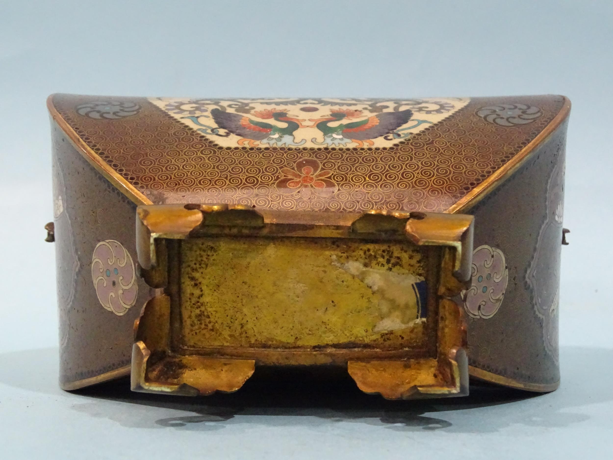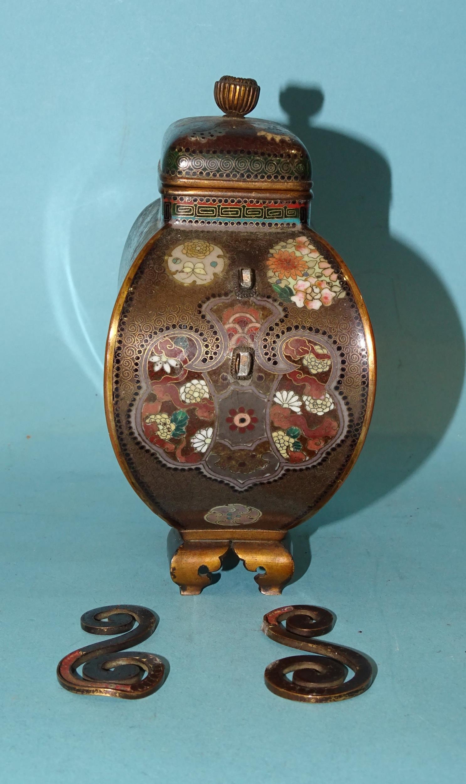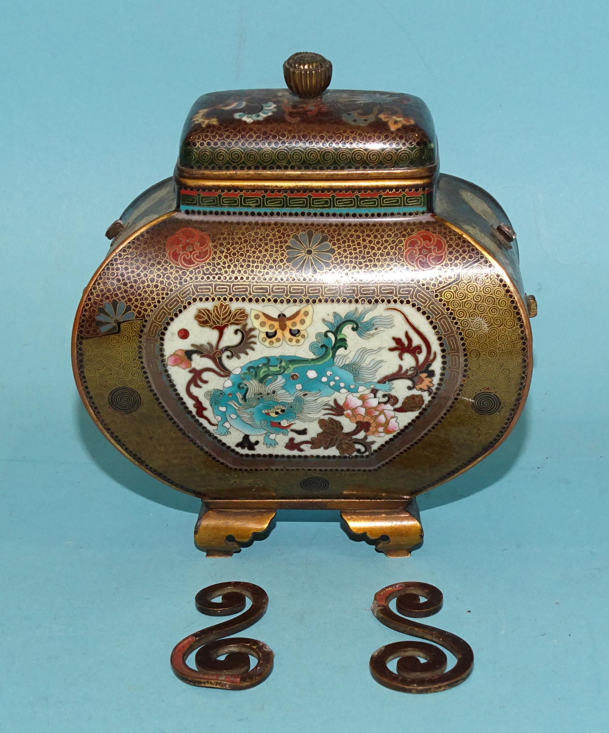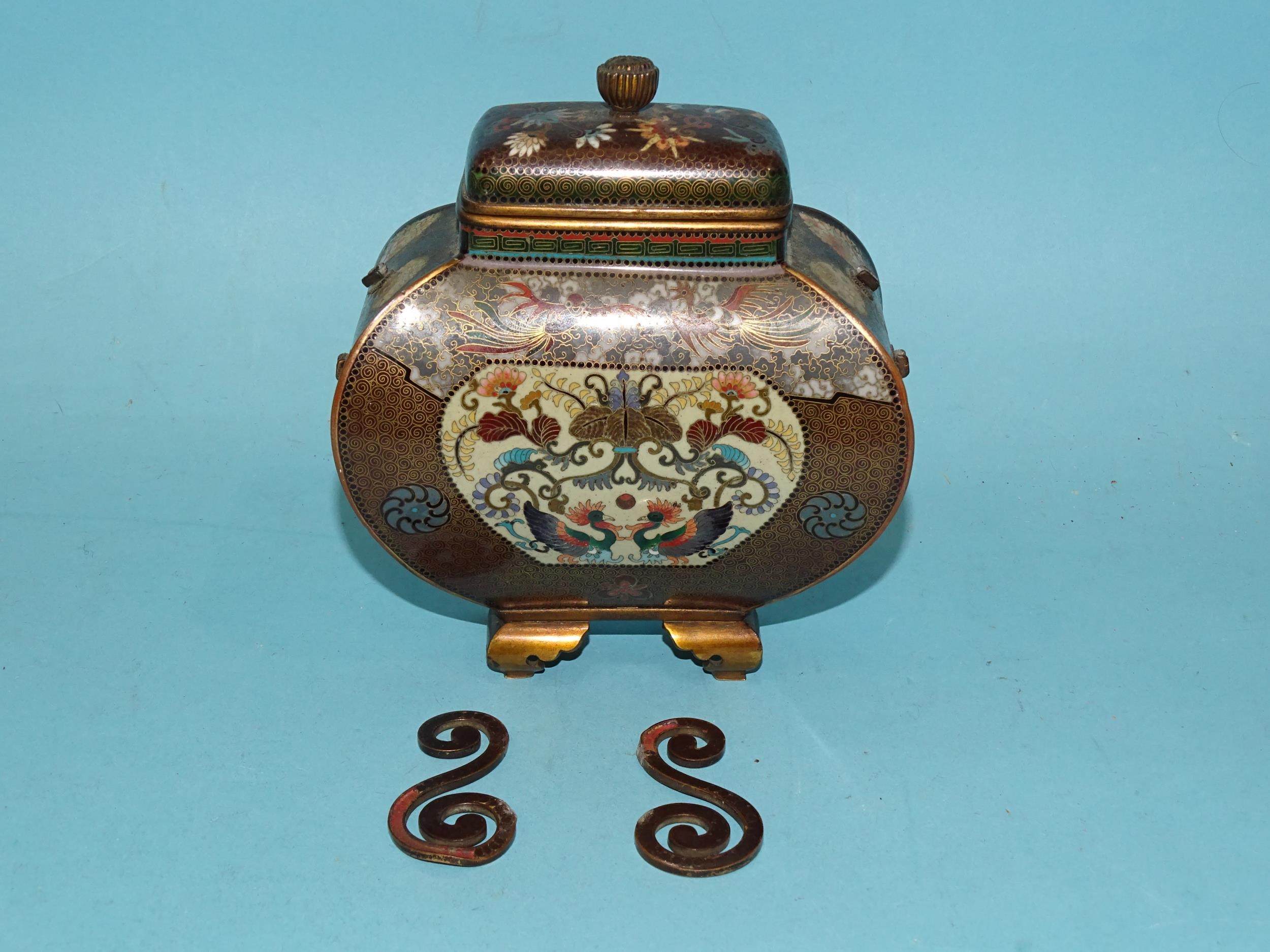 A small Japanese cloisonné enamel vase and cover of four-sided bombe shape, on gilt metal bracket feet, the oblong cover with bud finial, scroll handles detached and damaged, decorated overall with exotic birds, foliate designs and a dragon, within a ground of dense scroll-work, 14cm high.