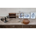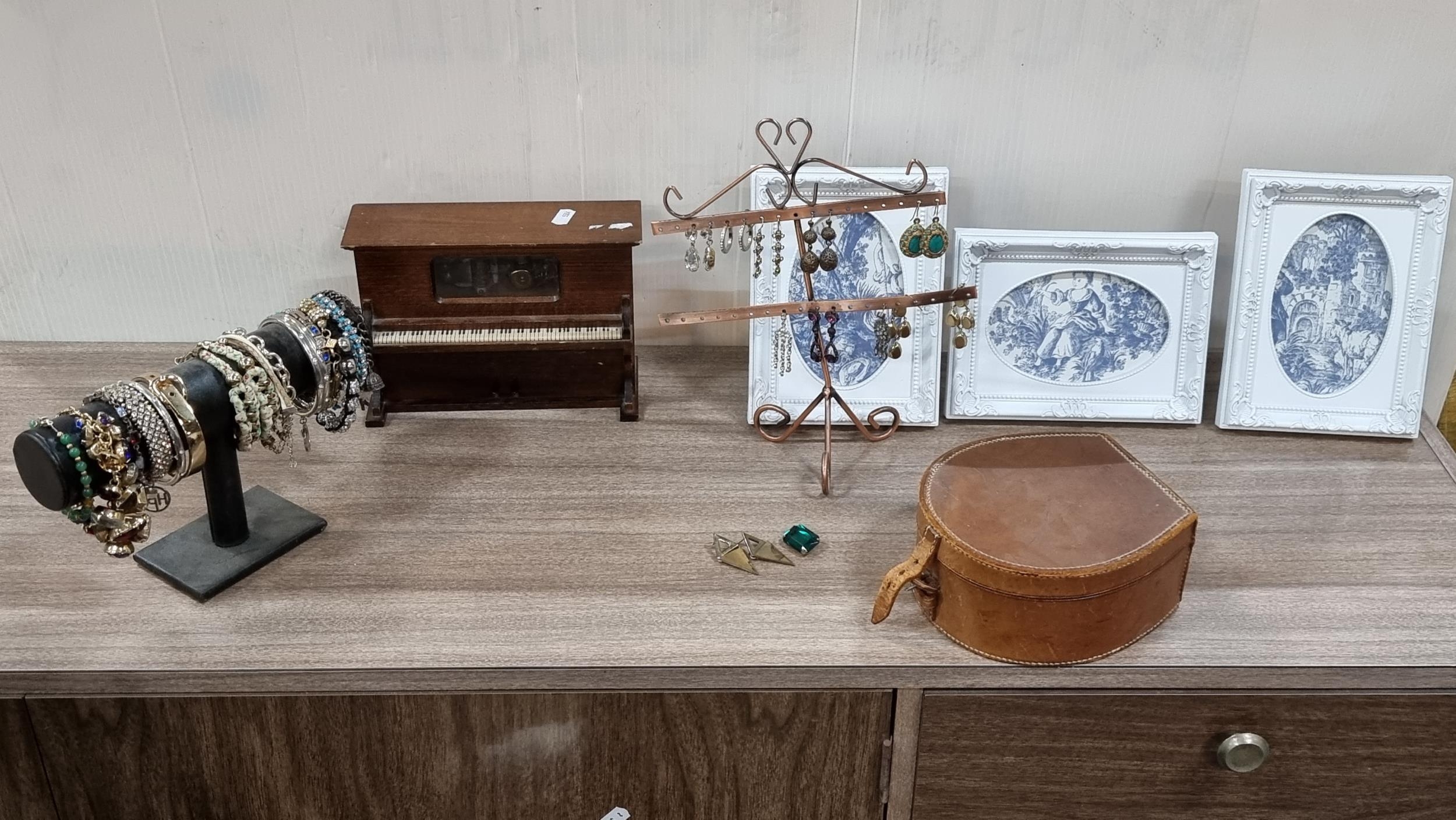 A mixed lot including a nice selection of quality vintage pieces of costume jewellery, three new photo frames and a Swiss made music box in the form of a miniature upright piano and a leather round jewellery box.