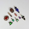 A selection of jewellery, including an organically shaped lapis lazuli pendant, stamped ‘925’ 8cm long, an amethyst cabochon pendant, 2.5cm long, a banded agate pendant, 5cm wide, and seven further pendants and brooches, gross weight 112gms (10)