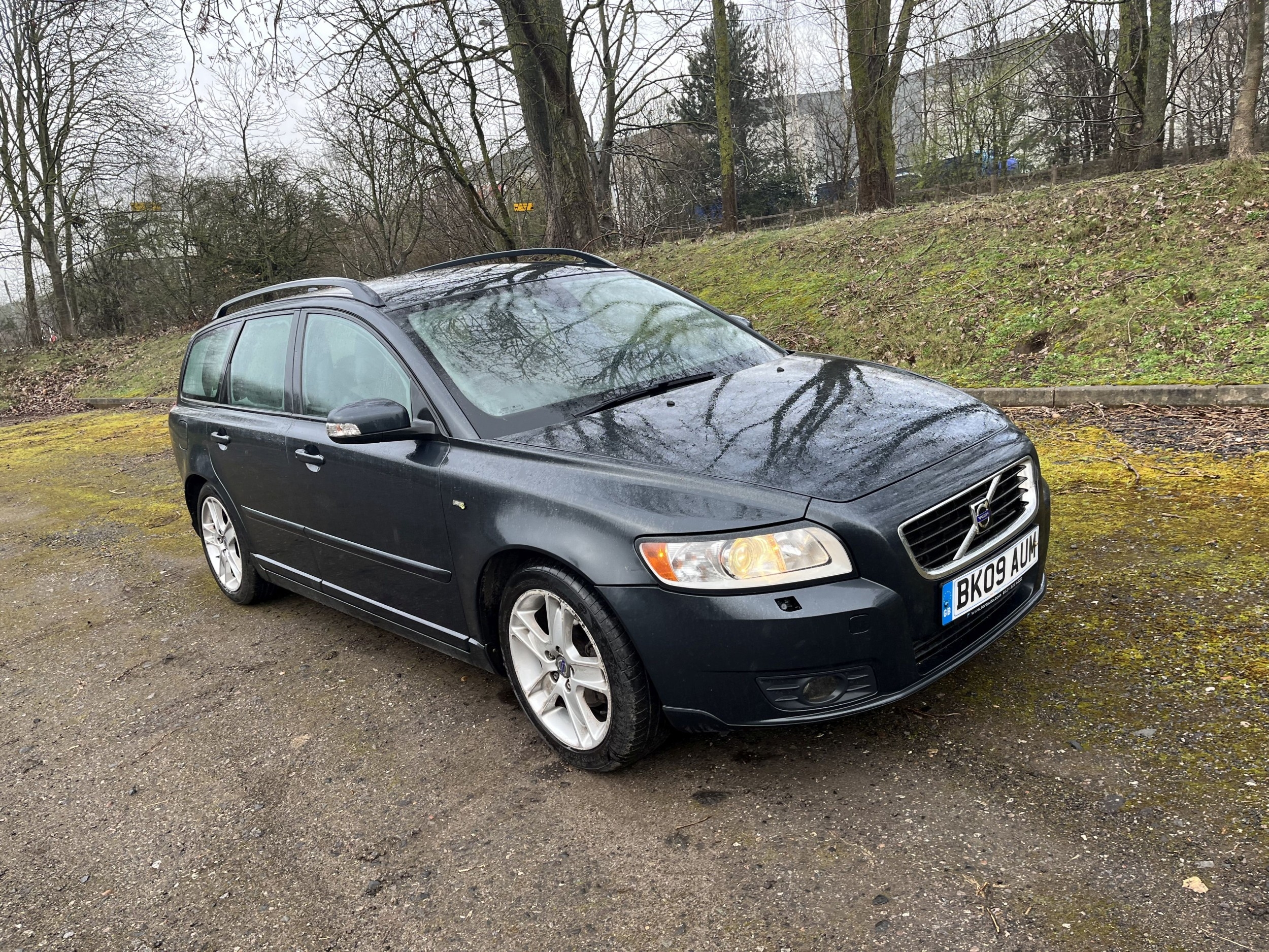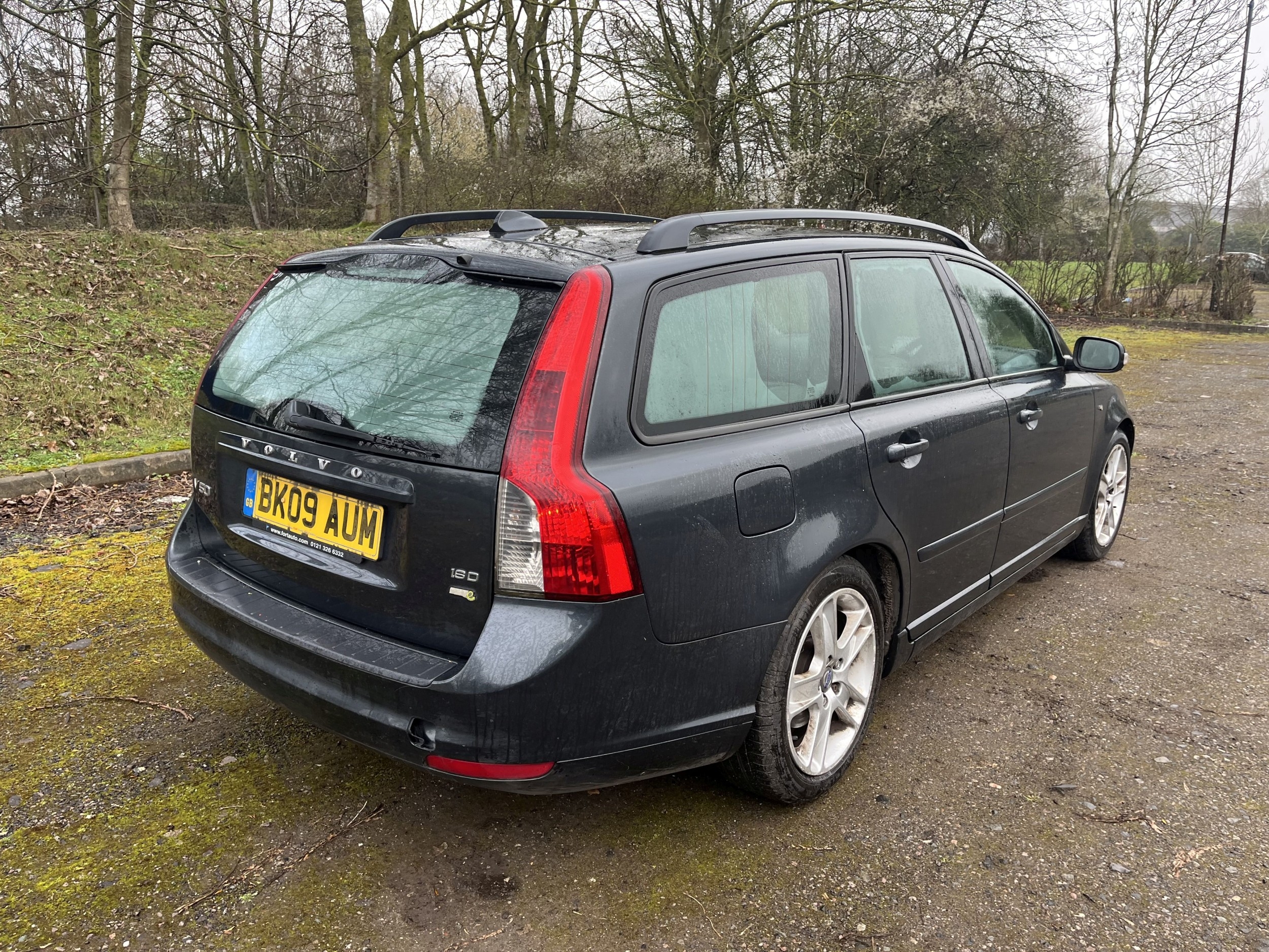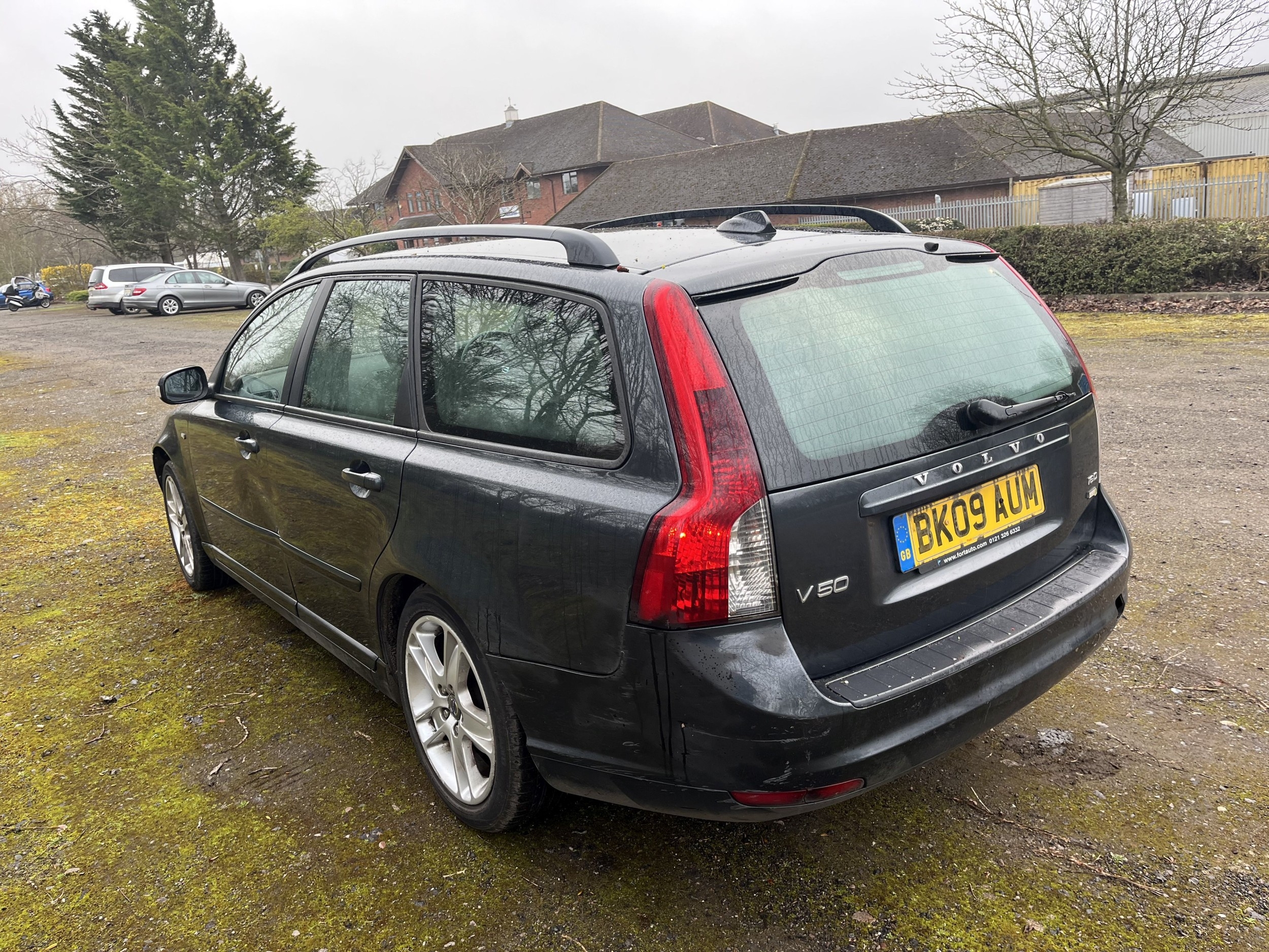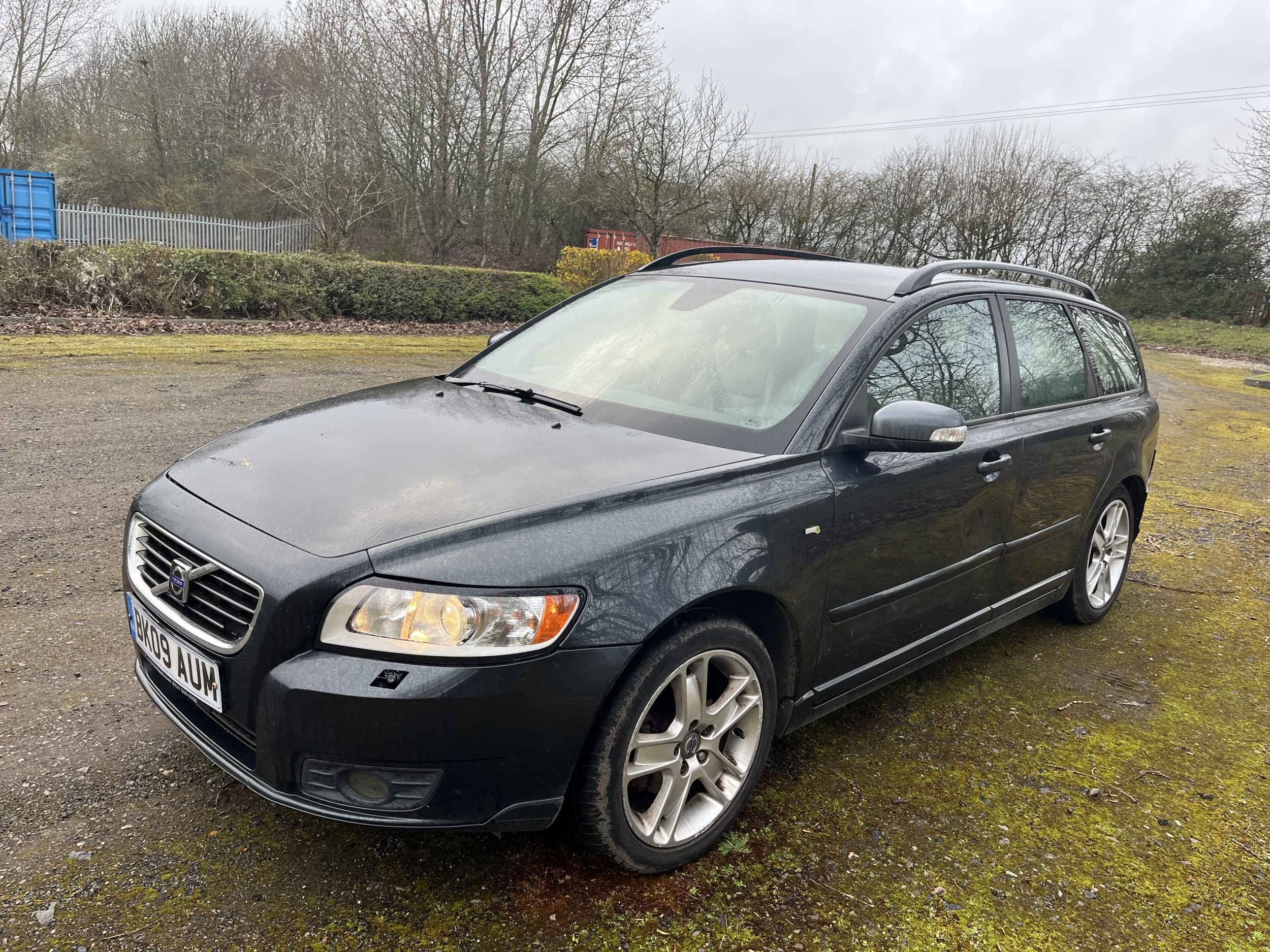 A 2009 VOLVO V50 DRIVE FIVE DOOR ESTATE CAR in charcoal grey with 1.6 litre diesel engine, five speed manual gearbox, grey leather interior, Reg: BK09 AUM, odometer reads 233018 miles (unwarranted), with v5c, one key fob, Condition Report: starts and drives, interior in fair order, no obvious rips or tears but crazing to leather, dent to near side front and rear doors, headlight washer covers missing, damage to rear bumper. (PLEASE NOTE: BUYERS PREMIUM IS CHARGED AT 10% + VAT ON THIS LOT PLUS ANY ONLINE PLATFORM FEE WILL APPLY)