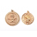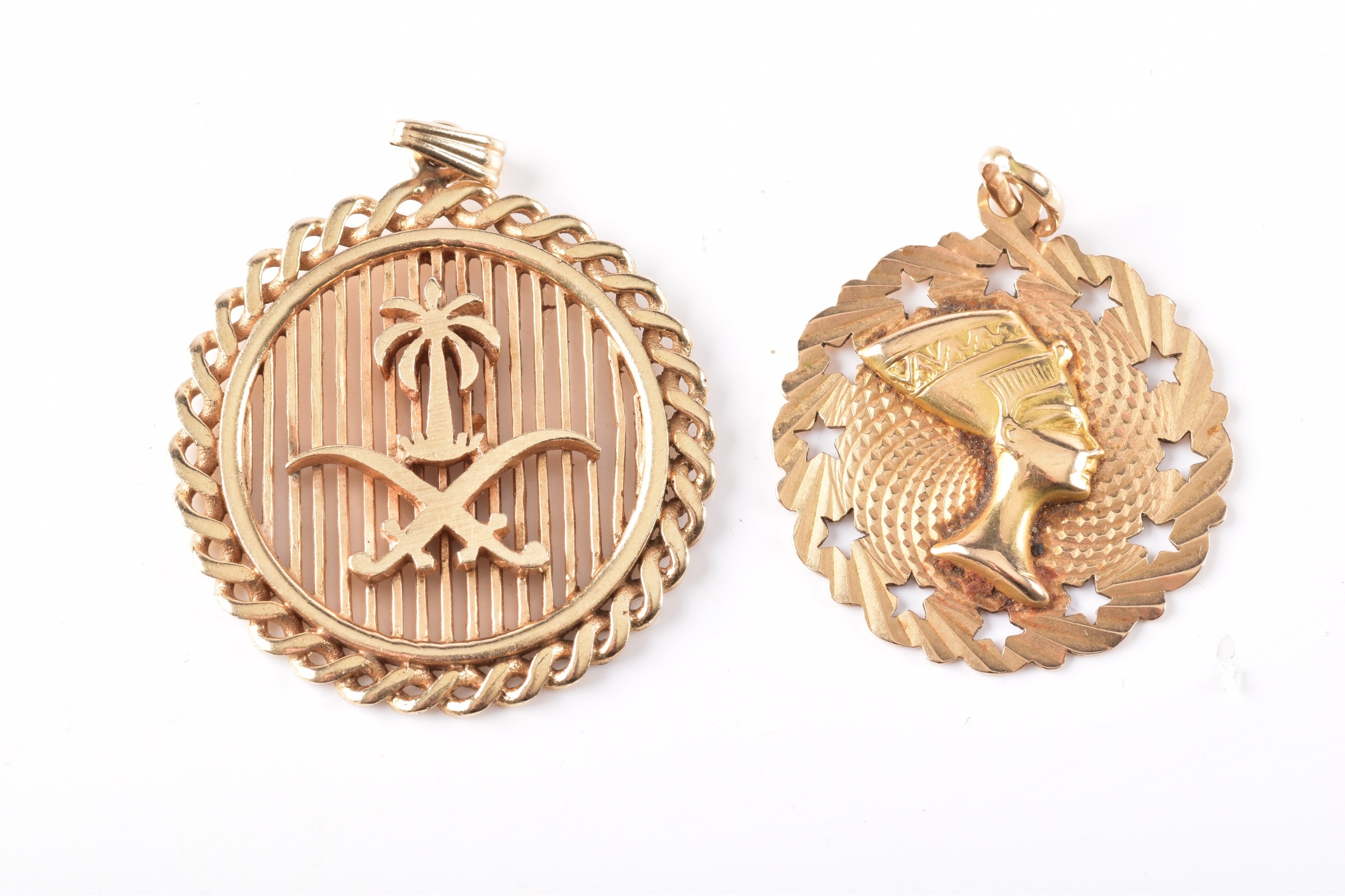 Two gold pendants, including a yellow gold pendant of circular form with rope-twist border enclosing the Saudi Arabian national emblem, 2.8 cm diameter, the other a 18ct yellow gold Nefertiti pendant with star cut-out border, 2.3 cm diameter, both with suspension loops. (2)