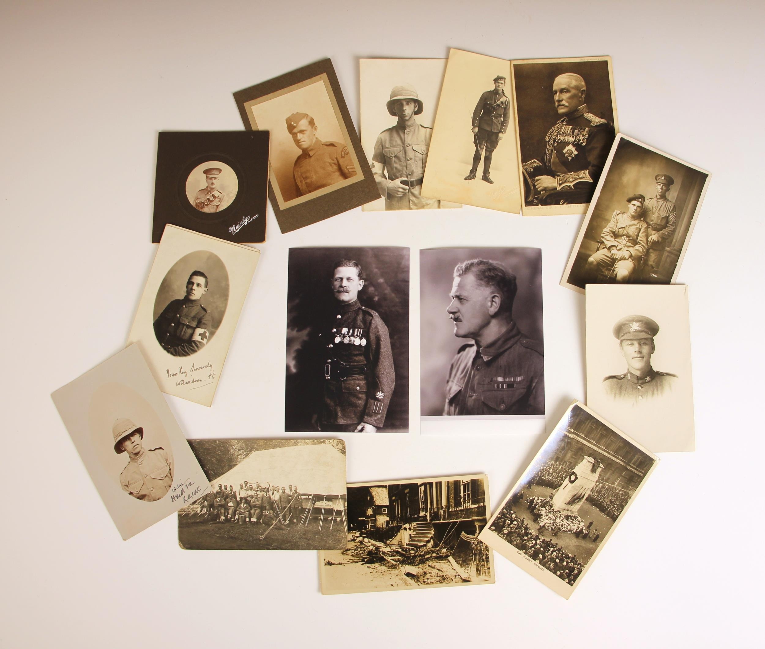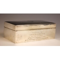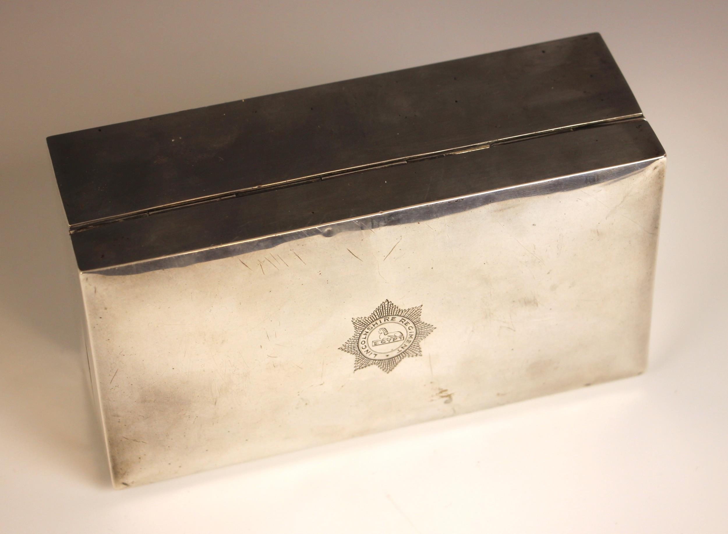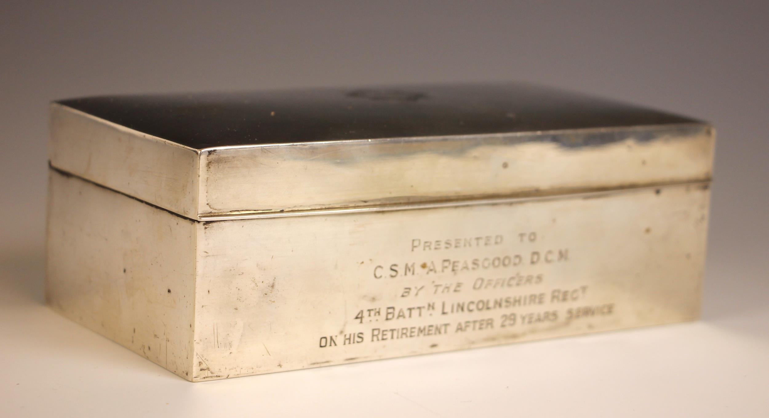 MILITARY INTEREST: A George V silver cigarette box, Sanders & Mackenzie, Birmingham 1928, of rectangular form, the front engraved 'Presented To C.S.M. A. Peasgood D.C.M. / By The Officers / 4th Battn Lincolnshire Regt / On His Retirement After 29 Years Service', the hinged cover engraved with the regimental badge, 16.5cm W x 9cm D x 5.5cm H; with Company Sergeant Major Augustus Peasgood's silver mounted swagger stick, 70.5cm long; his Sam Browne belt and sword belt; his badges and insignia; his compass dated 1918 with War Office broad arrow mark; two photographs of C.S.M. Peasgood; a quantity of further military cap badges and insignia for other regiments; and a selection of portrait cards of other military personnel (Qty)