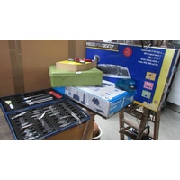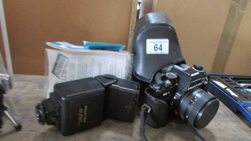 A Praktica camera with flash gun.